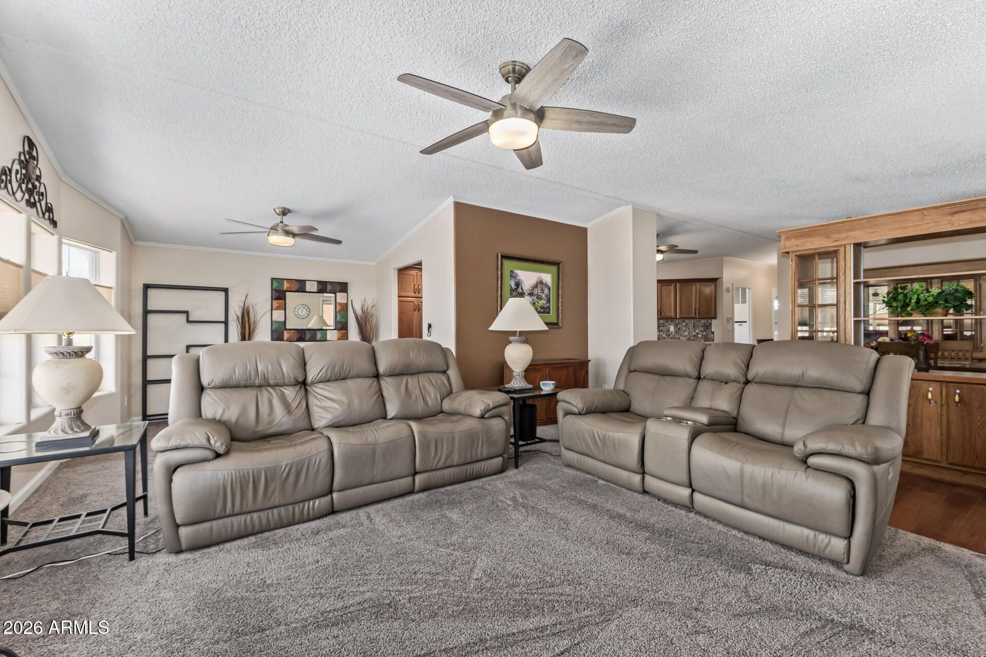 This well maintained 2 bedroom manufactured home features a large living room, formal dining area, additional den/office space, and an enclosed Arizona room providing plenty of space for relaxing or entertaining. The kitchen was updated with all new cabinets featuring soft close doors & drawers and quartz countertops. The spacious primary suite includes a steam and jetted tub/shower for a spa-like experience. Exterior features include a stuccoed finish, a front patio with outdoor shades for added privacy and comfort, and an extended 2 car garage with an extra storage room with direct golf cart access. Enjoy low-maintenance living with access to golf, clubhouse, pools, fitness center, pickleball, and many social activities that make Sun Lakes a premier active adult community.