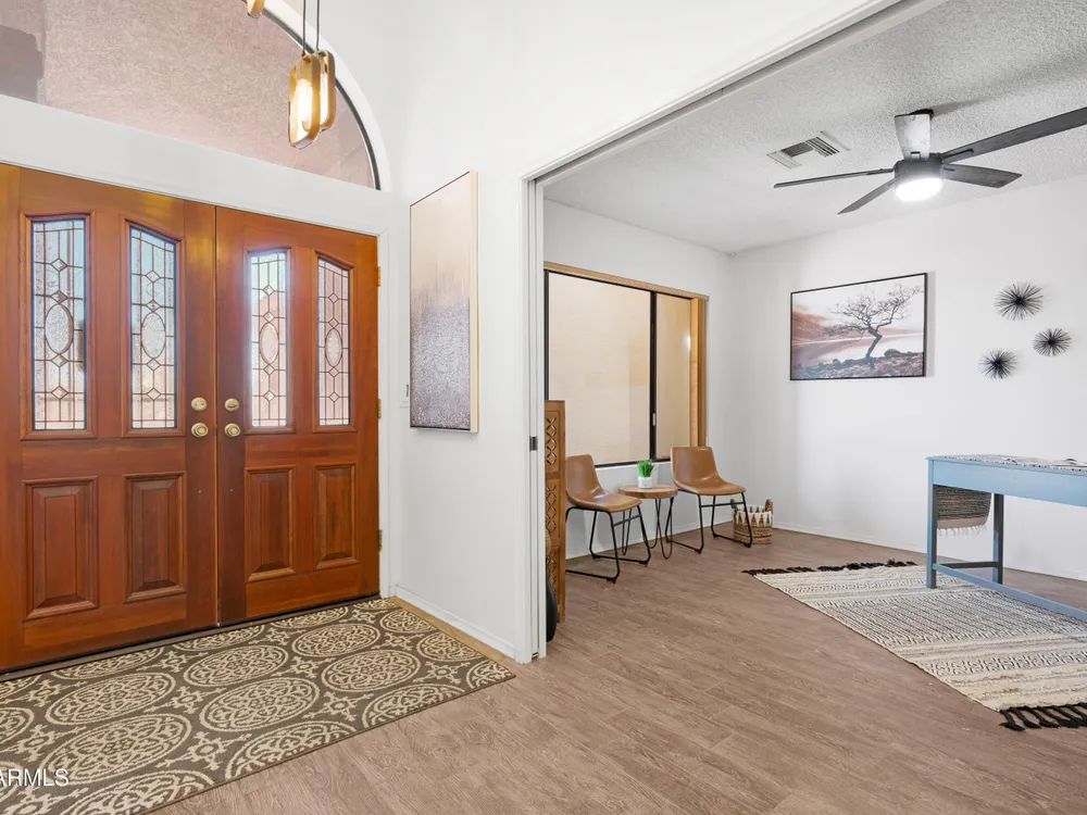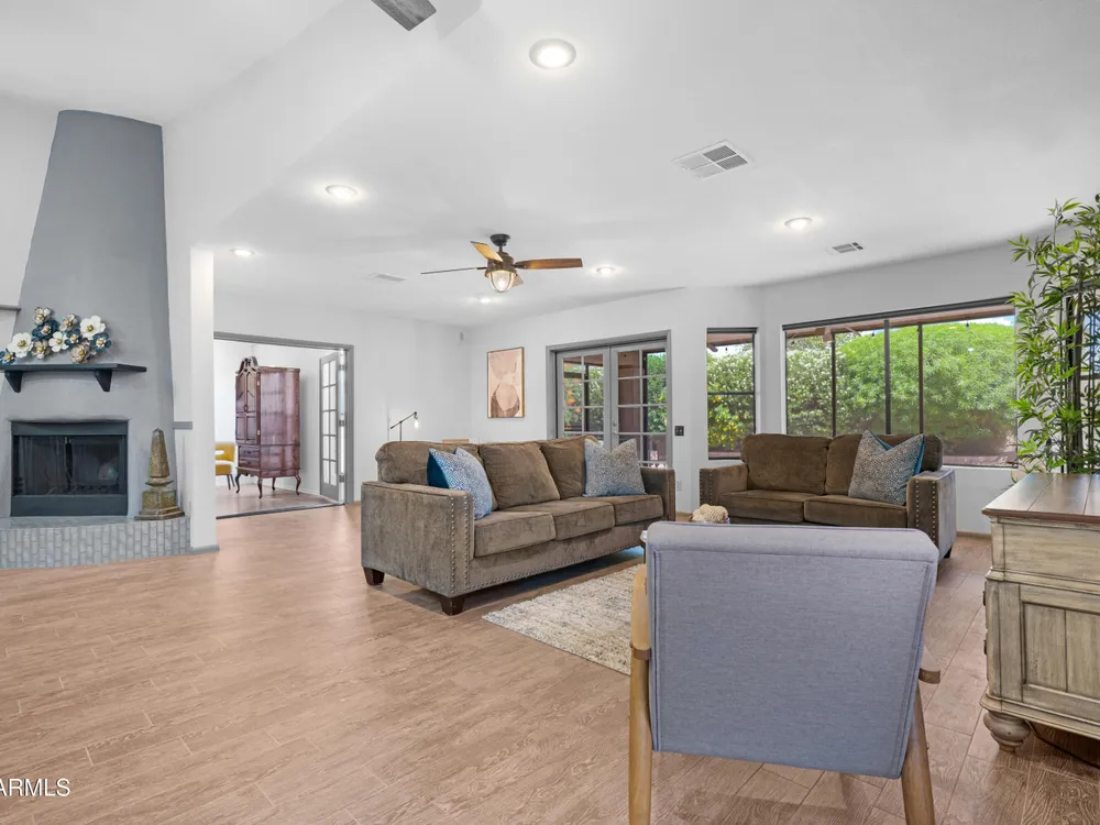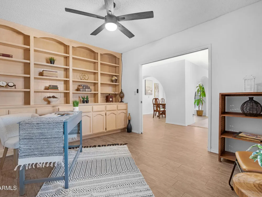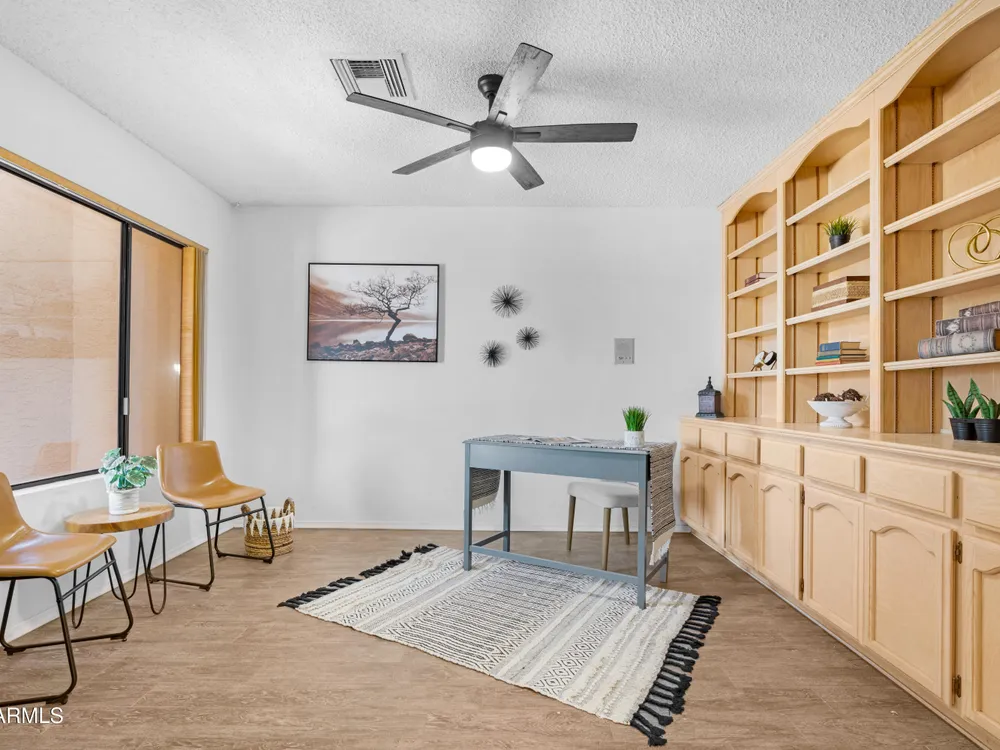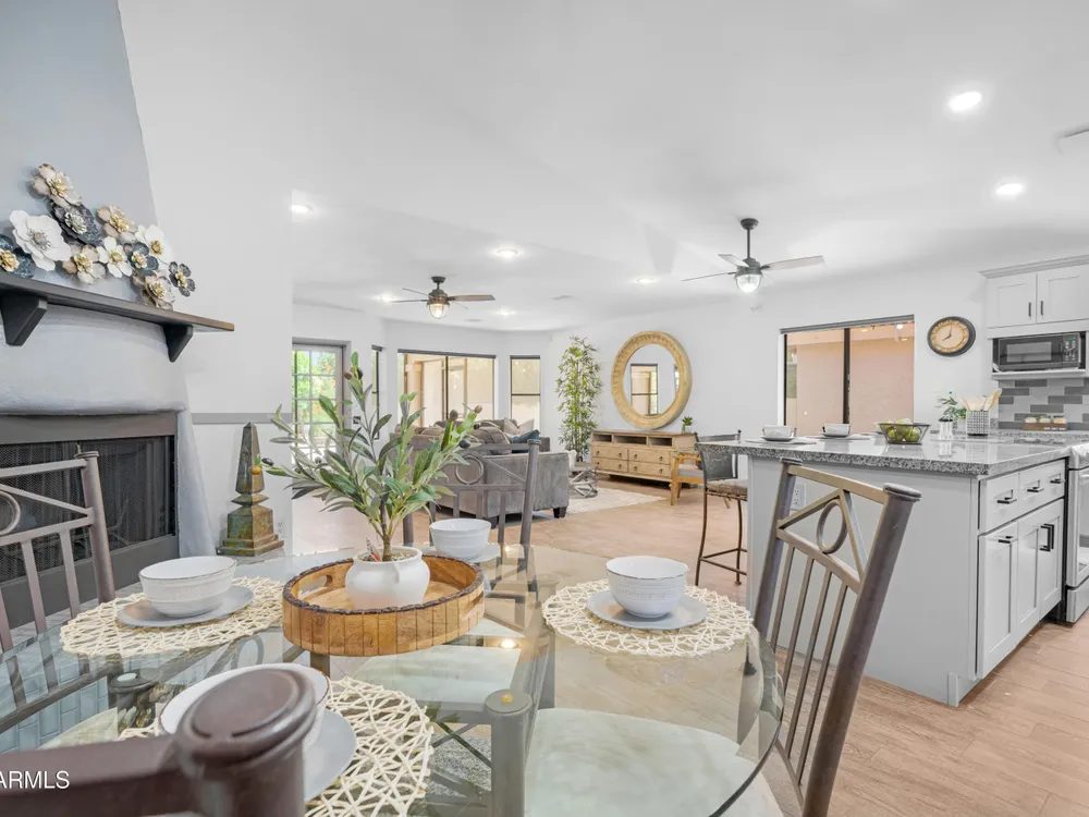 Welcome to the Active Adult Community of Sun Lakes, where comfort and style meet resort-style living! The Posada floor plan is a 2 bedroom + large den, 2 bath home, filled with thoughtful updates and energy efficiency thanks to solar panels. Step into the large front courtyard, a perfect spot for morning coffee or evening relaxation. Inside, you'll love the formal living and dining rooms, plus a remodeled open-concept kitchen featuring custom cabinetry, pull-out drawers, under-cabinet lighting, and a walk-in pantry. The kitchen opens to a huge family room with skylights and a cozy fireplace in the breakfast nook. The oversized primary suite offers its own sitting area, remodeled bathroom, and generous walk-in closet. The guest bedroom and updated bath provide comfortable accommodati