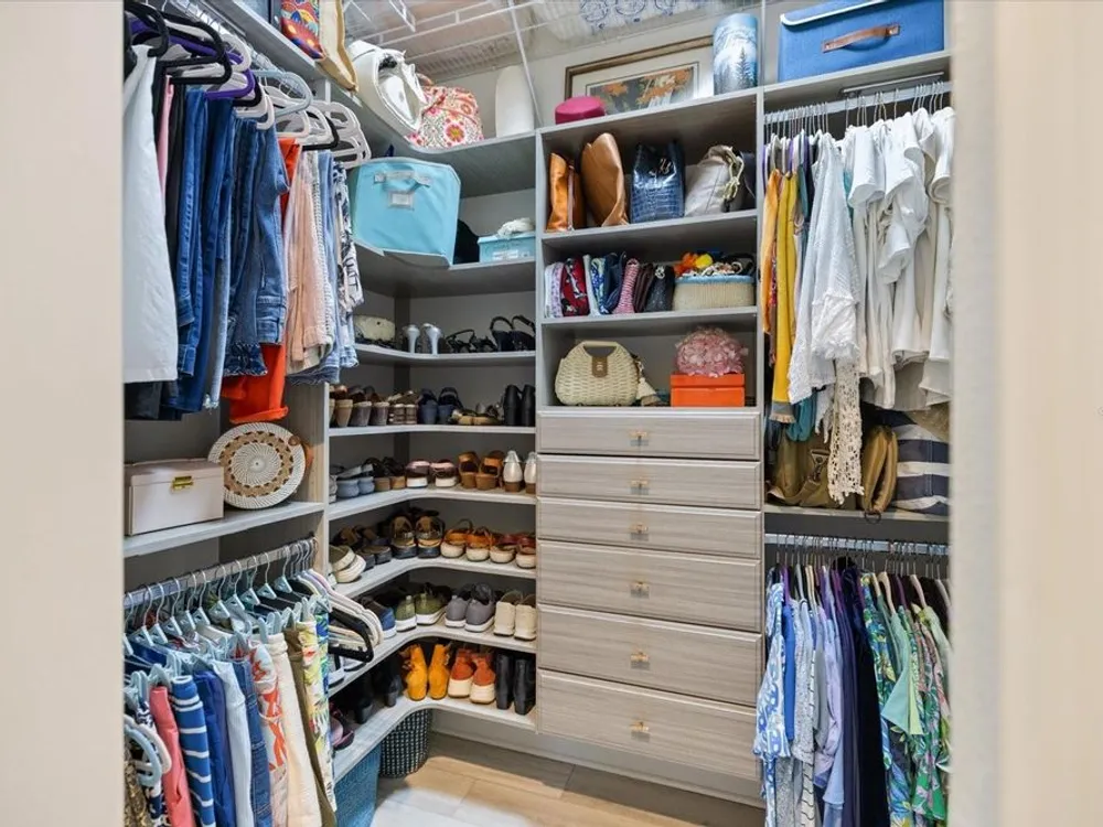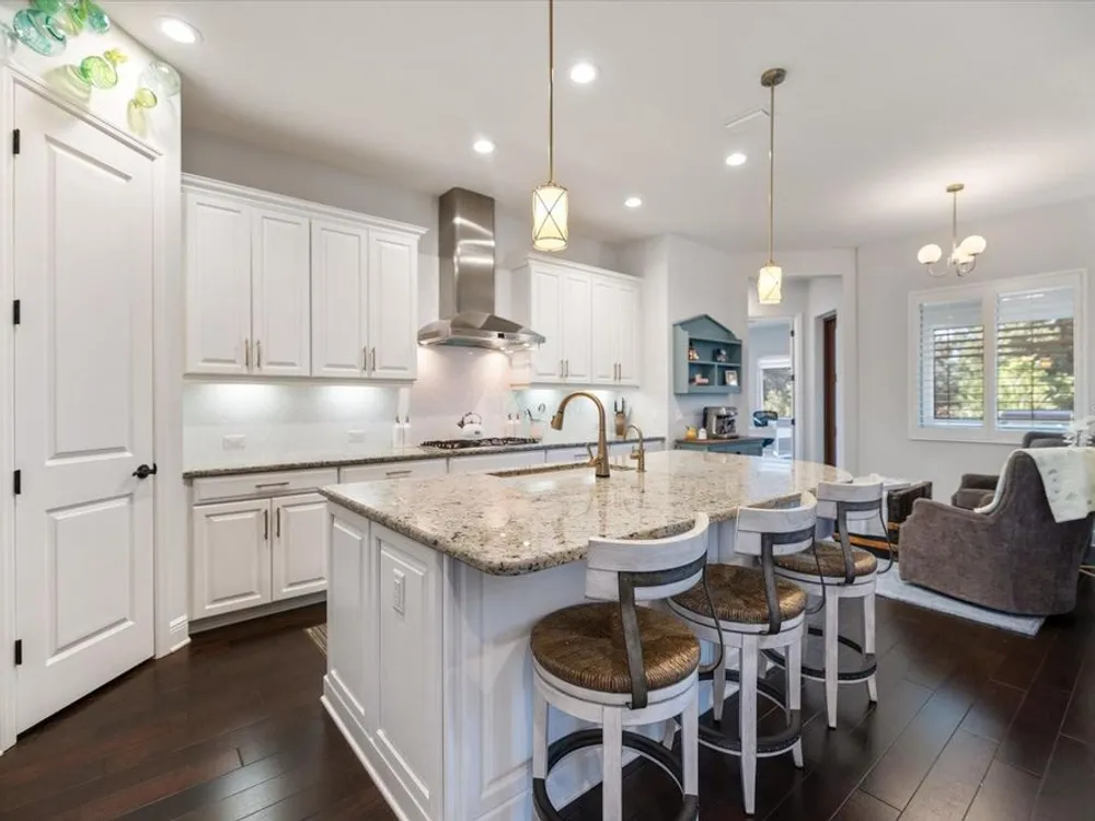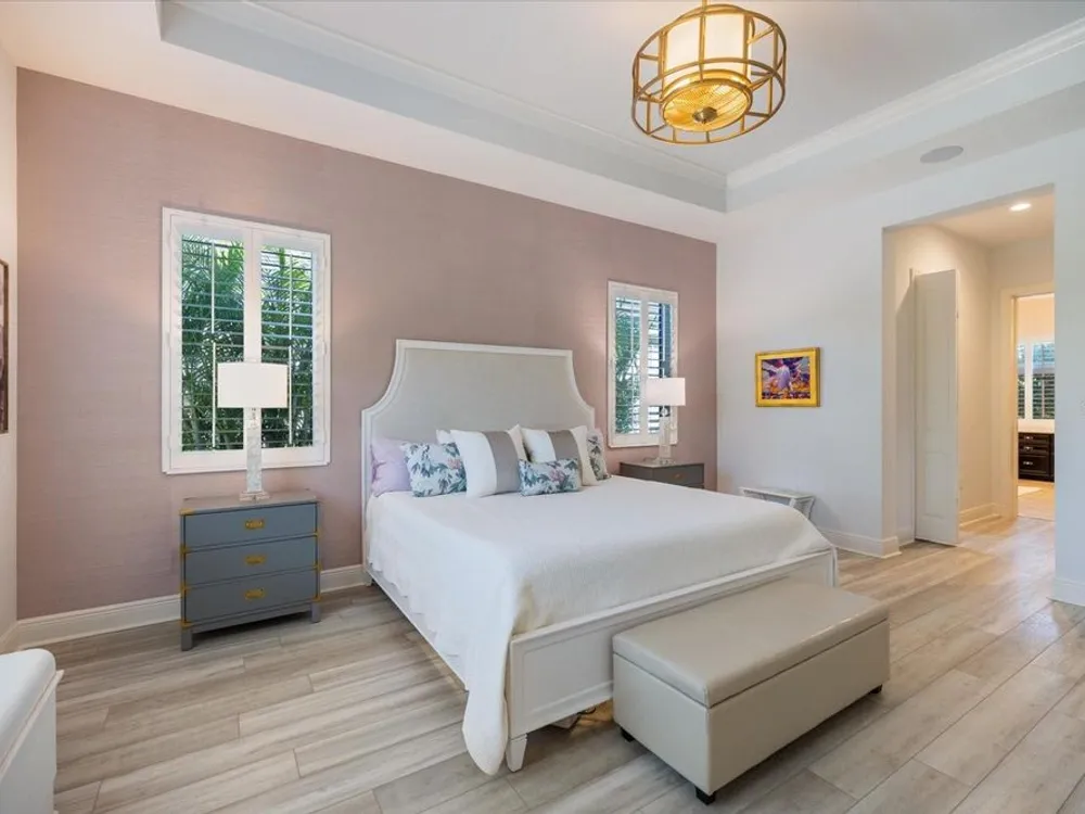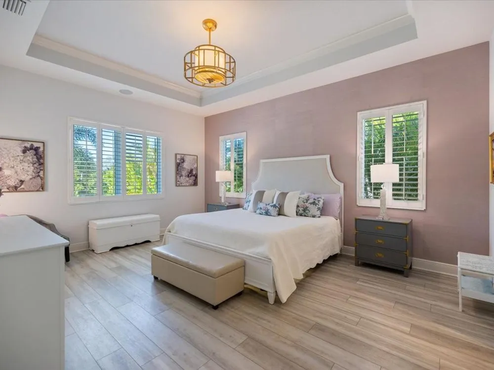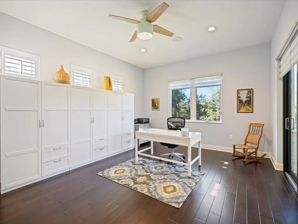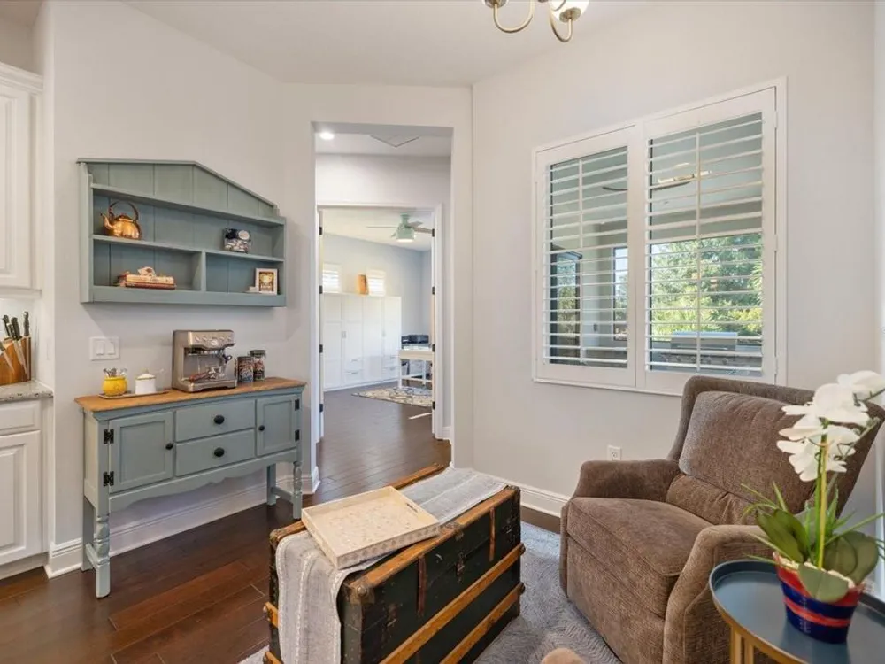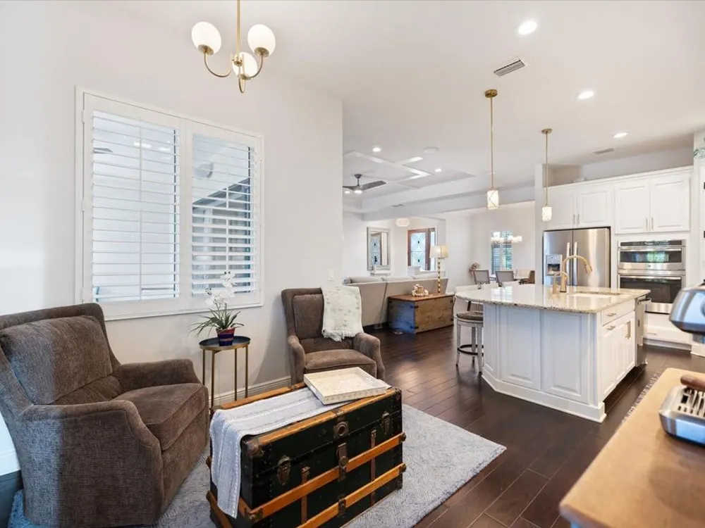 - Ceiling Fan(s), Eat-in Kitchen, High Ceilings, Kitchen/Family Room Combo, Open Floorplan, Main Level Primary, Solid-Wood Cabinets, Stone Counters, Tray Ceiling(s), Walk-In Closet(s), Window Treatments