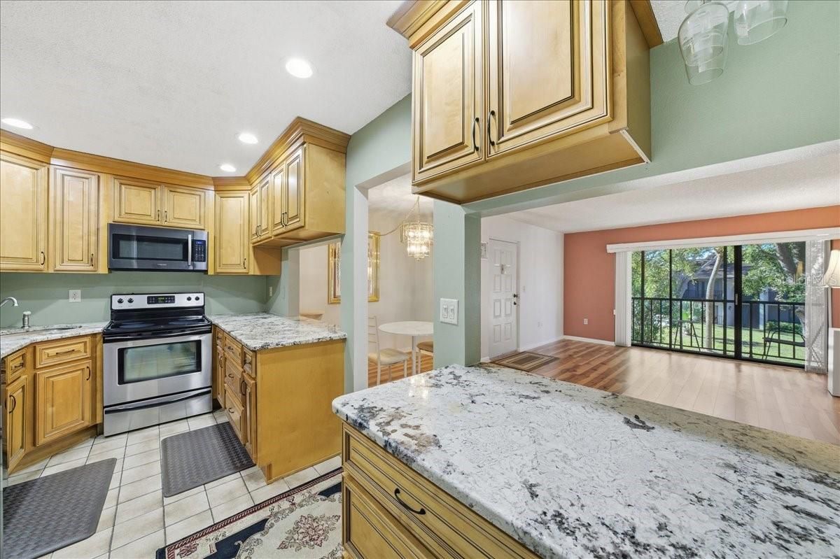 Welcome to this beautifully updated second-floor condo in Pine Ridge at Palm Harbor, a desirable 55+ active retirement community offering maintenance-free, resort-style living. Stylish wide-plank laminate flooring and crisp, clean lines invite you into the main living areas. The kitchen has been tastefully renovated with solid wood cabinetry featuring soft-close drawers and organizers, granite countertops, stainless steel appliances, recessed lighting, and pass-through windows that create an open feel, provide sightlines to the balcony beyond the living room, and connect to the dining area just off the kitchen. The screened and enclosed balcony overlooks a tranquil courtyard, creating an inviting outdoor space to enjoy morning coffee or evening breezes. Both bathrooms have been thoughtfully updated with custom vanities, tile flooring, mirrors, and modern lighting, with the primary bathroom finished with a granite countertop and an ensuite layout. Each bedroom offers a walk-in closet and comfortable neutral carpeting, while stylish raised-panel wood interior doors add a refined touch throughout. Additional highlights include Pella impact-rated double sliding windows installed in 2022 (excluding the patio slider and small dinette window), a newer HVAC system from 2020, an in-unit laundry closet with a stacked washer and dryer plus storage, and the added benefit of attic storage exclusive to second-floor residences. The condo also includes an assigned parking space. HOA fees cover roof maintenance, cable, internet, water, sewer, trash, exterior building care, and pest control. Residents enjoy a pet-friendly environment with walking paths surrounding a pond, along with amenities that include a heated resort-style pool and spa with loungers and shaded seating, a clubhouse, shuffleboard courts, and on-site property management. Ideally located in Palm Harbor just off the main thoroughfare of US-19, Pine Ridge offers convenient access to shopping, restaurants, medical offices, and golf courses, with proximity to Gulf beaches, parks, and the Pinellas Trail. Schedule your private tour today!