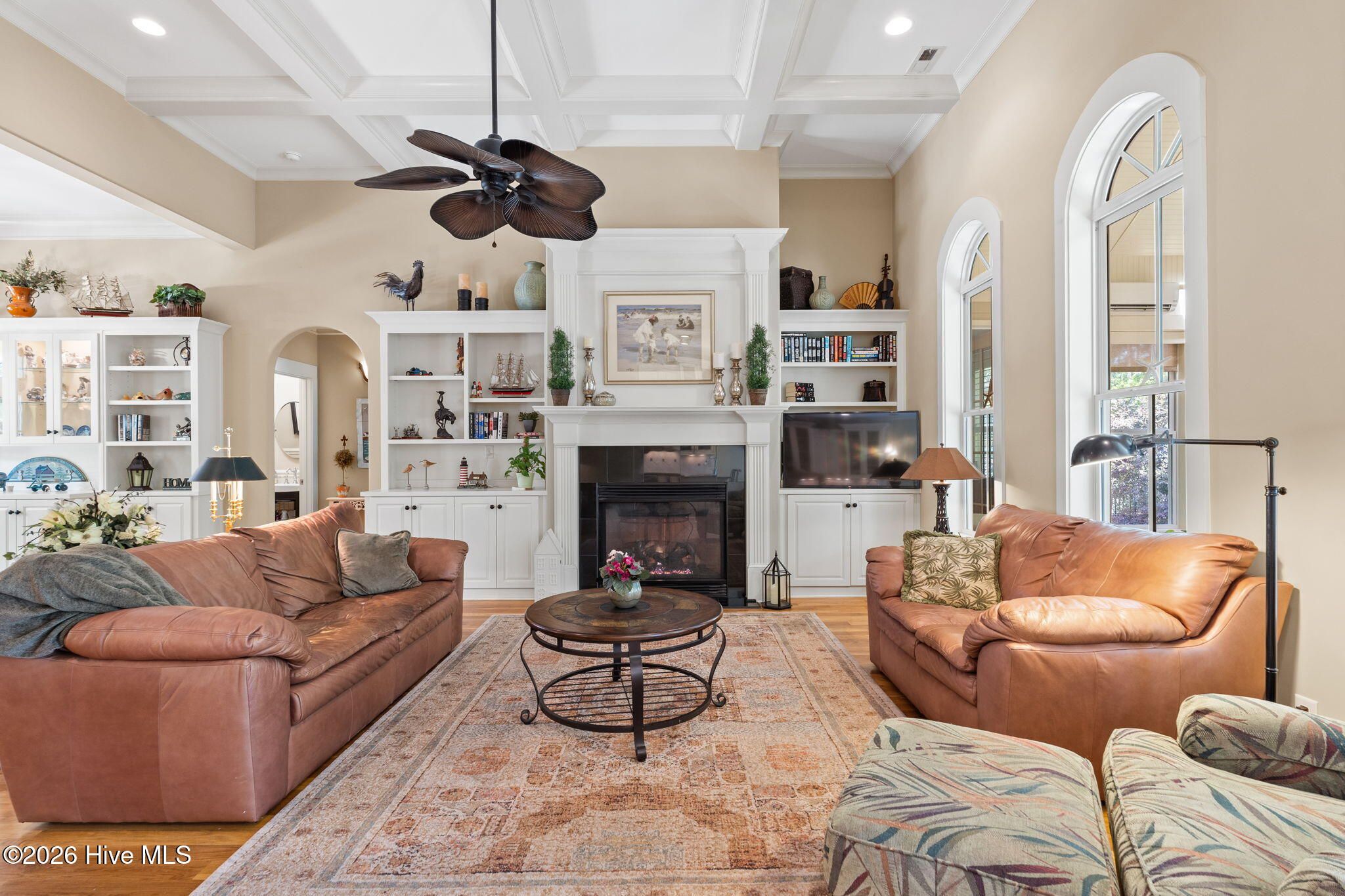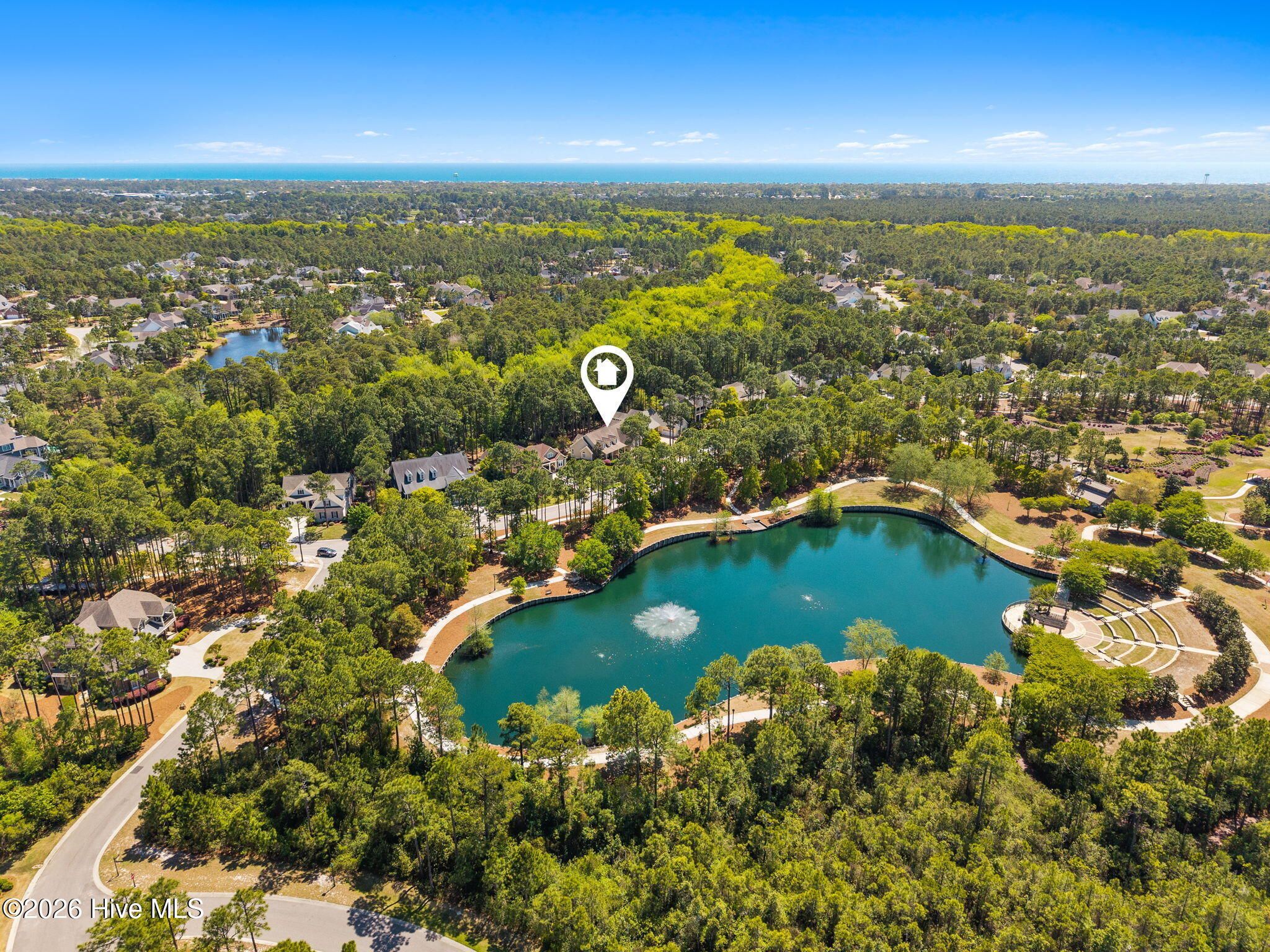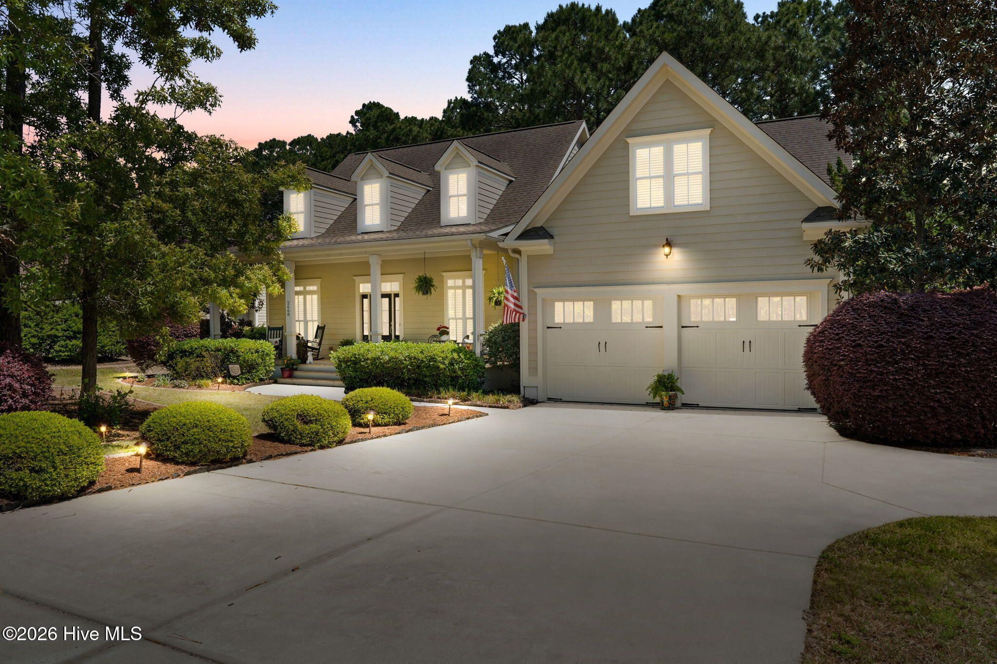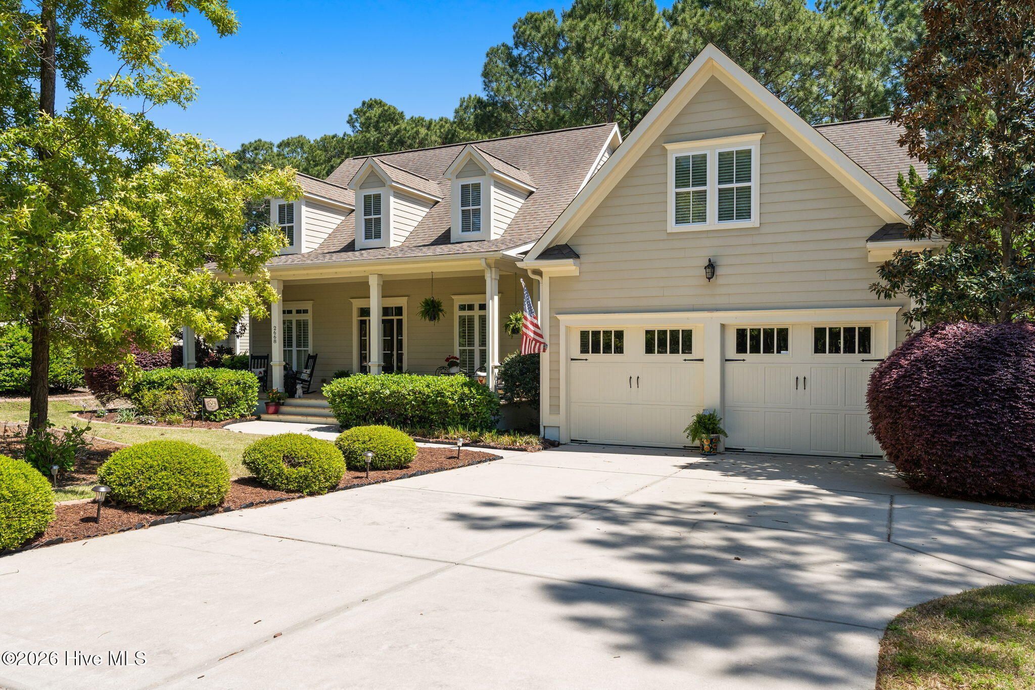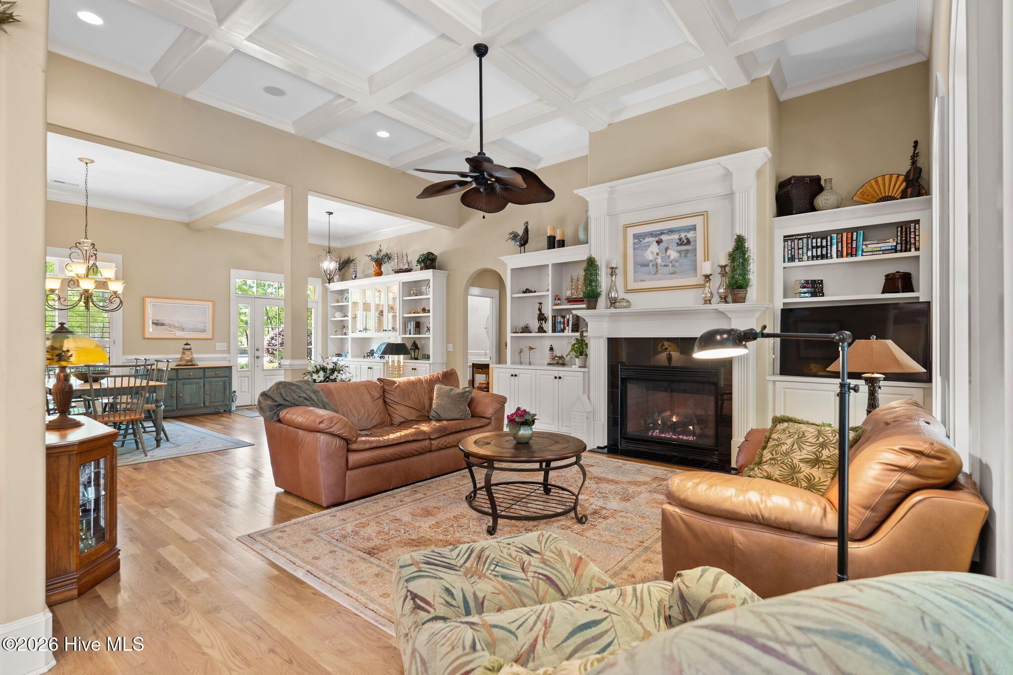 Welcome to this custom-built home, perfectly positioned across from Woodlands Park, where your rocking chair front porch becomes your personal concert venue. Step inside to discover thoughtful design and timeless architectural details, including elegant built-ins in the foyer, abundant natural light from a glass-paneled front door with transom and sidelights, and rich hardwood flooring throughout the main living areas. Rounded archways add character, while the dining room showcases classic wainscoting and plantation shutters. The spacious living room is a true centerpiece, featuring impressive 14-foot coffered ceilings and custom built-ins flanking a gas propane fireplace with a detailed mantel. The kitchen is equally inviting, equipped with GE appliances, a 5-burner gas oven, French-door refrigerator with ice maker, granite countertops, custom cabinetry, under-cabinet lighting, and both bar seating and a cozy breakfast nook for casual dining. A tiled, all-season Carolina room extends the living space and opens to a private backyard patio--perfect for relaxing or entertaining year-round. The primary suite offers a peaceful retreat with a vaulted ceiling and plantation shutters, complemented by a luxurious en-suite bath featuring dual vanities, a large walk-in shower, jetted tub, private water closet, and walk-in closet. Additional conveniences on the main level include a powder room and laundry room. Above the two-car garage you'll find a versatile bonus room with another bedroom and full bath, ideal as a guest suite, home office, craft space, or media room. Additional highlights include surround sound in five rooms, a tankless water heater, and an encapsulated crawl space with dehumidifier. Experience the perfect blend of comfort, craftsmanship, and coastal lifestyle in an amenity-rich community with a marina, private beach club, and 36 miles of trails. Opportunity to join the Clubs at St James too. This isn't just a home, it's a lifestyle. Start living it today.