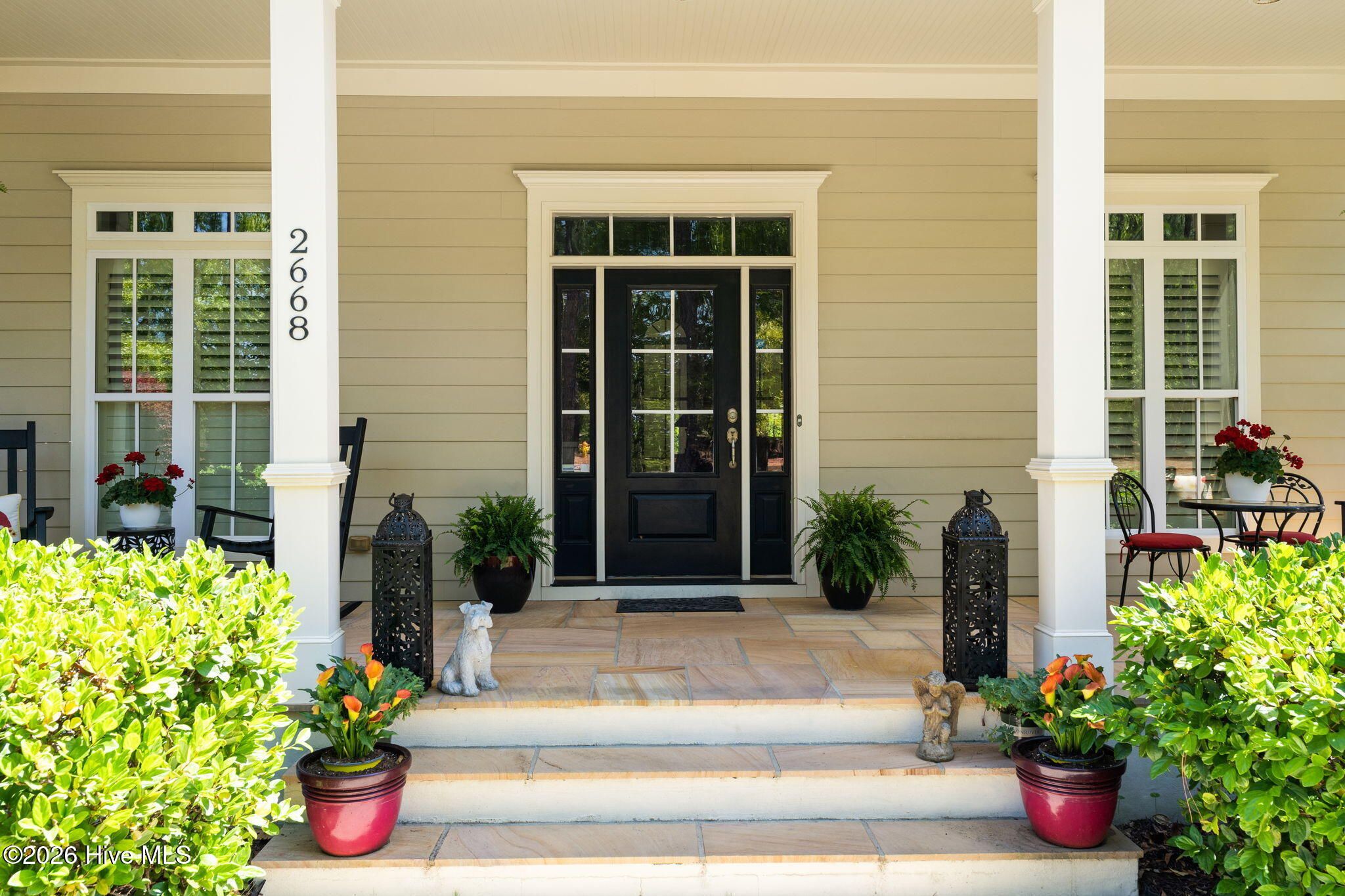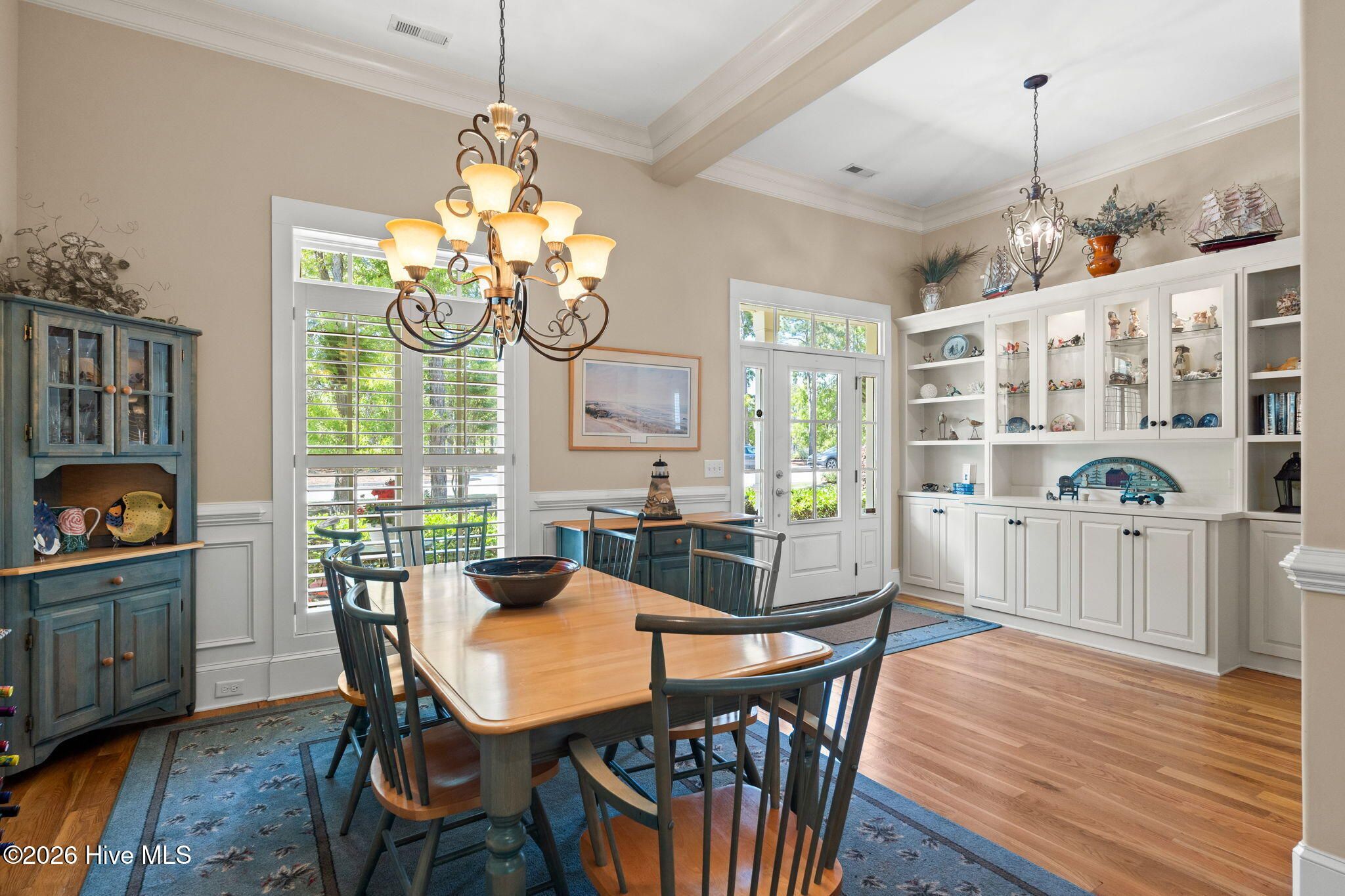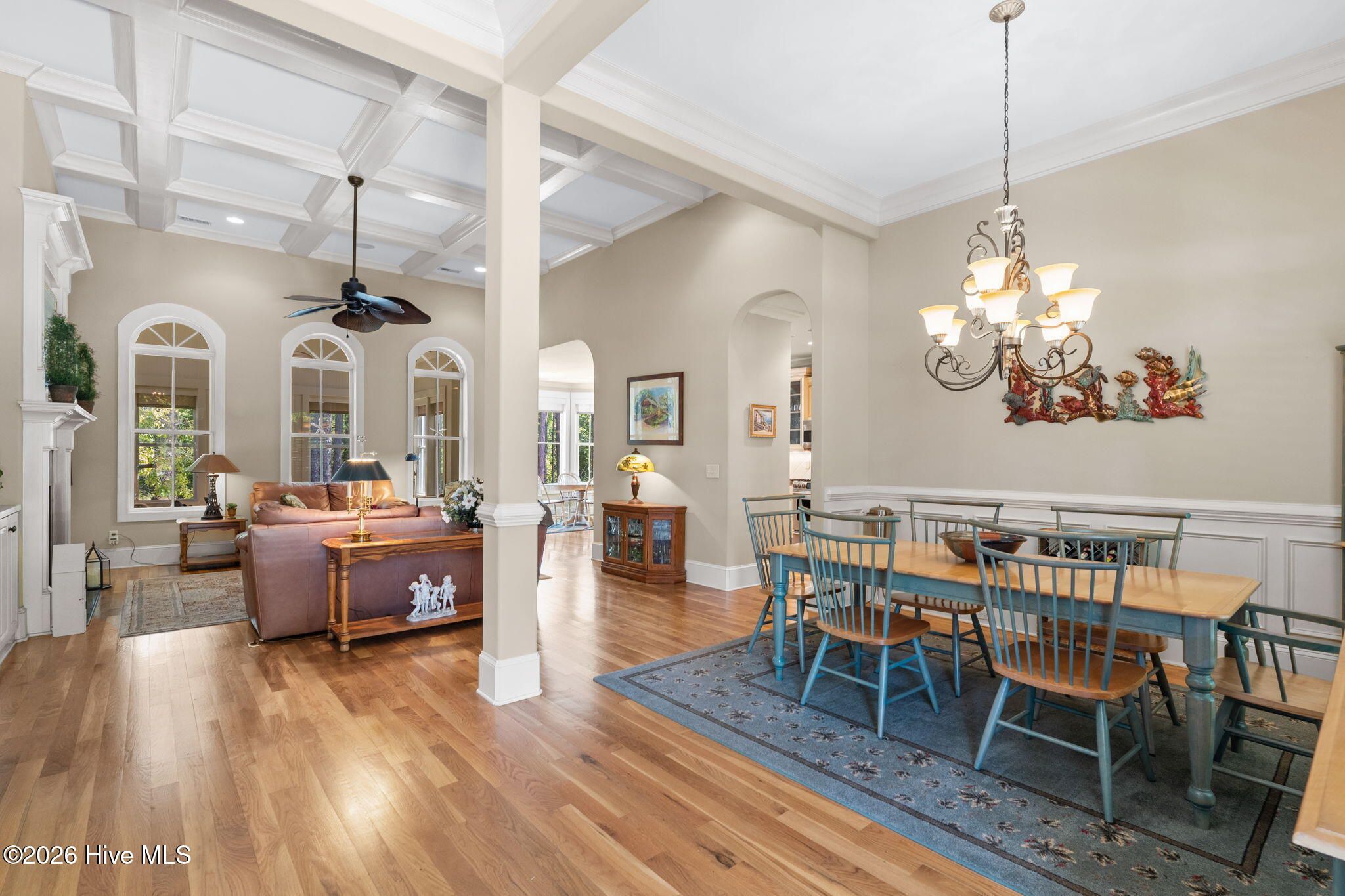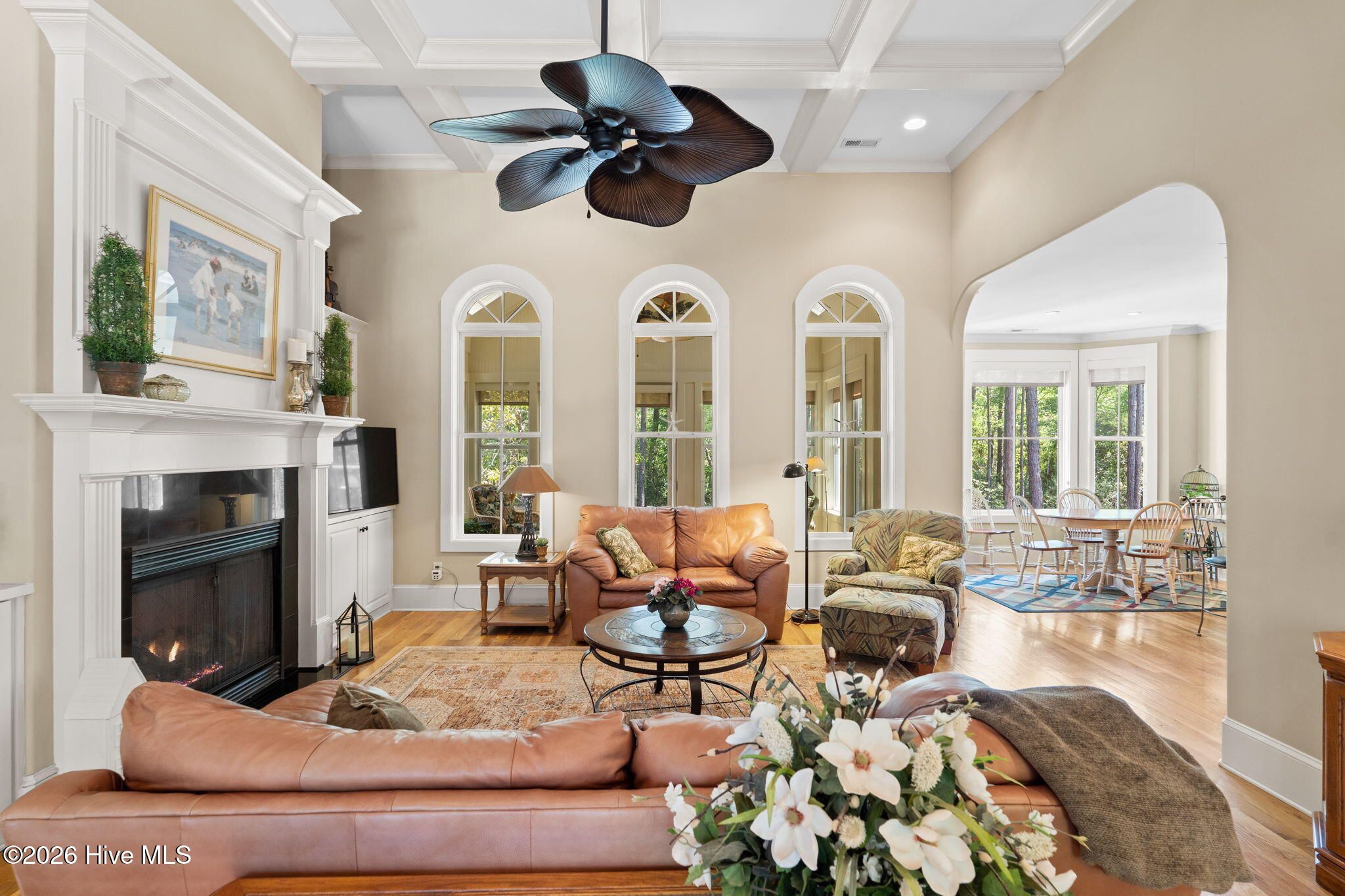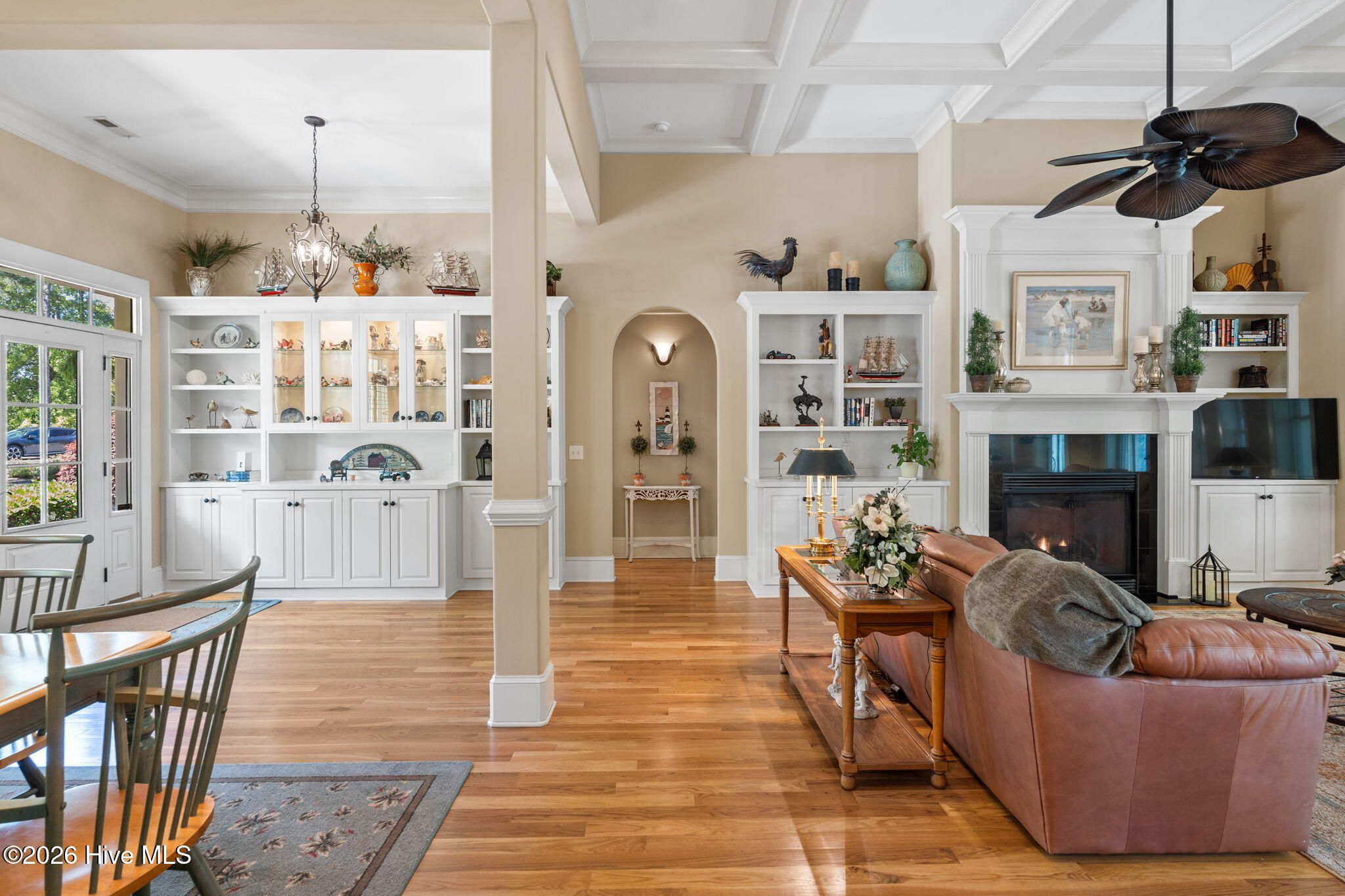 Welcome to this custom-built home, perfectly positioned across from Woodlands Park, where your rocking chair front porch becomes your personal concert venue. Step inside to discover thoughtful design and timeless architectural details, including elegant built-ins in the foyer, abundant natural light from a glass-paneled front door with transom and sidelights, and rich hardwood flooring throughout the main living areas. Rounded archways add character, while the dining room showcases classic wainscoting and plantation shutters. The spacious living room is a true centerpiece, featuring impressive 14-foot coffered ceilings and custom built-ins flanking a gas propane fireplace with a detailed mantel. The kitchen is equally inviting, equipped with GE appliances, a 5-burner gas oven, French-door refrigerator with ice maker, granite countertops, custom cabinetry, under-cabinet lighting, and both bar seating and a cozy breakfast nook for casual dining. A tiled, all-season Carolina room extends the living space and opens to a private backyard patio--perfect for relaxing or entertaining year-round. The primary suite offers a peaceful retreat with a vaulted ceiling and plantation shutters, complemented by a luxurious en-suite bath featuring dual vanities, a large walk-in shower, jetted tub, private water closet, and walk-in closet. Additional conveniences on the main level include a powder room and laundry room. Above the two-car garage you'll find a versatile bonus room with another bedroom and full bath, ideal as a guest suite, home office, craft space, or media room. Additional highlights include surround sound in five rooms, a tankless water heater, and an encapsulated crawl space with dehumidifier. Experience the perfect blend of comfort, craftsmanship, and coastal lifestyle in an amenity-rich community with a marina, private beach club, and 36 miles of trails. Opportunity to join the Clubs at St James too. This isn't just a home, it's a lifestyle. Start living it today.