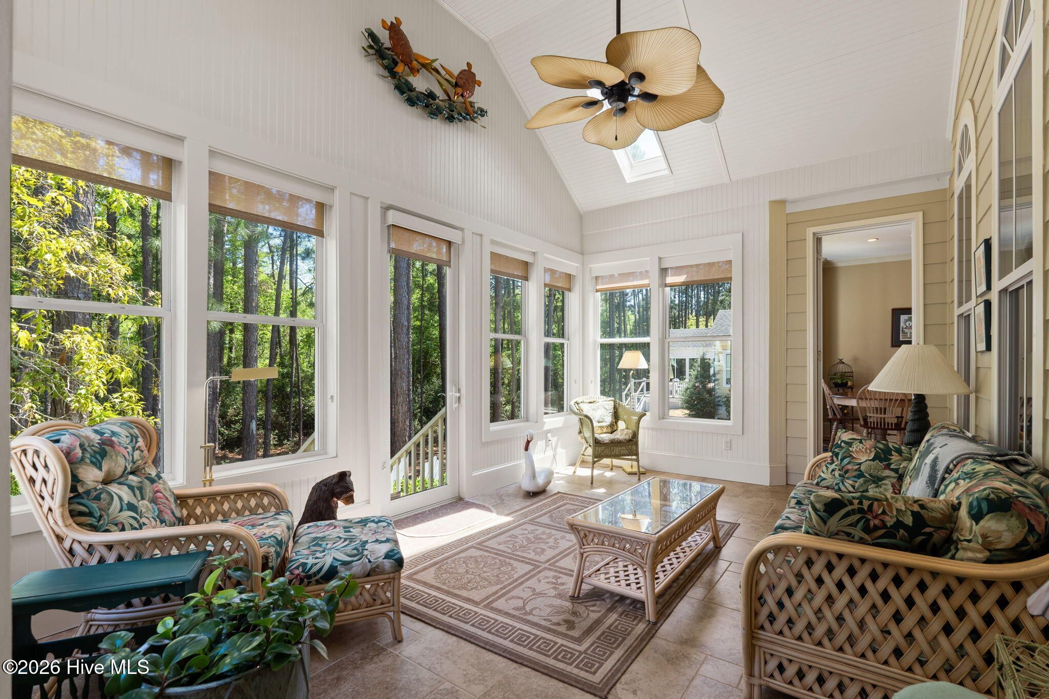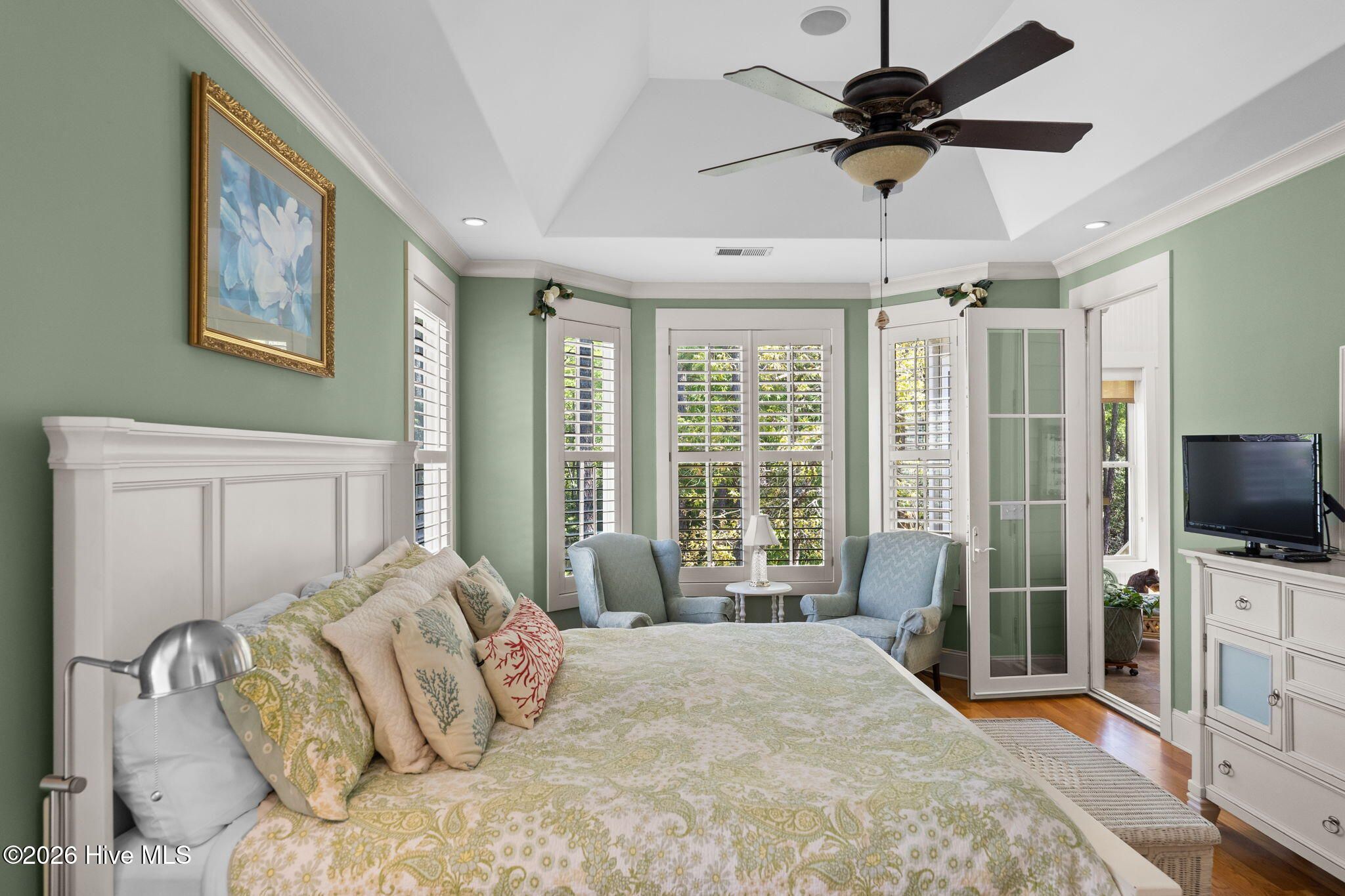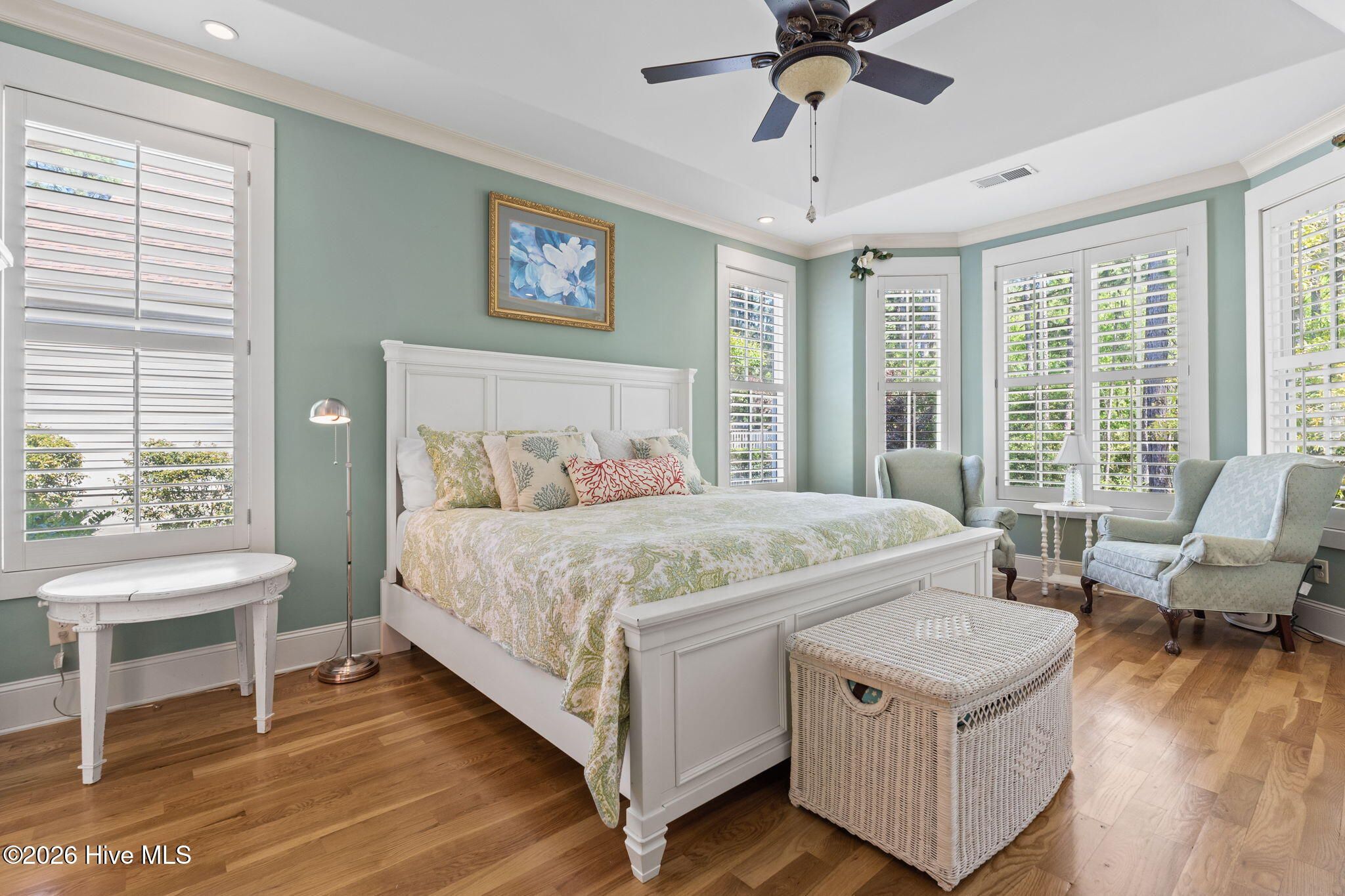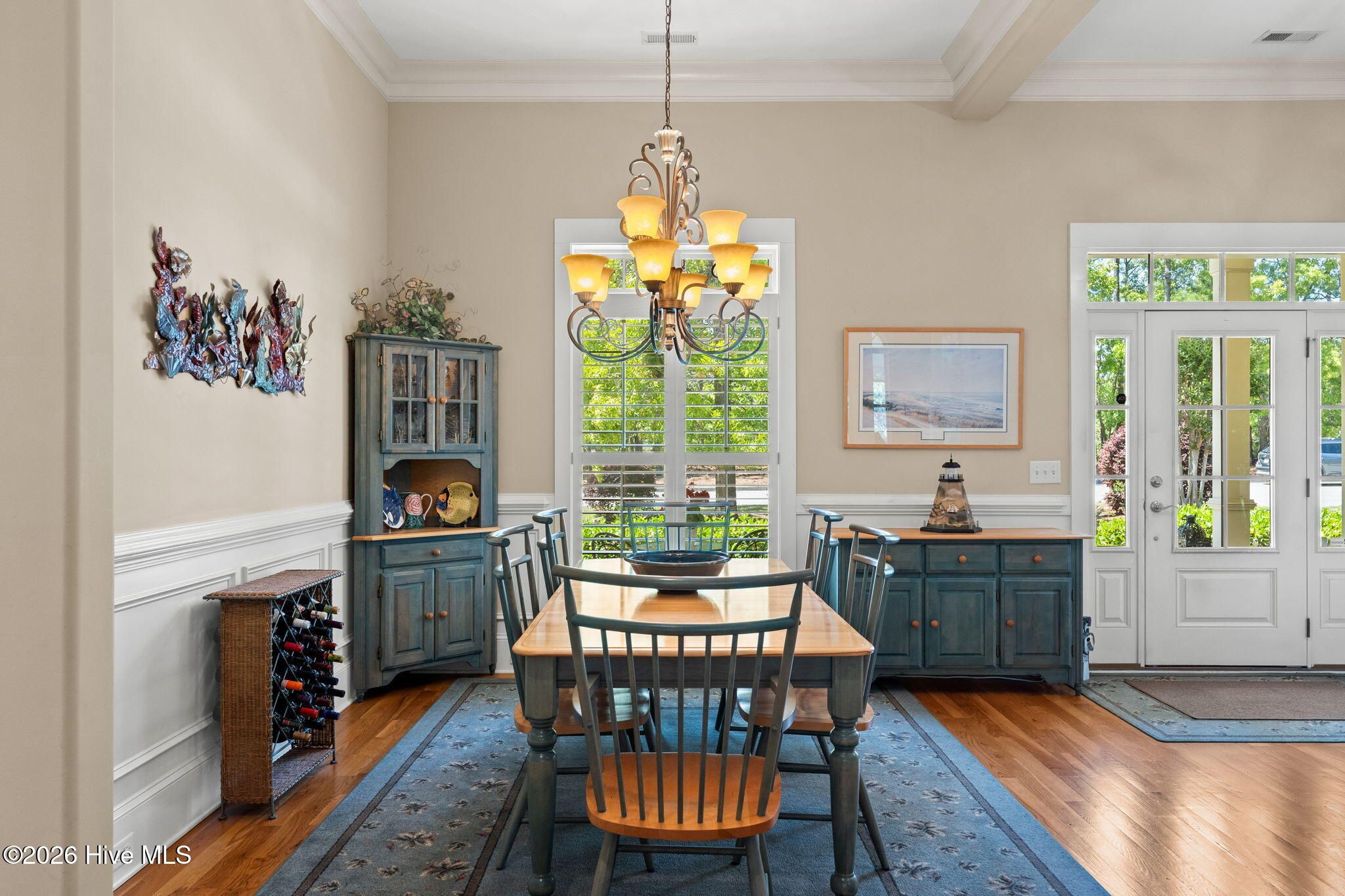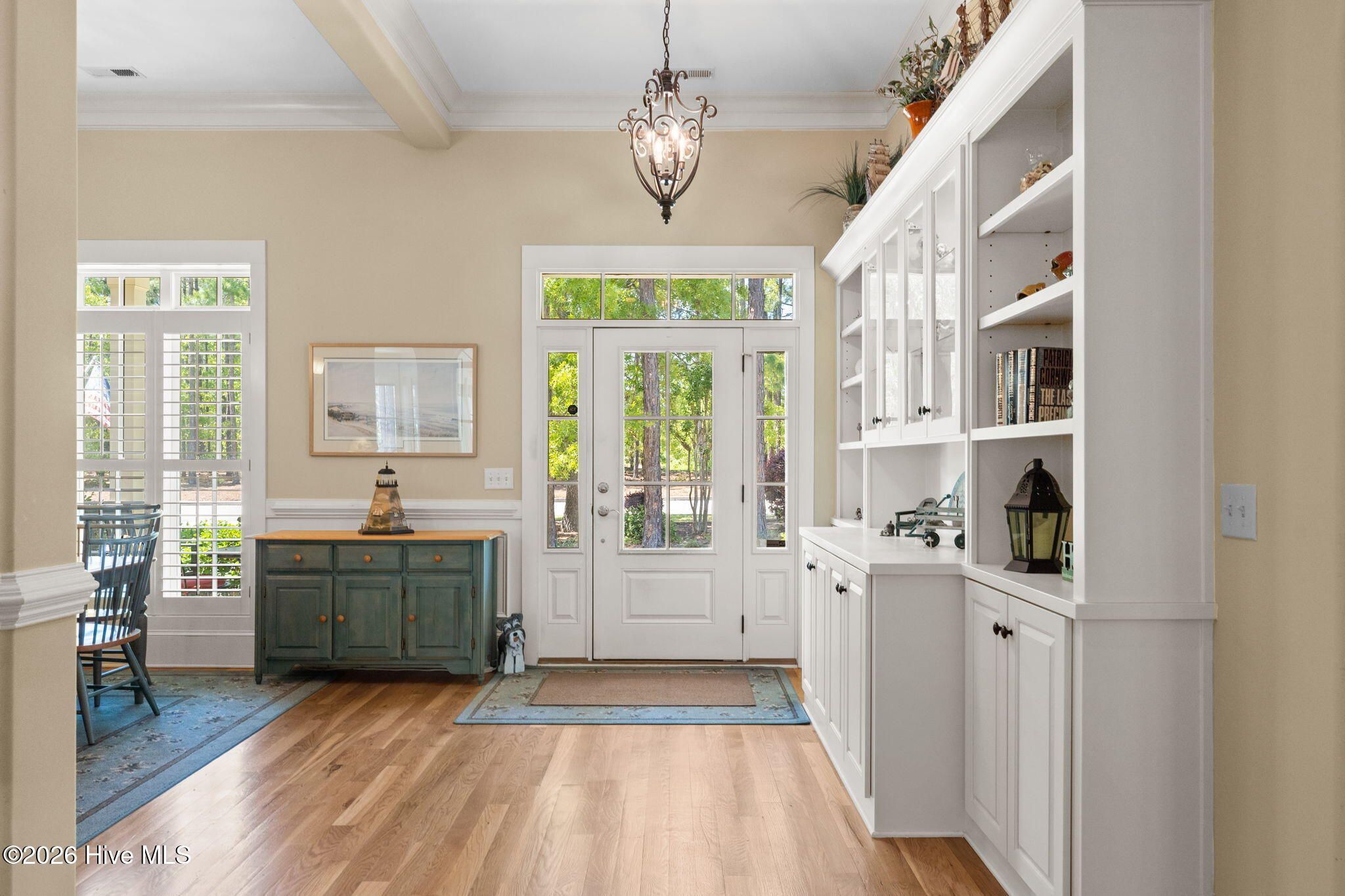 Welcome to this custom-built home, perfectly positioned across from Woodlands Park, where your rocking chair front porch becomes your personal concert venue. Step inside to discover thoughtful design and timeless architectural details, including elegant built-ins in the foyer, abundant natural light from a glass-paneled front door with transom and sidelights, and rich hardwood flooring throughout the main living areas. Rounded archways add character, while the dining room showcases classic wainscoting and plantation shutters. The spacious living room is a true centerpiece, featuring impressive 14-foot coffered ceilings and custom built-ins flanking a gas propane fireplace with a detailed mantel. The kitchen is equally inviting, equipped with GE appliances, a 5-burner gas oven, French-door refrigerator with ice maker, granite countertops, custom cabinetry, under-cabinet lighting, and both bar seating and a cozy breakfast nook for casual dining. A tiled, all-season Carolina room extends the living space and opens to a private backyard patio--perfect for relaxing or entertaining year-round. The primary suite offers a peaceful retreat with a vaulted ceiling and plantation shutters, complemented by a luxurious en-suite bath featuring dual vanities, a large walk-in shower, jetted tub, private water closet, and walk-in closet. Additional conveniences on the main level include a powder room and laundry room. Above the two-car garage you'll find a versatile bonus room with another bedroom and full bath, ideal as a guest suite, home office, craft space, or media room. Additional highlights include surround sound in five rooms, a tankless water heater, and an encapsulated crawl space with dehumidifier. Experience the perfect blend of comfort, craftsmanship, and coastal lifestyle in an amenity-rich community with a marina, private beach club, and 36 miles of trails. Opportunity to join the Clubs at St James too. This isn't just a home, it's a lifestyle. Start living it today.