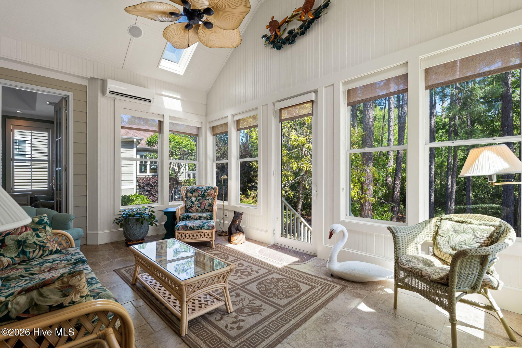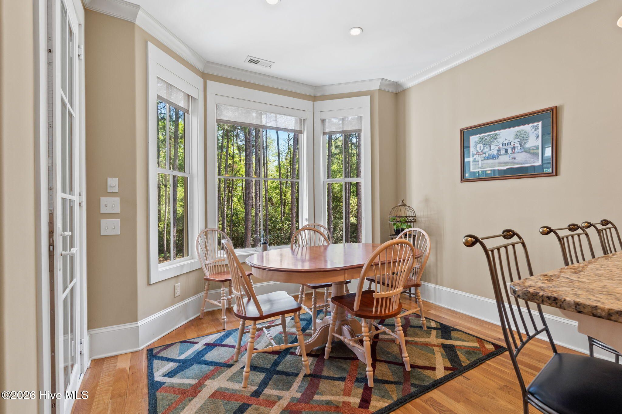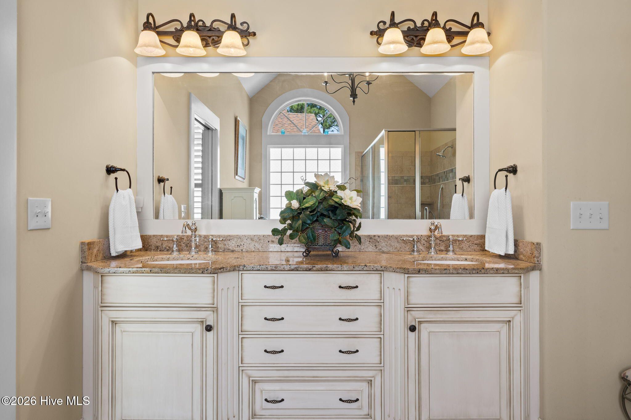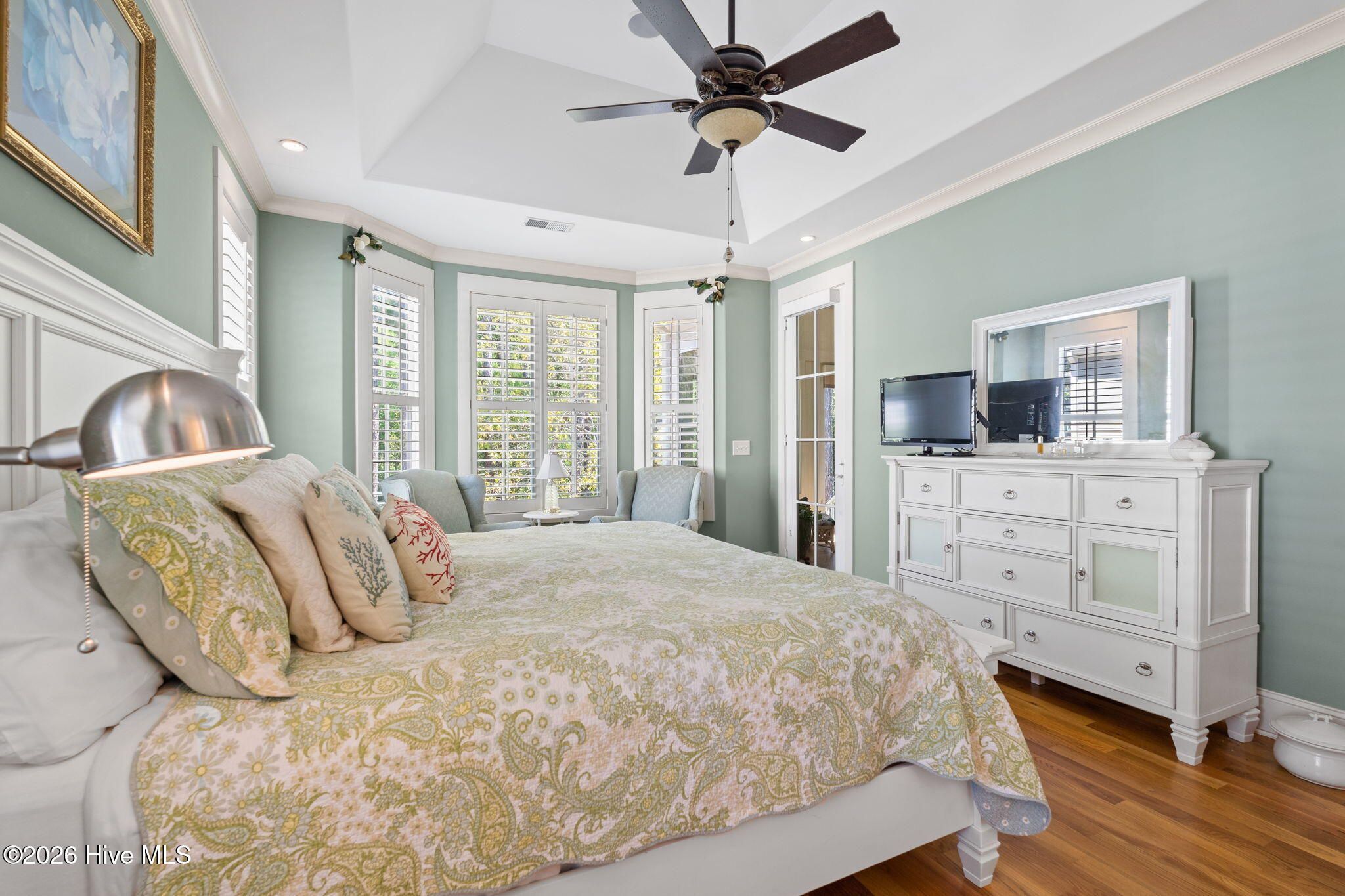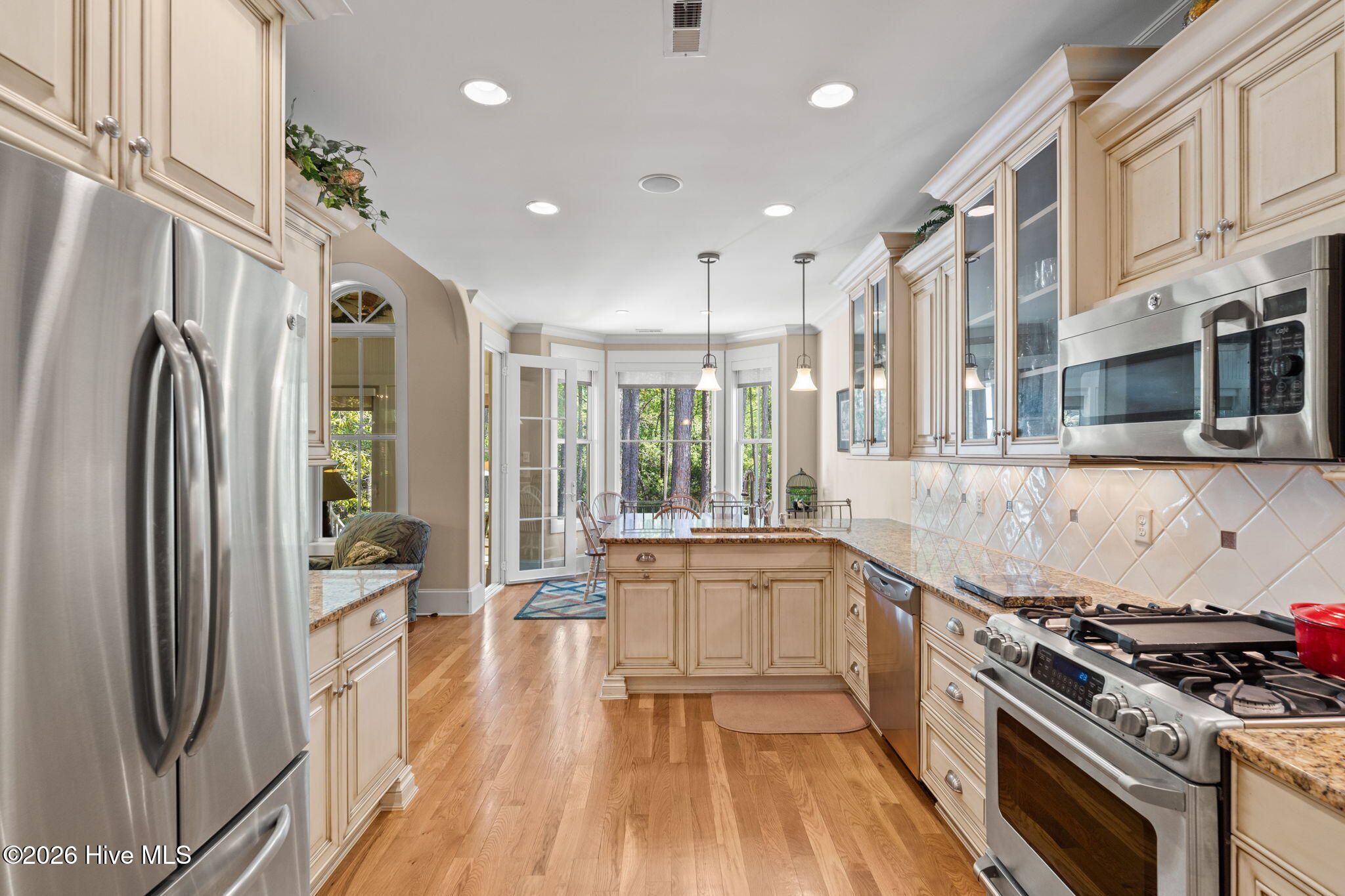 Welcome to this custom-built home, perfectly positioned across from Woodlands Park, where your rocking chair front porch becomes your personal concert venue. Step inside to discover thoughtful design and timeless architectural details, including elegant built-ins in the foyer, abundant natural light from a glass-paneled front door with transom and sidelights, and rich hardwood flooring throughout the main living areas. Rounded archways add character, while the dining room showcases classic wainscoting and plantation shutters. The spacious living room is a true centerpiece, featuring impressive 14-foot coffered ceilings and custom built-ins flanking a gas propane fireplace with a detailed mantel. The kitchen is equally inviting, equipped with GE appliances, a 5-burner gas oven, French-door refrigerator with ice maker, granite countertops, custom cabinetry, under-cabinet lighting, and both bar seating and a cozy breakfast nook for casual dining. A tiled, all-season Carolina room extends the living space and opens to a private backyard patio--perfect for relaxing or entertaining year-round. The primary suite offers a peaceful retreat with a vaulted ceiling and plantation shutters, complemented by a luxurious en-suite bath featuring dual vanities, a large walk-in shower, jetted tub, private water closet, and walk-in closet. Additional conveniences on the main level include a powder room and laundry room. Above the two-car garage you'll find a versatile bonus room with another bedroom and full bath, ideal as a guest suite, home office, craft space, or media room. Additional highlights include surround sound in five rooms, a tankless water heater, and an encapsulated crawl space with dehumidifier. Experience the perfect blend of comfort, craftsmanship, and coastal lifestyle in an amenity-rich community with a marina, private beach club, and 36 miles of trails. Opportunity to join the Clubs at St James too. This isn't just a home, it's a lifestyle. Start living it today.