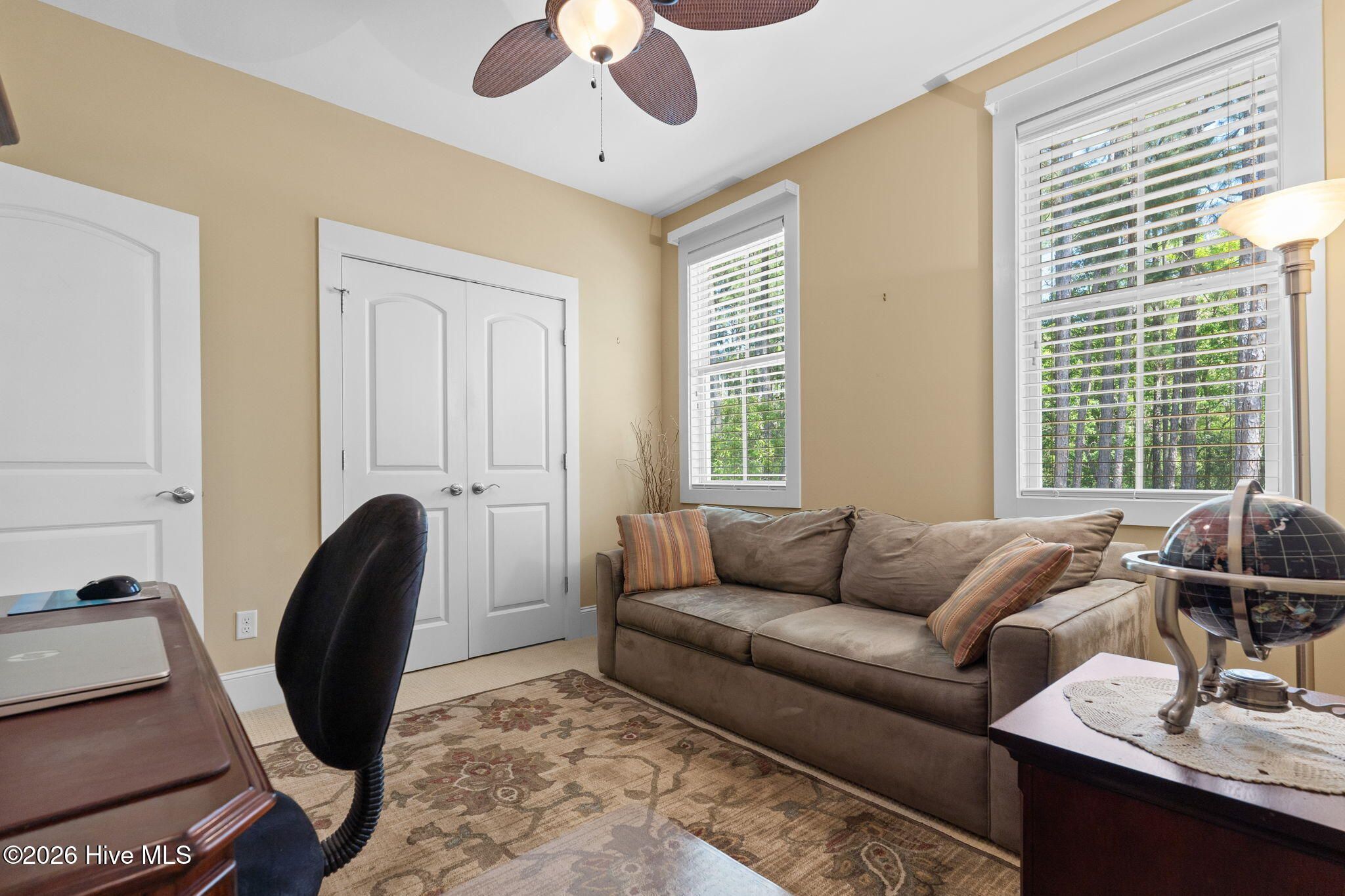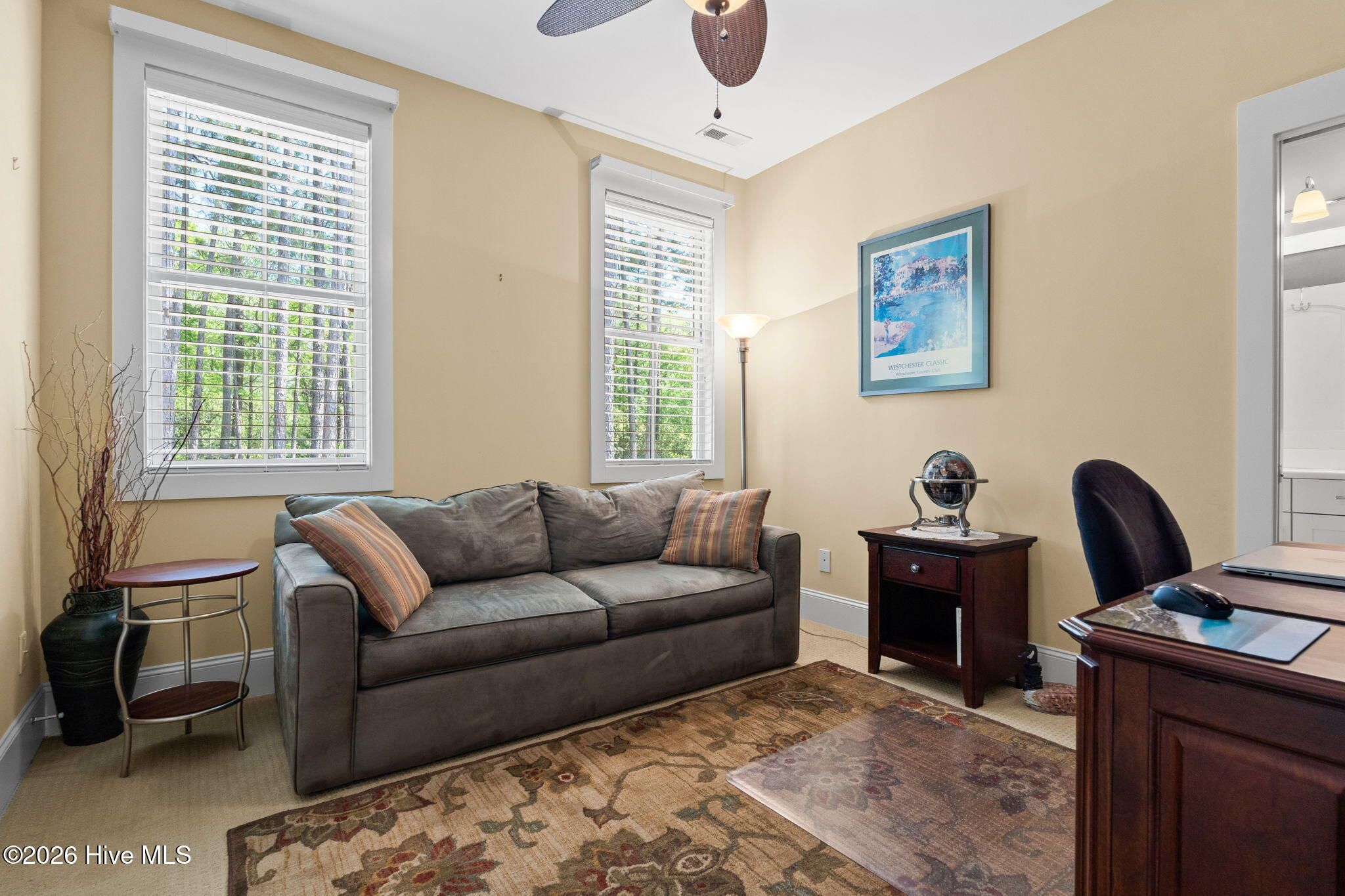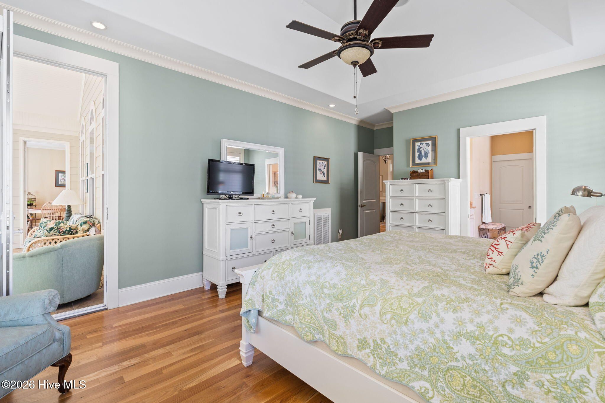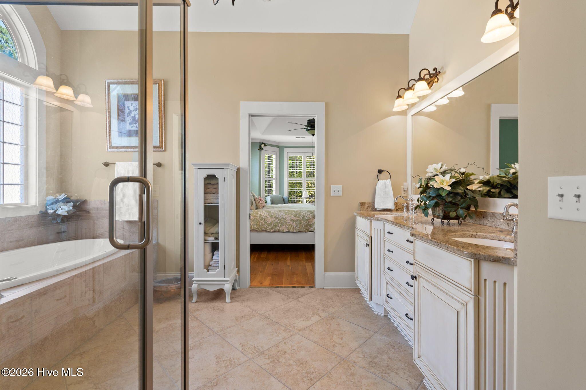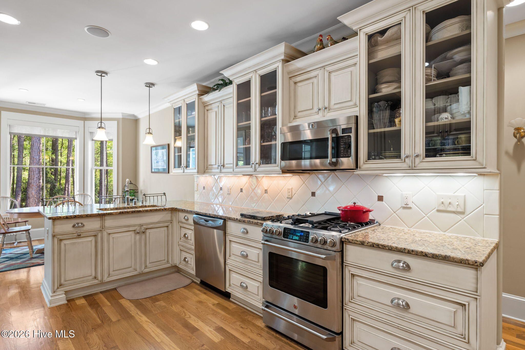 Welcome to this custom-built home, perfectly positioned across from Woodlands Park, where your rocking chair front porch becomes your personal concert venue. Step inside to discover thoughtful design and timeless architectural details, including elegant built-ins in the foyer, abundant natural light from a glass-paneled front door with transom and sidelights, and rich hardwood flooring throughout the main living areas. Rounded archways add character, while the dining room showcases classic wainscoting and plantation shutters. The spacious living room is a true centerpiece, featuring impressive 14-foot coffered ceilings and custom built-ins flanking a gas propane fireplace with a detailed mantel. The kitchen is equally inviting, equipped with GE appliances, a 5-burner gas oven, French-door refrigerator with ice maker, granite countertops, custom cabinetry, under-cabinet lighting, and both bar seating and a cozy breakfast nook for casual dining. A tiled, all-season Carolina room extends the living space and opens to a private backyard patio--perfect for relaxing or entertaining year-round. The primary suite offers a peaceful retreat with a vaulted ceiling and plantation shutters, complemented by a luxurious en-suite bath featuring dual vanities, a large walk-in shower, jetted tub, private water closet, and walk-in closet. Additional conveniences on the main level include a powder room and laundry room. Above the two-car garage you'll find a versatile bonus room with another bedroom and full bath, ideal as a guest suite, home office, craft space, or media room. Additional highlights include surround sound in five rooms, a tankless water heater, and an encapsulated crawl space with dehumidifier. Experience the perfect blend of comfort, craftsmanship, and coastal lifestyle in an amenity-rich community with a marina, private beach club, and 36 miles of trails. Opportunity to join the Clubs at St James too. This isn't just a home, it's a lifestyle. Start living it today.