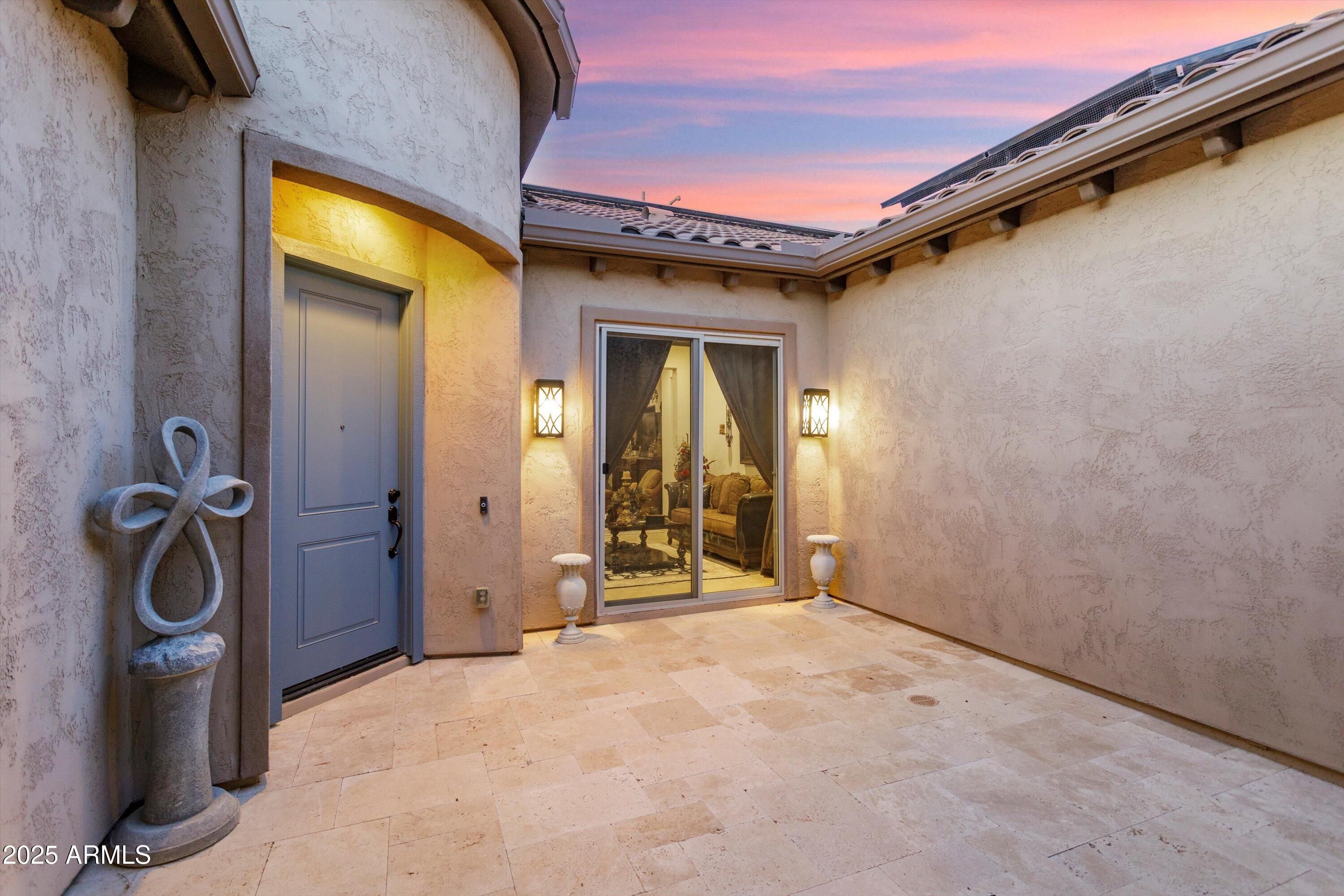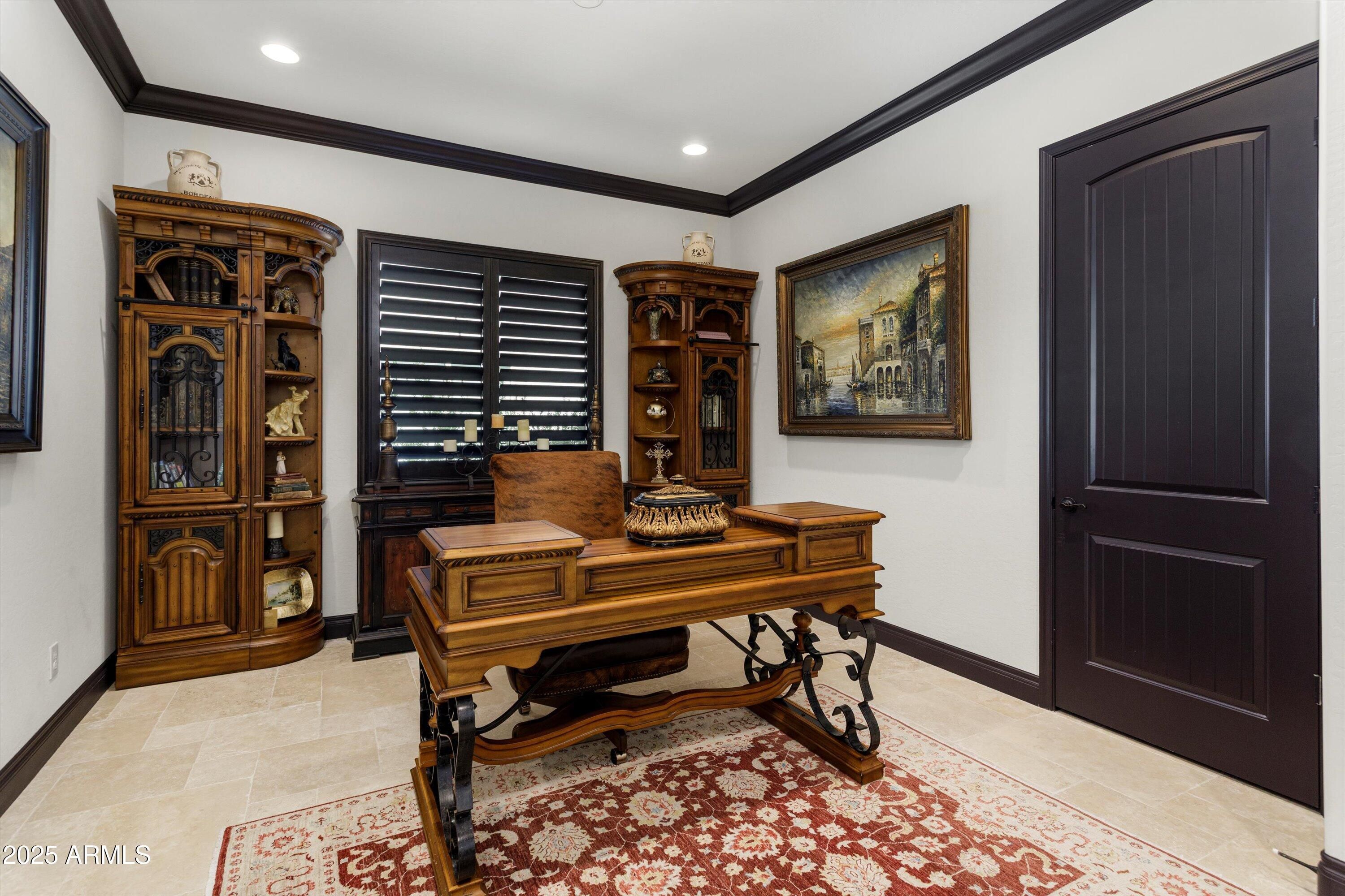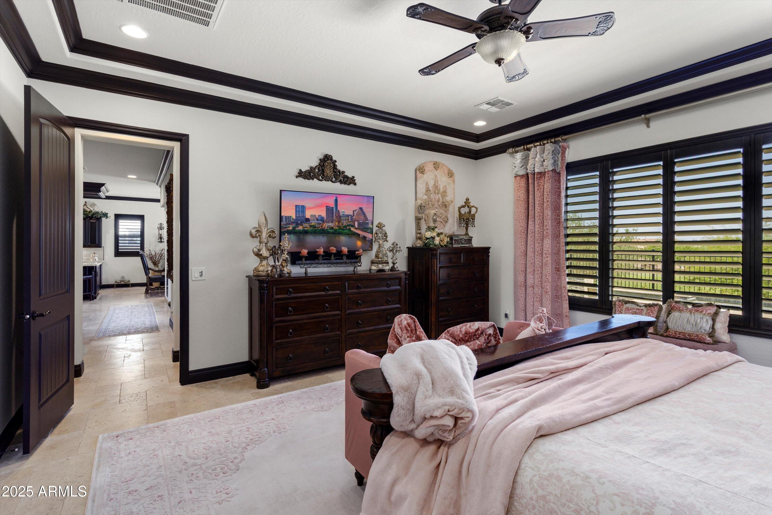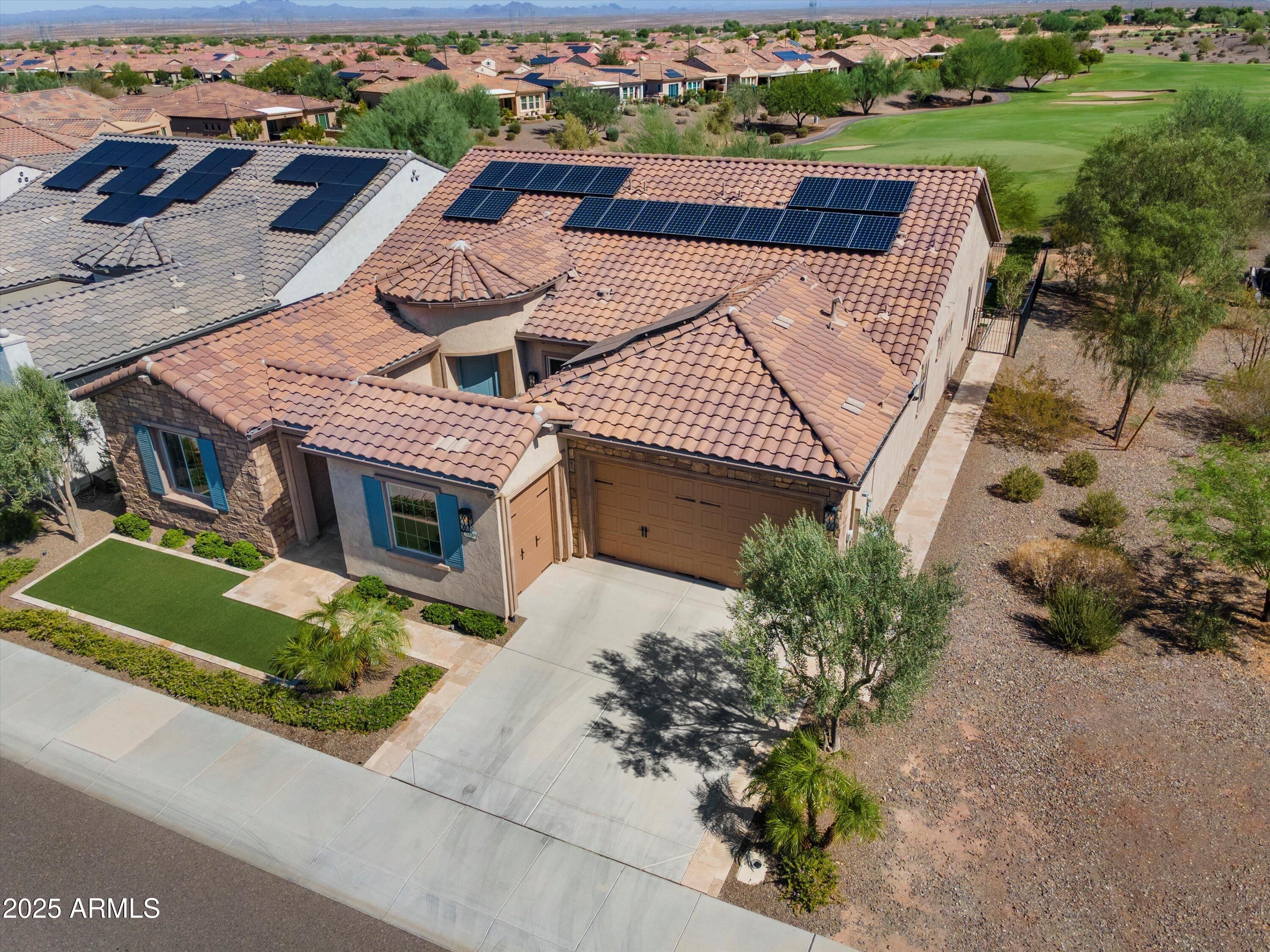 Spectacular Voyage w\Pool, Golf Course, Mountain Views + Owned Solar! Totally custom Travertine Floors, Marble Counters, Crown Molding, & cabinets throughout. Up front there's a Den with a closet, Flex Room w\slider to the courtyard, & a Guest Suite with EnSuite bath. Kitchen upgrades include custom counters, cabinets, upper-lower pull-out shelves, Executive Island with storage, Sub-Zero Fridge, R.O. system & Walk-in Pantry! Owner Suite features a huge custom tile Shower, Glass Sinks, his & her closets, an organizer area & more! Great Room features two wall corner sliding doors that open to the extended Travertine patio, Pool, Spa, Fire Pit, & views of the #1 Green & Mountains. Garage w\epoxy floors & pass-through entry to Cart Garage. Plantation Shutters, Water Softener & So Much More!!