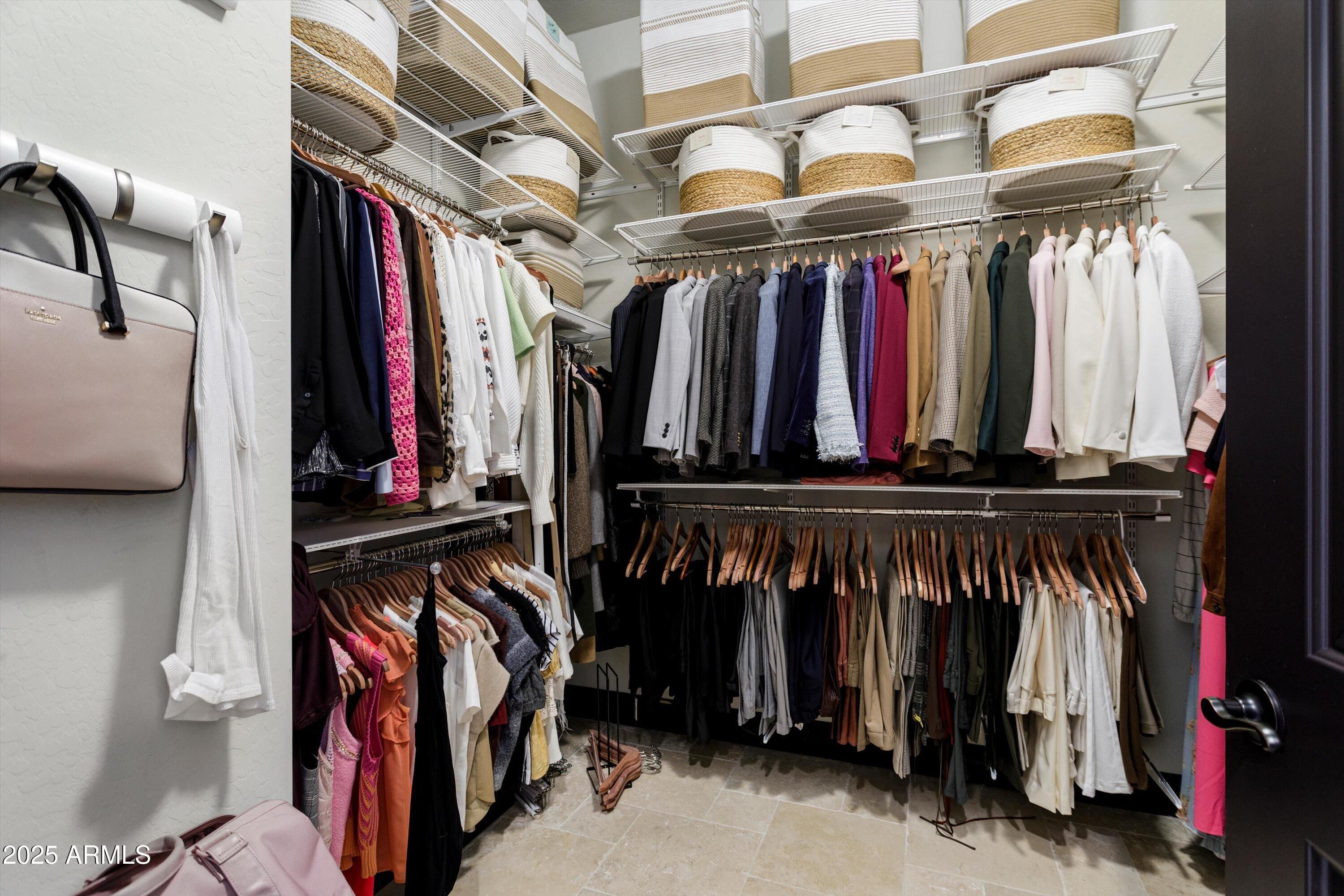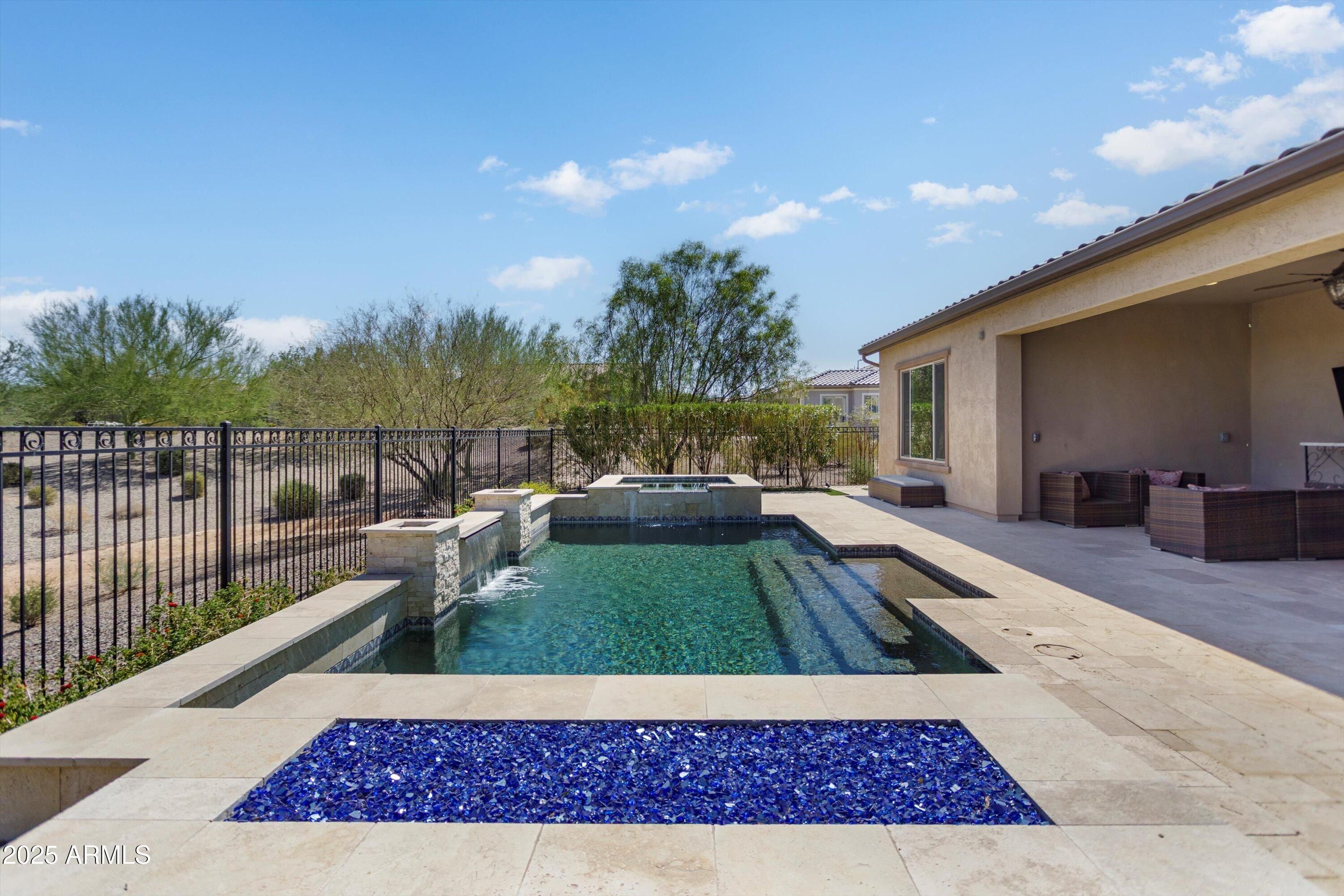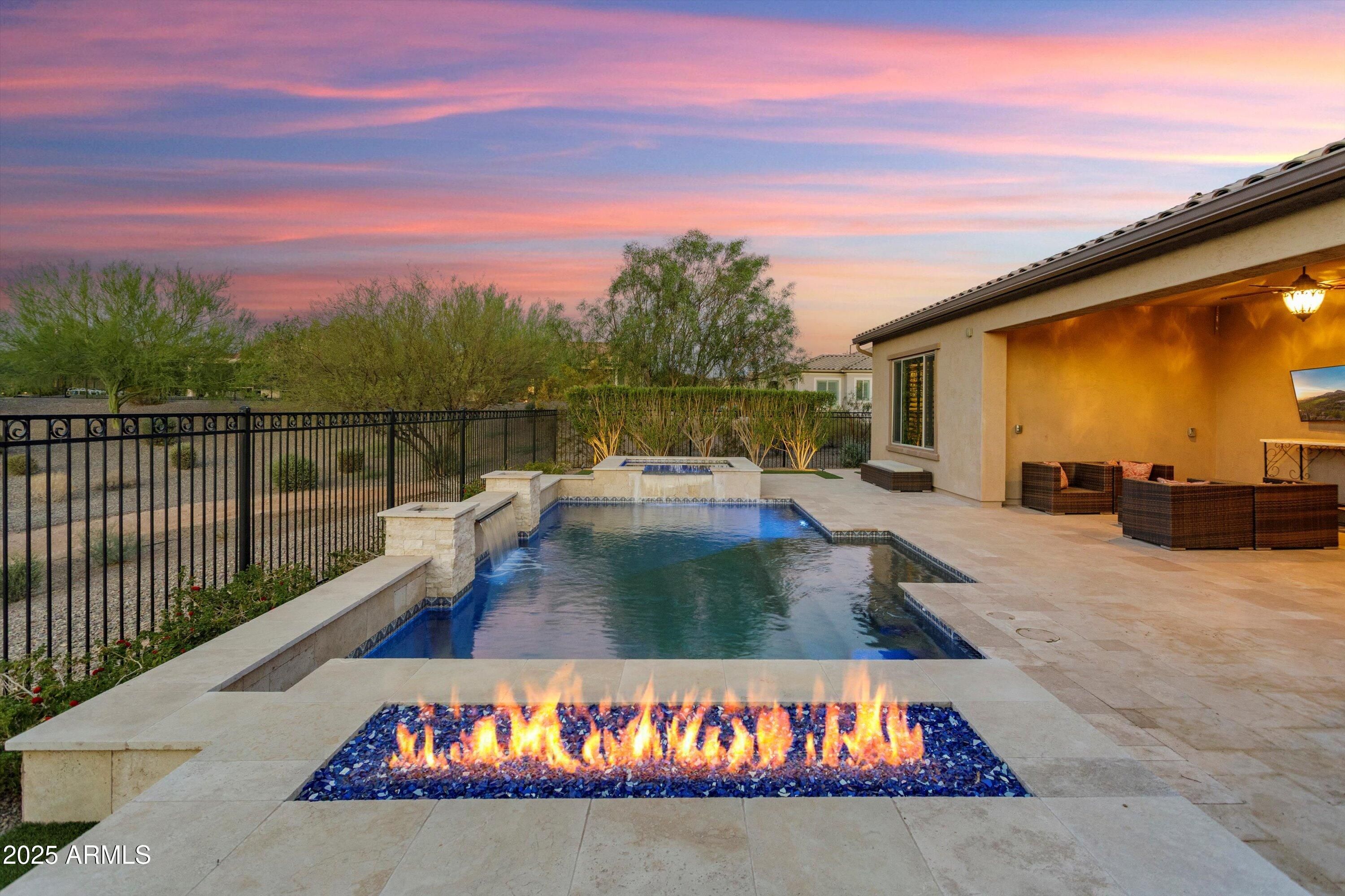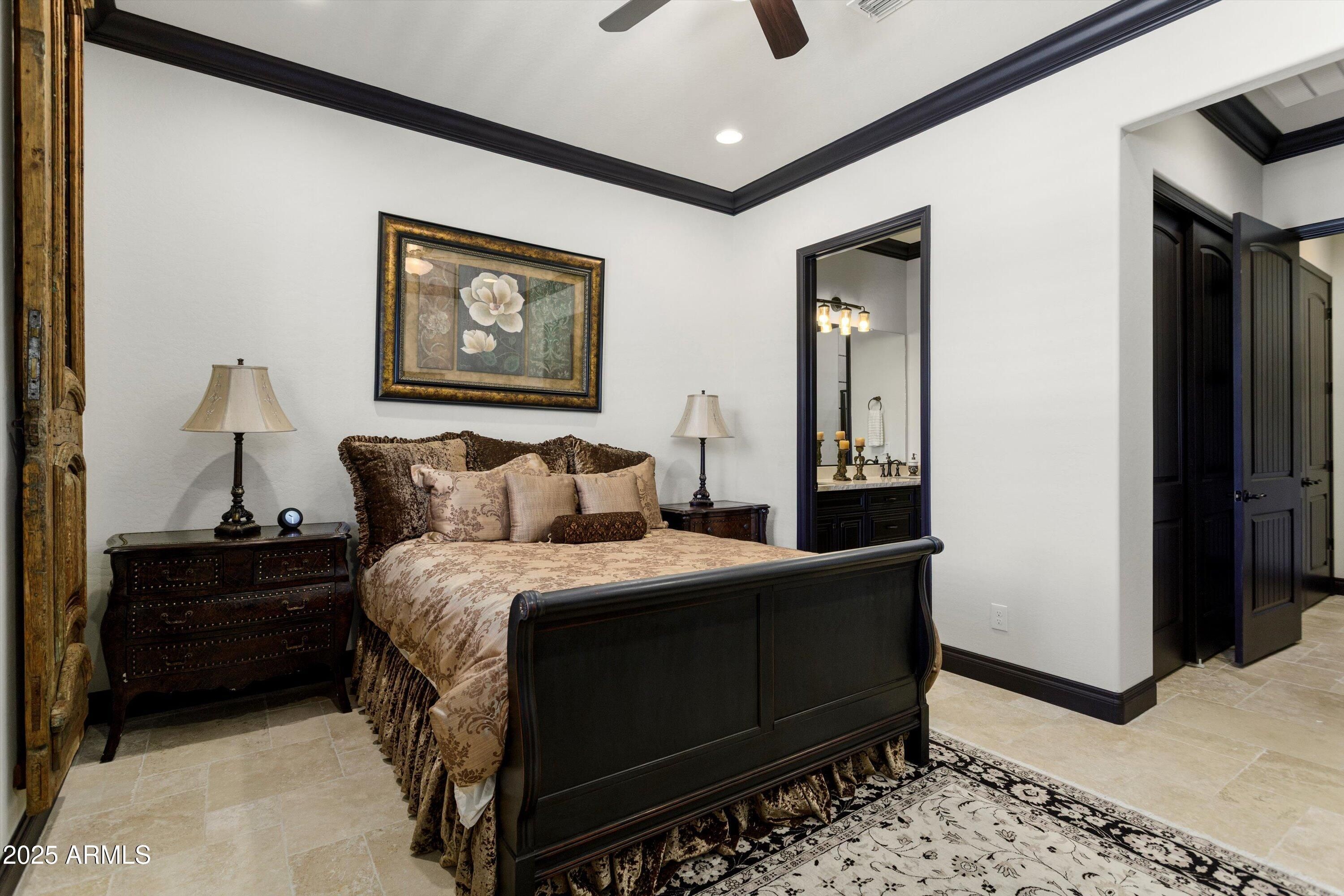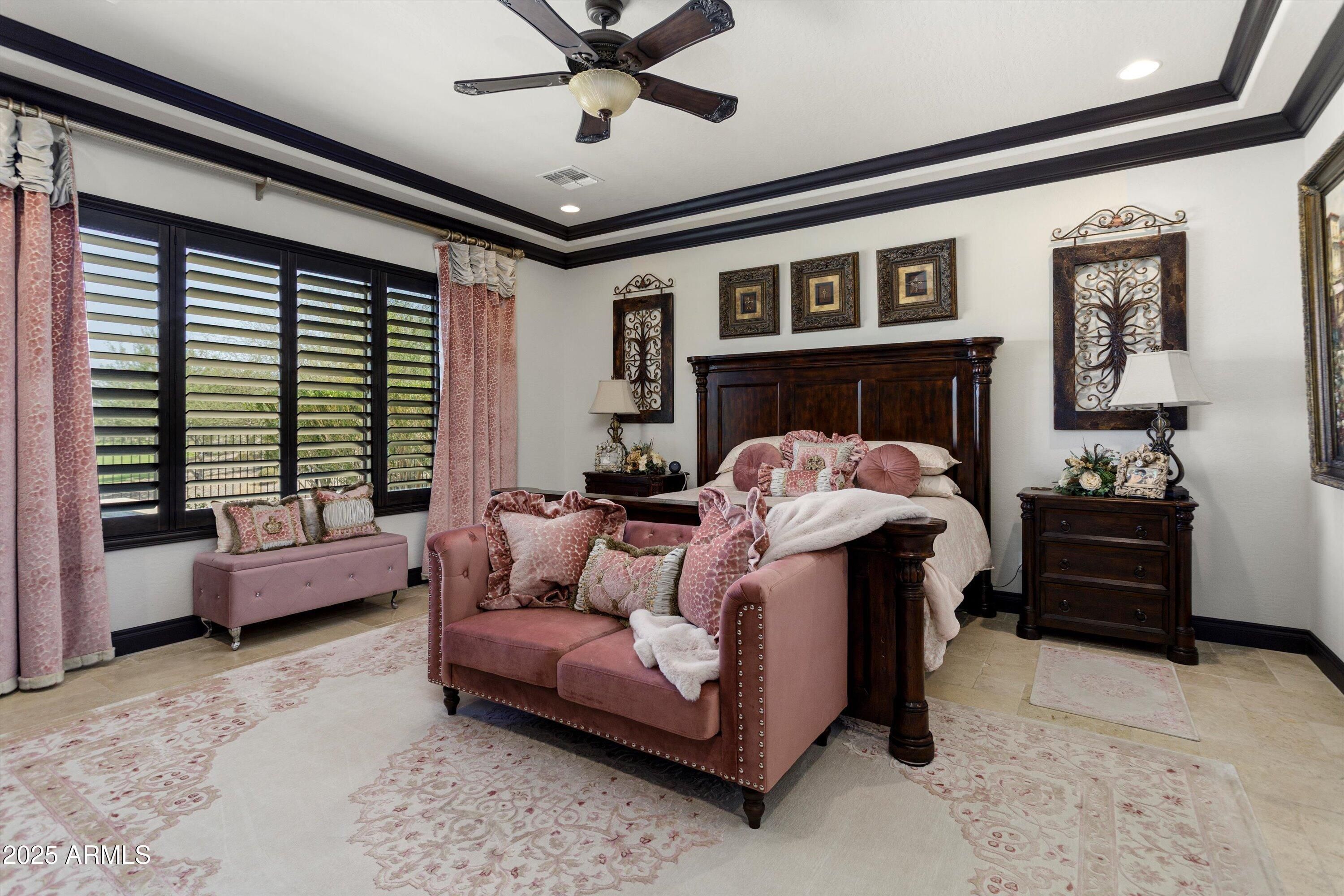 Spectacular Voyage w\Pool, Golf Course, Mountain Views + Owned Solar! Totally custom Travertine Floors, Marble Counters, Crown Molding, & cabinets throughout. Up front there's a Den with a closet, Flex Room w\slider to the courtyard, & a Guest Suite with EnSuite bath. Kitchen upgrades include custom counters, cabinets, upper-lower pull-out shelves, Executive Island with storage, Sub-Zero Fridge, R.O. system & Walk-in Pantry! Owner Suite features a huge custom tile Shower, Glass Sinks, his & her closets, an organizer area & more! Great Room features two wall corner sliding doors that open to the extended Travertine patio, Pool, Spa, Fire Pit, & views of the #1 Green & Mountains. Garage w\epoxy floors & pass-through entry to Cart Garage. Plantation Shutters, Water Softener & So Much More!!