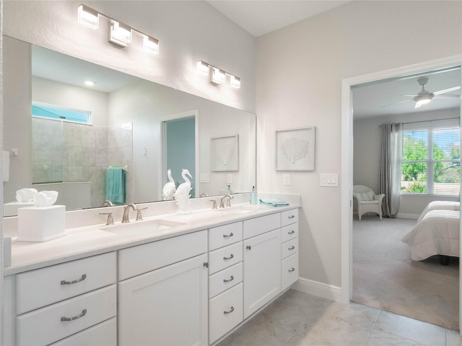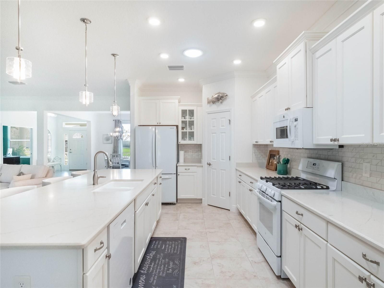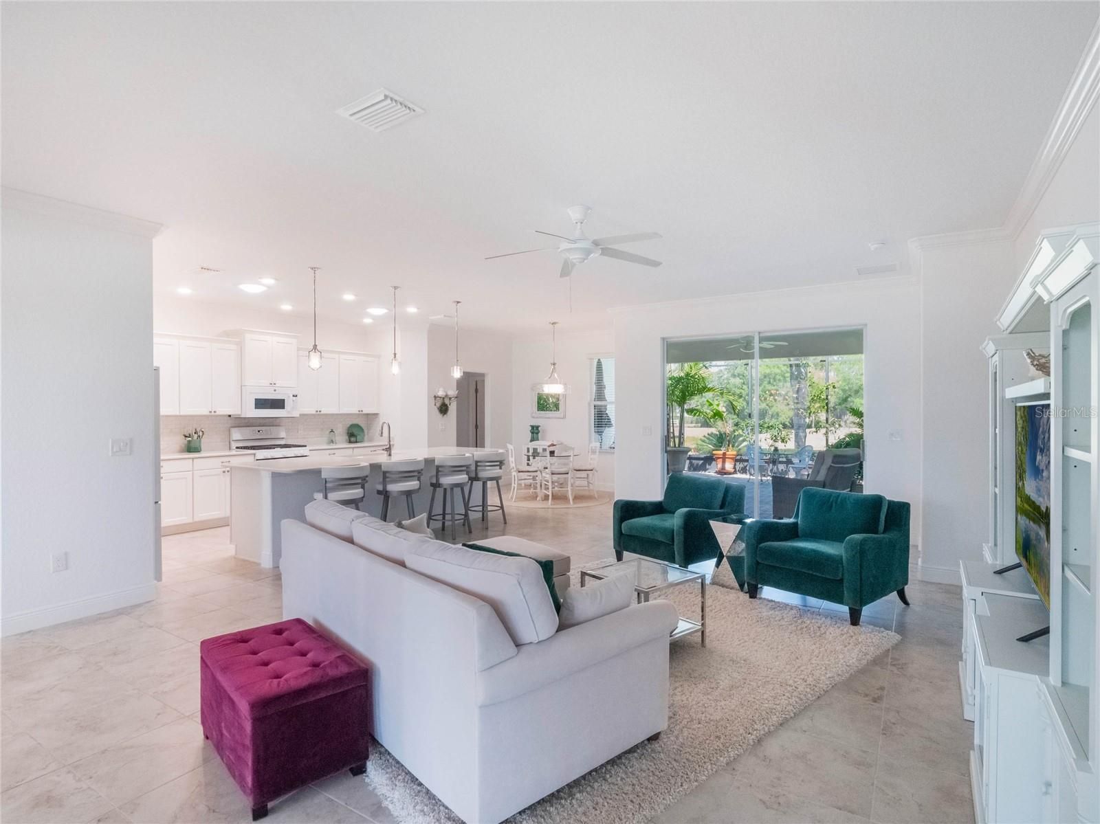 One or more photo(s) has been virtually staged. One of the most desirable homes in Arlington is now for sale! This gorgeous and enhanced Oleander floorplan is one of the most popular in the 55+ neighborhoods, with 2,399 sq. ft., 3 bedrooms, 3 bathrooms, plus BONUS room, over-sized 2 car garage with space for a large truck or golf cart. This luxury home overlooks the golf course, with expansive views of the 16th hole, and wooded background to enjoy virtually complete privacy. As you approach the front door you can enjoy pristine Florida landscaping with palms, manicured hedges and colorful Crepe Myrtles. The covered front porch offers shaded seating, where you can enjoy the Florida sunshine, wave to neighbors and gather streetside to watch the rocket launches. Enter home through a pocket screened door to a bright open floorplan that features views of the golf course, woods, and greenbelt. You will enjoy the views from the living area, kitchen nook and bedrooms! Just inside the front door is a dining space on one side which can be used as additional living space. On the other side is a unique bonus room, with glass pocket doors, perfect for an office, craft room, or den. The living area has 18” tiles, continuing throughout the kitchen, dining, hallway, and utility room. High ceilings, crown molding and luxury fixtures enhance this floorplan. The large and bright designer kitchen offers solar tubes; quartz countertops; coordinating backsplash; lots of soft close cabinets and drawers; custom display cabinet; large closet pantry; spacious island; white appliances; including a gas stove for the chef! Enjoy an eating space with bay windows that overlook the back golf views. The open plan kitchen and living area makes this a perfect home to entertain friends and family. The indoor utility room offers a sink, cabinets, and washer/dryer. From the living area, step through sliding doors onto the covered screened back porch to find paver flooring, brick accents; plenty of space for seating and dining. The adjacent open-air porch has plenty of additional seating with matching pavers, and a gas grill line, perfect for cooking out. This split plan is perfect for friends and family visits, with one side having the owner’s suite, and across the home, there are 2 additional bedrooms and bathrooms! The owner’s suite enjoys views of the golf course. The primary bathroom has a huge walk-in shower; comfort height quartz counters with accent lighting; plenty of drawers and cabinets; separate water closet; and a well-designed custom closet. On the guest side of the home, there are 2 additional bedrooms, both with their own bathroom: perfect for privacy. The guest bathroom has quartz counters, a large walk-in shower, and comfort height toilet. The additional guest bath has a shower/bathtub combo and linen closet. OTHER FEATURES INCLUDE: ROOF 2018, AC 2018, DESIGNER LIGHT FIXTURES, 18” TILE FLOORING, SOLAR TUBES, HIGH CEILINGS, CROWN MOLDING, WHOLE-HOUSE WATER SOFTENER, FULL HOUSE SURGE PROTECTOR, EXTRA CLOSET SPACE, AND MORE! Arlington Ridge is a resort-style golf community that within their monthly fee includes lawn cutting, edging, blowing, cable and internet! Community features include golf course, driving range, putting range, lighted tennis & Pickleball courts. Enjoy a community movie theater, large banquet hall, 2 heated pools, fitness center, restaurant and bar right on property. Adjacent to PEAR park, with dog park, 12 Pickleball courts, walking trails. Tons of activities & clubs to join!