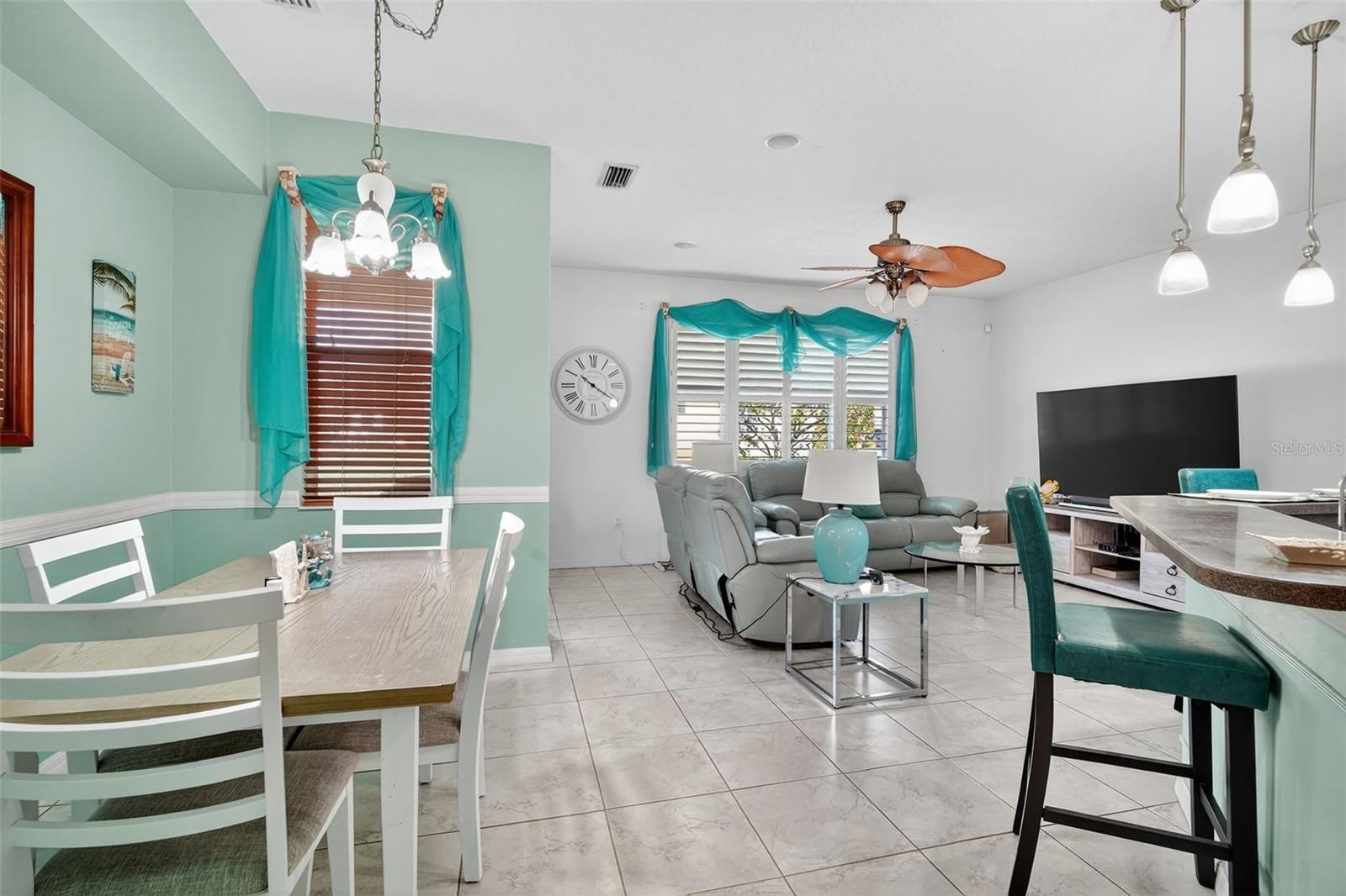 - Ceiling Fan(s), Eat-in Kitchen, High Ceilings, Kitchen/Family Room Combo, Living/Dining Room, Main Level Primary, Solid Surface Counters, Solid-Wood Cabinets, Thermostat, Walk-In Closet(s)