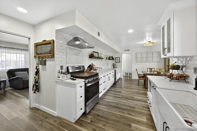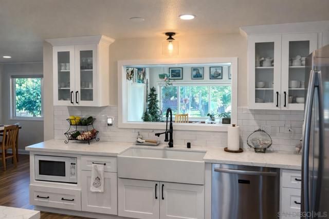 Beautifully remodeled single-story home in one of the most desirable 55+ communities. The expansive kitchen is a true showstopper, featuring white shaker cabinetry, over 23 feet of stunning quartz countertops, 5-burner gas range, brand-new GE stainless steel appliances, making it one of the largest kitchens in the community. A designer subway tile backsplash with elegant marble inlay adds a sophisticated finishing touch, tying the space together with both style and function. Enjoy stylish luxury vinyl plank flooring throughout and a thoughtfully updated interior. The large, finished sunroom offers flexible space and can easily be converted into an optional third bedroom, home office, or hobby room. Situated on a premium cul-de-sac lot with no rear neighbors, this home offers added privacy and peaceful views—one of the most sought after locations in the neighborhood. Energy efficiency is a bonus with a paid-off solar system equipped with a Tesla inverter, along with a reverse osmosis water filtration system. The spacious primary suite features an ensuite bath with a high-end Safe Step walk-in tub for comfort and accessibility. Additional upgrades include fresh exterior paint and a generous backyard filled with mature fruit trees, including orange, grapefruit, fig, peach, and olive. Residents enjoy access to the amenities of the Sun City Civic Association, including pools, a fitness center, clubs, and a variety of social activities—all with low HOA dues and low taxes. Conveniently located near shopping centers, banks, medical offices,