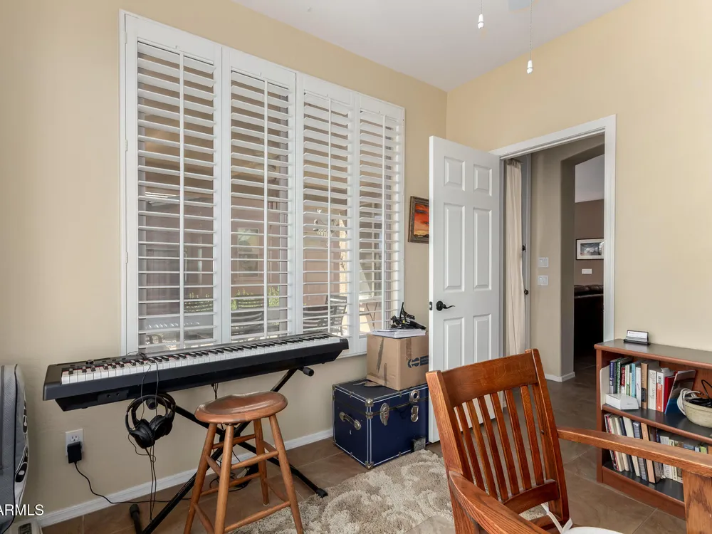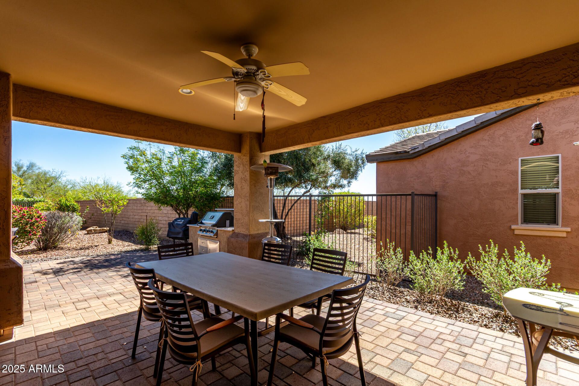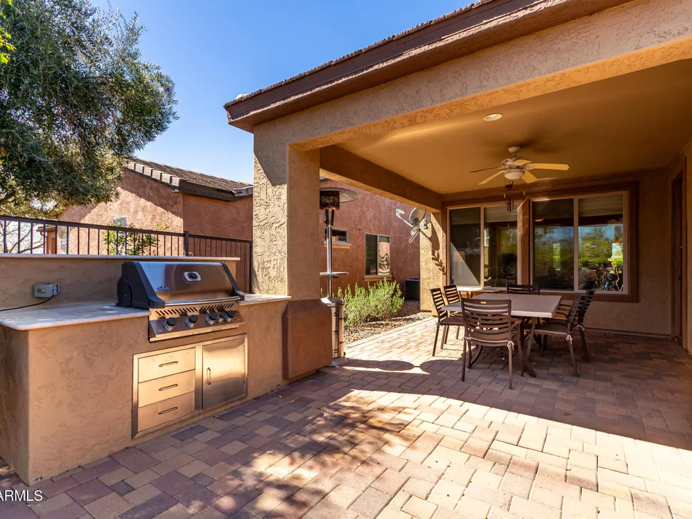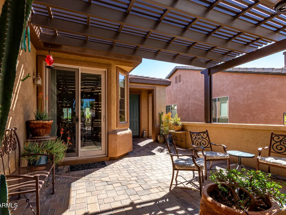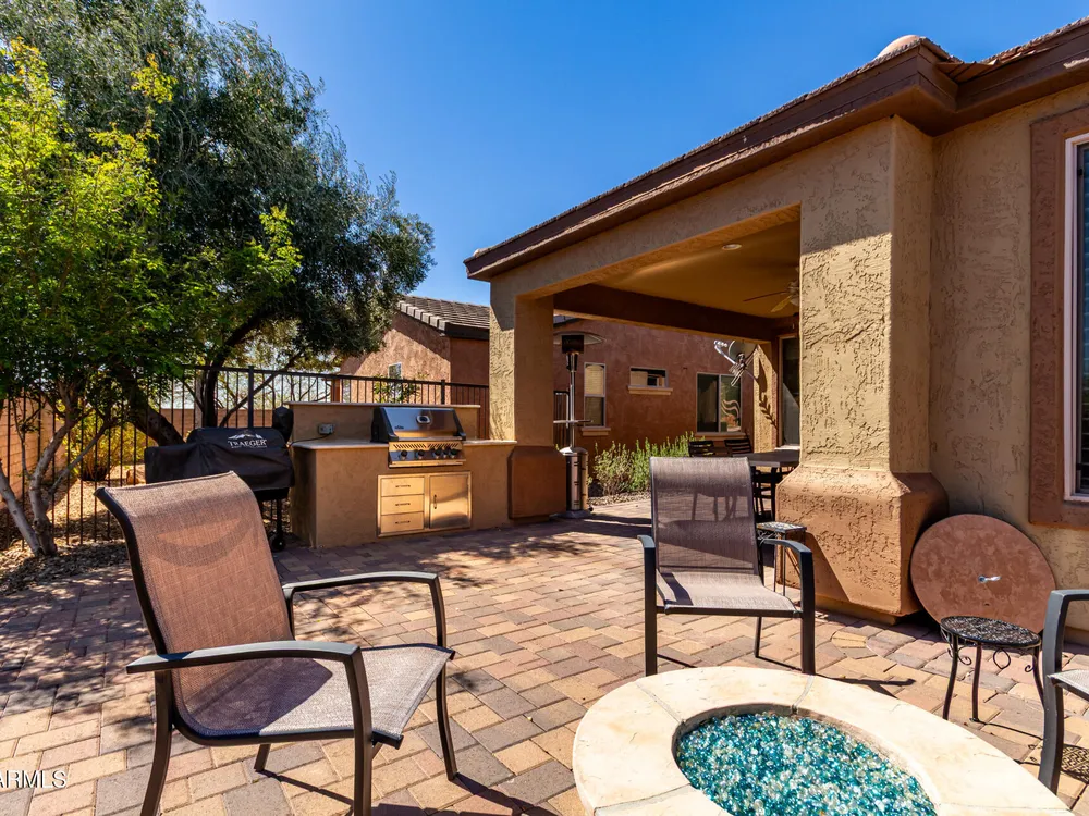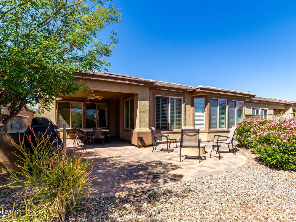 RESORT STYLE LIVING IN SOUGHT-AFTER ACTIVE ADULT COMMUNITY OF TRILOGY AT VISTANCIA! ENERGY SAVINGS - SOLAR PANELS OWNED AND PAID IN FULL! NEW HVAC SYSTEM IN 2022! This beautiful home features 2 Bedrooms with a private Den, 2 Baths, open concept Great Room/Kitchen area, high ceilings, quartz countertops, upgraded shutters & shades, upgraded tile and luxury vinyl plank flooring, large Primary Bedroom with bay window, Murphy Bed at Guest Bedroom, surround sound speakers, reverse osmosis, water softener, extended length garage with new epoxy flooring, utility sink, and cabinets. Relax and entertain in the private front courtyard with pergola or the spacious back patio with built-in BBQ. Enjoy beautiful sunrises from the back patio & serene evenings by the outdoor fireplace. Must see!