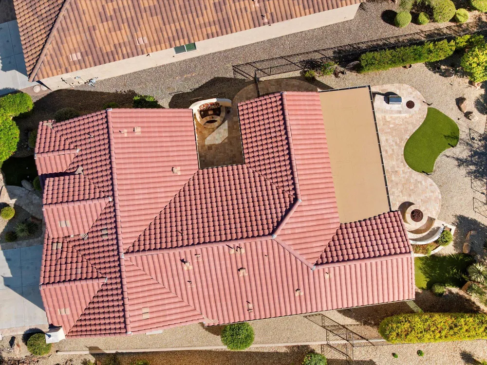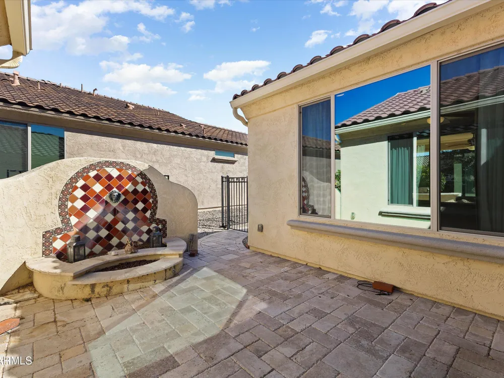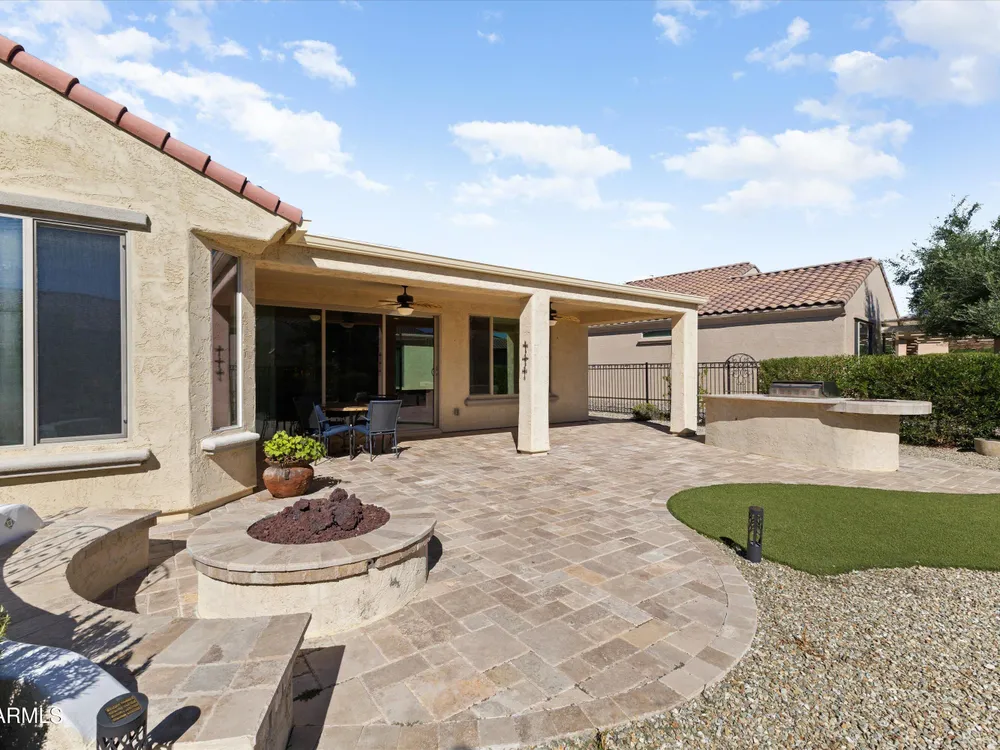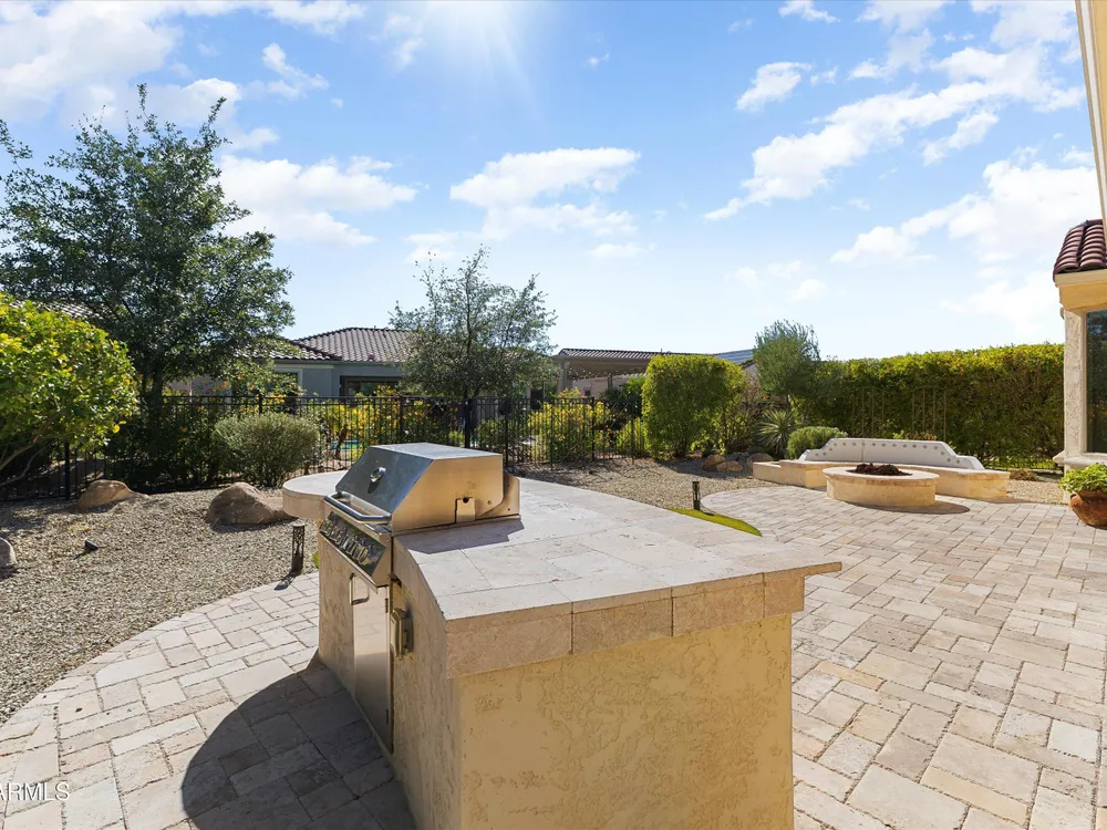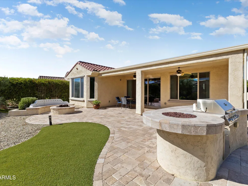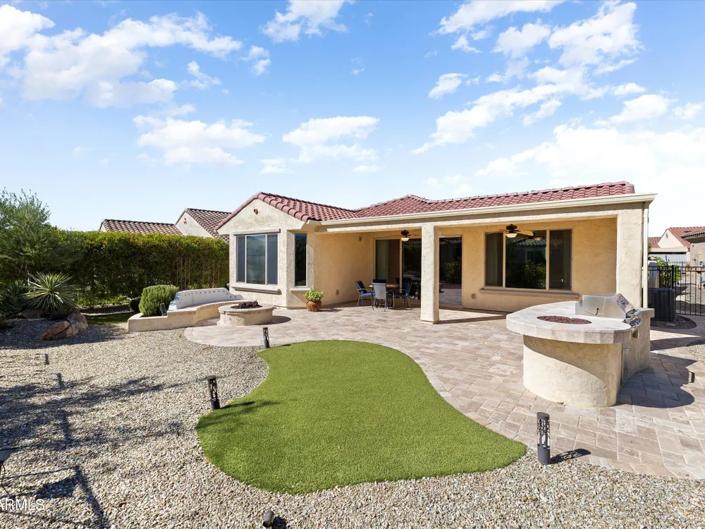 Exceptional Haven model featuring 2 Bedrooms, 2 Baths & Den with stunning upgrades throughout! Split Bedroom design for added privacy. Showcasing Brazilian Quartz & Onyx countertops, upgraded cabinetry, diagonal tile flooring throughout—no carpet!—and an upgraded tiled shower in the primary bath. The spacious primary suite offers a huge walk-in closet, while the laundry room includes a utility station with sink. Outdoor living shines with built-in grill, two fire pits, sitting bench & view-fenced yard. Garage includes built-in cabinets, sink & service door. Enjoy resort-style living in the award-winning active adult community of Sun City Festival!