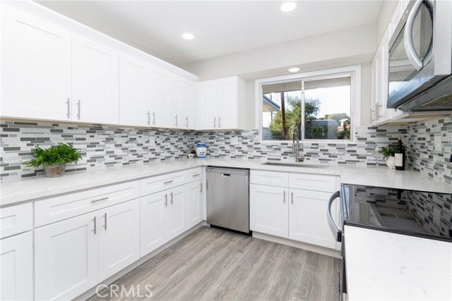 Charming and remodeled! Experience the best of senior living in this bright 55+ single-story home. Features include stylish new flooring and neutral paint throughout. The upgraded kitchen is a chef's delight with quartz counters, backsplash and stainless appliances, flowing into a cozy living area and a flexible den. The bathroom features a modern vanity and a beautiful tiled shower-tub combo. Enjoy the convenience of a separate laundry room and a massive attached storage area. Roof is new!