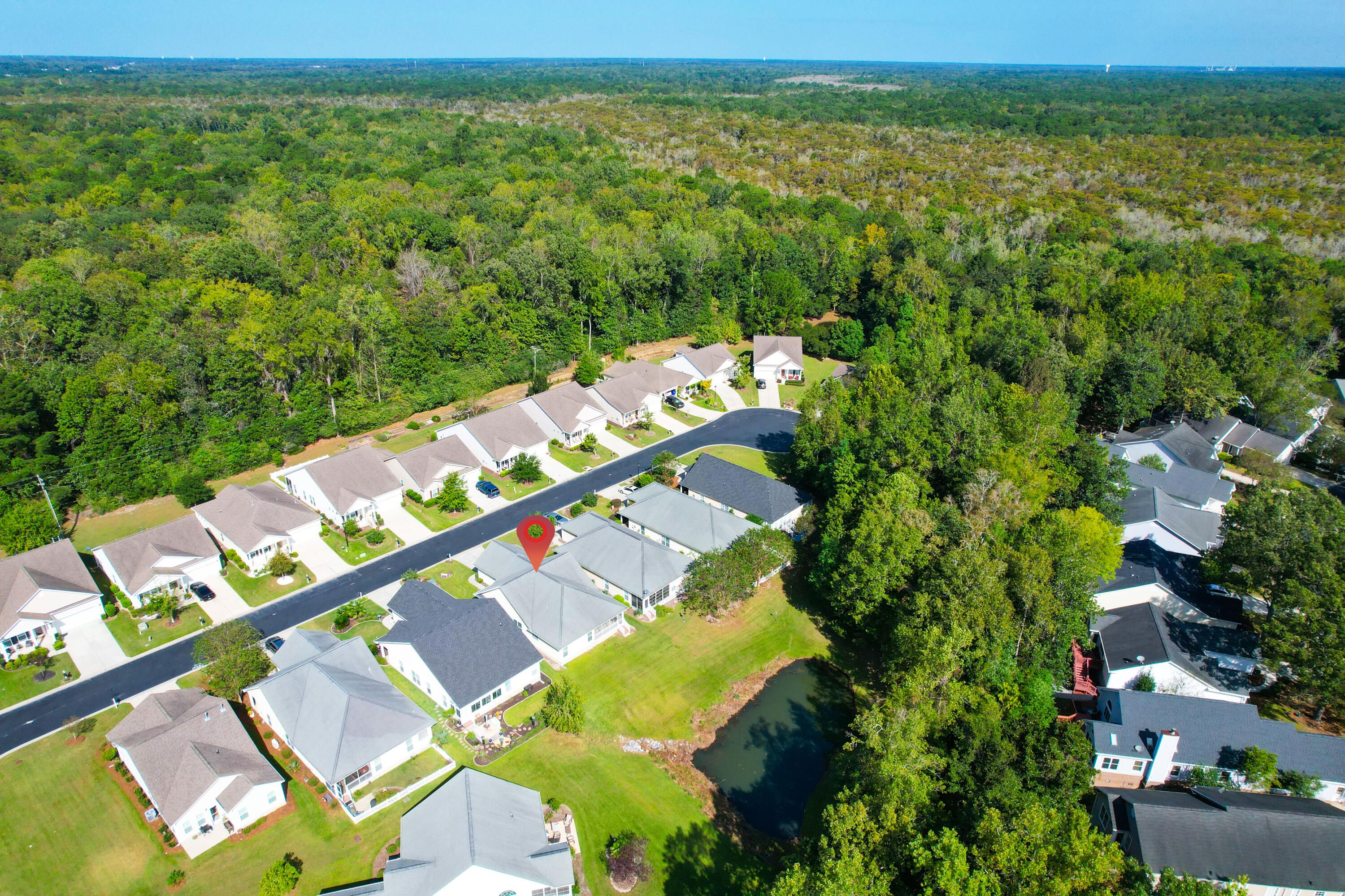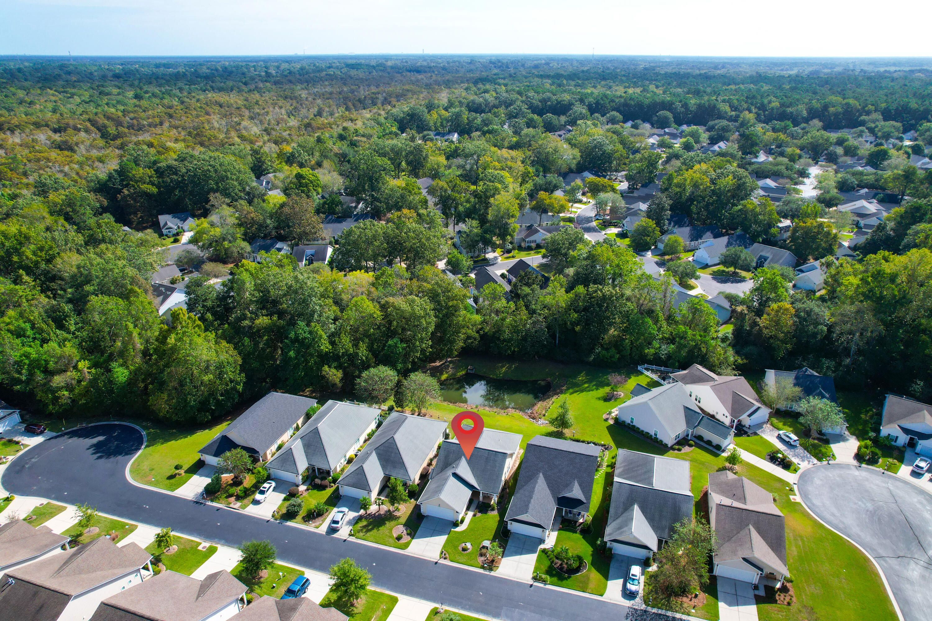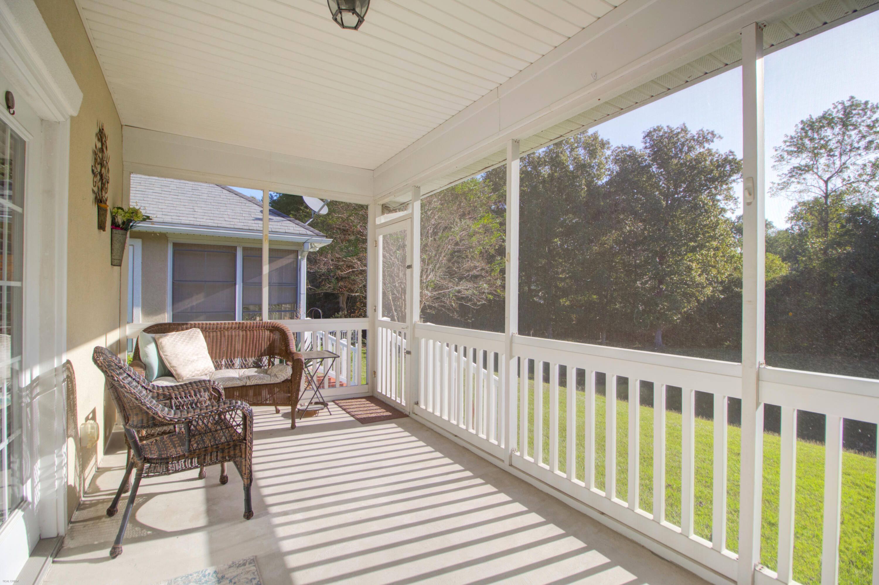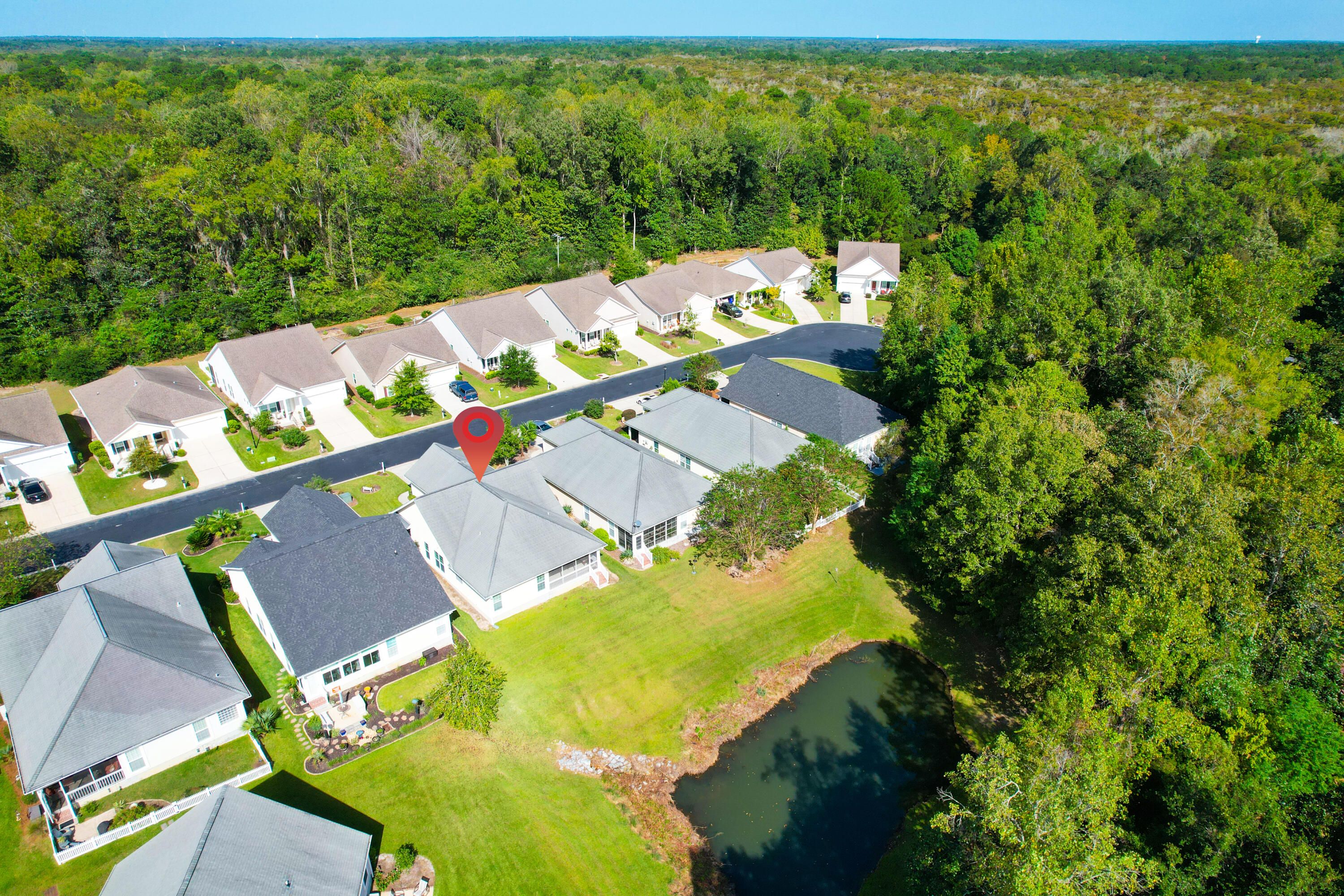 This warm & welcoming home in The Elms of Charleston, a premier 55+ gated community, is on a quiet street with no thru traffic - culs de sac on both ends. The home backs to a pond & woods, set back from the street, full front porch, rear screened porch overlooking the pond and mature trees. The interior is very comfortable with large living areas & bedrooms, a kitchen well suited for cooking & entertaining, or just enjoying casual dining in the bright & charming breakfast area. All rooms are spacious & light-filled: living/dining rm, large kitchen, owner's suite w/ walk-in closet and access to screen porch, 2 add'l good-sized bedrooms, laundry rm (w/ utility sink), & 2-car garage. A wonderful home for entertaining, house guests, and enjoyment of the screened porch in privacy.A wonderful home for entertaining, house guests, and enjoyment of the screened porch in privacy. The community has been well maintained and the landscaping continues to grow. The Elms of Charleston also has a number of amenities to choose from: Clubhouse, Pool, Tennis and Pickleball Courts. No traffic noise, close to shopping, dining, medical care, airport, downtown Charleston, & the Islands. It is an ideal 55+ Community with all the comforts of home, both inside and out. And it is move-in ready.