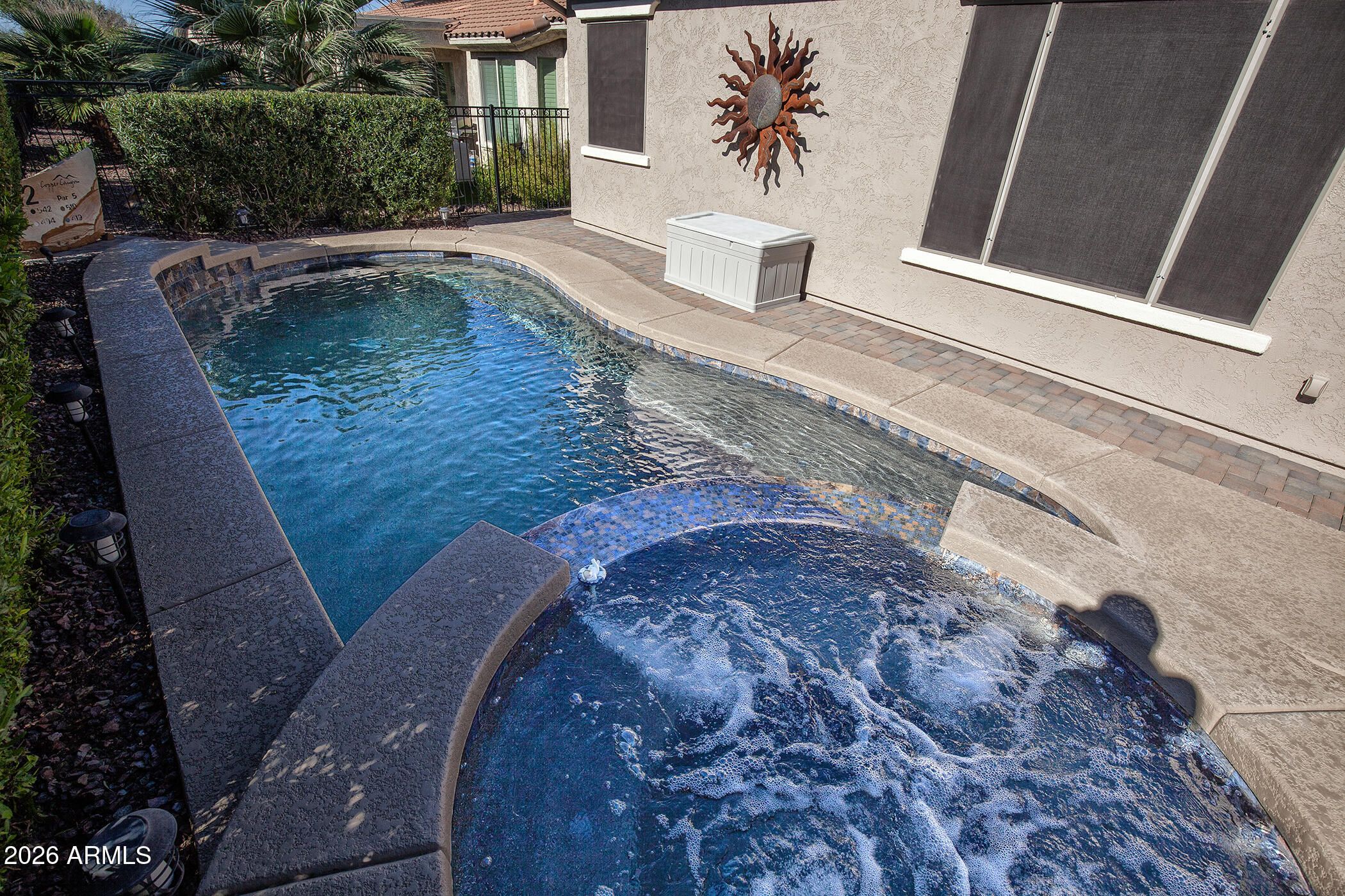 Welcome to your Dream Home in Sun City Festival. This Fiesta Model features over $160,000 in owner-selected upgrades & provides 2,323 sq ft of LUXURY LIVING on a private corner lot. The backyard is a true oasis, complete with Thunderbird Heated Pool & Spa. The home features tile flooring throughout, with both bathrooms and kitchen having undergone complete remodels. A newly painted exterior, gated courtyard featuring pavers, & a Polyspartic-coated driveway all contribute to outstanding curb appeal. Desert Landscaping & new Breeze Door lead to an INVITING, MOVE-IN ready interior. The open floor plan allows for comfortable living, while guests enjoy private quarters with an elegant walk-in shower. The kitchen features granite countertops, backsplash, breakfast bar, center island w/ storage, under-cabinet lighting, pull-out shelves, wall oven, SS appliances, granite sink, & reverse osmosis. The spacious owner's suite includes a sitting area & glass doors providing direct access to the backyard pool. The en suite bath features a tiled, frameless glass shower, jetted tub, double sinks, and walk-in closet. A versatile den/office with French Doors offers a quiet workspace. The great room opens to a private, fenced backyard highlighted by a covered patio, relaxing pool/spa, & lush landscaping with fruit trees. Additional amenities include a laundry room with extra cabinetry, counterspace, & sink. The 3-car garage has epoxy floors, built-in cabinets, overhead storage, new garage door rollers, & solar-powered attic fans. Recent updates include a new HVAC system (2020), NuVo H2O water softener (2020), & water heater (2024). Interior cabinets, doors & trim were all recently painted. Conveniently located near the Sage Recreation Center with all the World Class Amenities Sun City Festival provides, this property presents an excellent opportunity to begin Living your Dream Life. Don't miss out on this Beautiful Property!