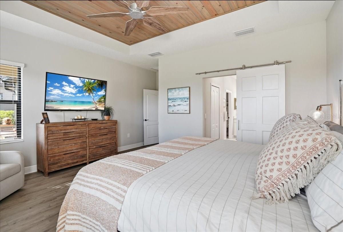 - Ceiling Fan(s), Eat-in Kitchen, High Ceilings, Open Floorplan, Main Level Primary, Solid Surface Counters, Tray Ceiling(s), Walk-In Closet(s), Wet Bar, Window Treatments