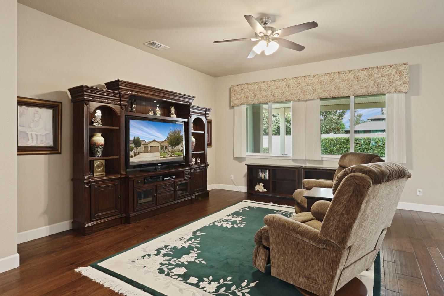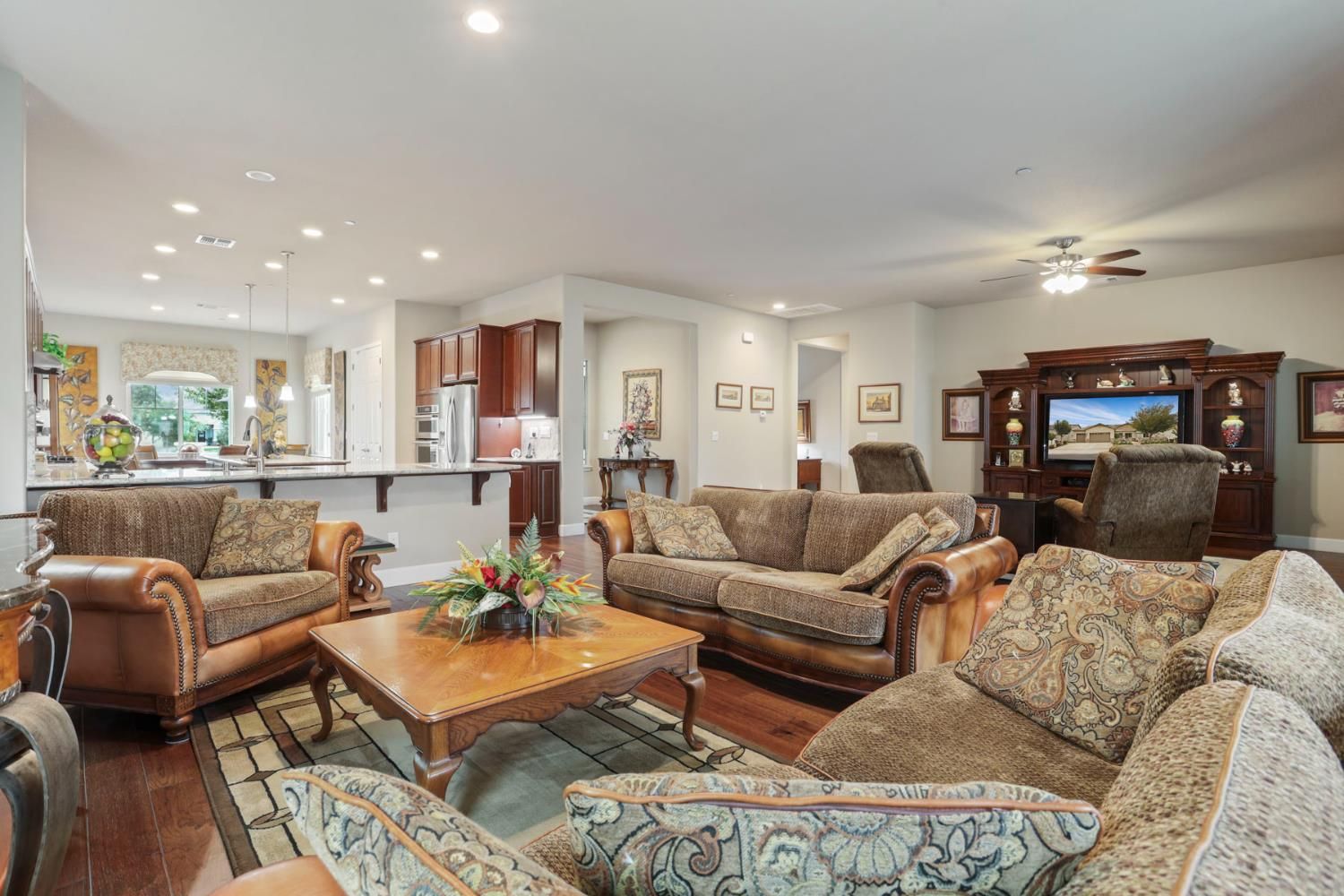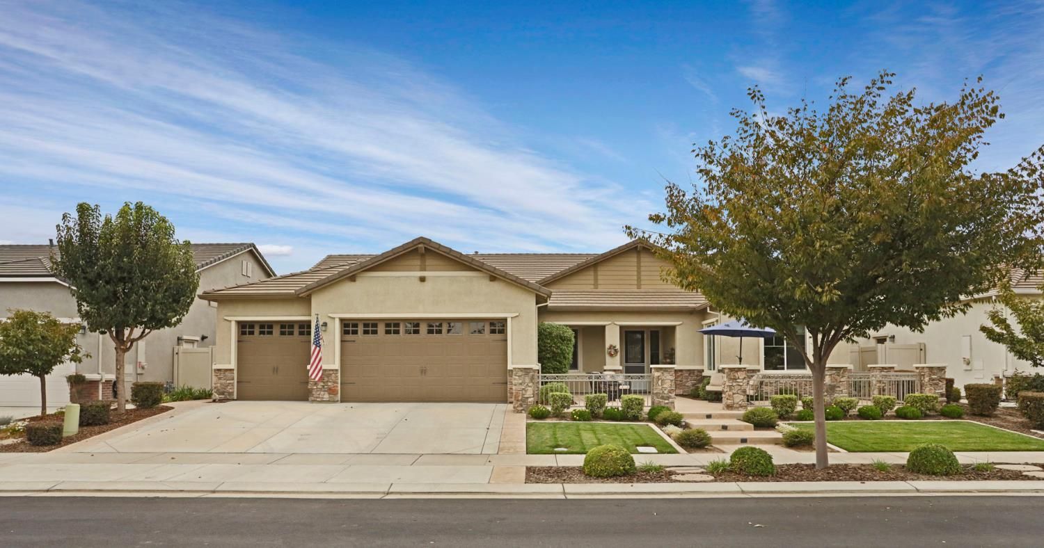 Rare 3-car garage home in the highly desirable 55+ Del Webb Woodbridge community! This beautifully upgraded property features custom-built garage cabinetry & workbenchideal for storage and projects. Enjoy peace of mind with an owned 8-panel solar system and a whole-home Generac automatic generator. Inside, you'll find top-grade wood floors, crown molding, and a spacious hearth room filled with natural light. The kitchen offers granite counters, ample cabinetry, and a large walk-in pantry. Den includes a custom built-in cabinet with Murphy bedgreat for guests or office space. The primary suite features crown molding, automated Hunter Douglas Roman shades, patio access, California organization in Walk in closet and large safe. Two walk-in storage closets, water softener, and tankless water heater add convenience. Washer, dryer, Refrigerator, family room TV and Entertainment center, patio furniture, and guest room furnishings included. Relax on the covered patio with extended pergola or sip coffee from the front courtyard with views of Liberty Park. Resort-style amenities include clubhouse, indoor/outdoor pool, gym, pickleball, walking trails, clubs & more.