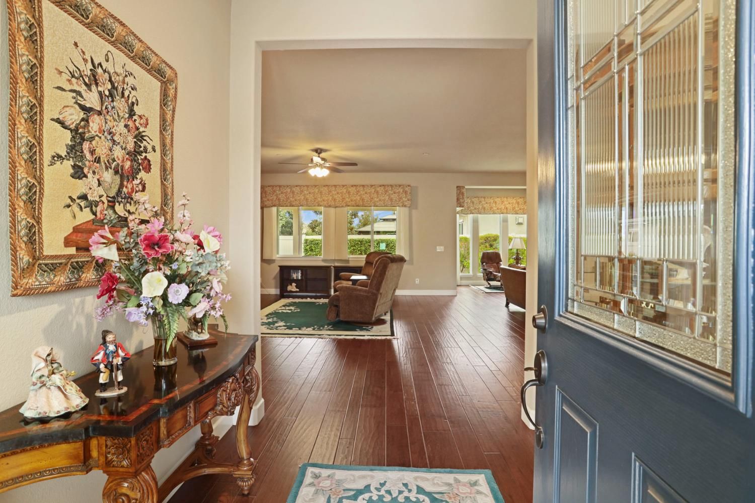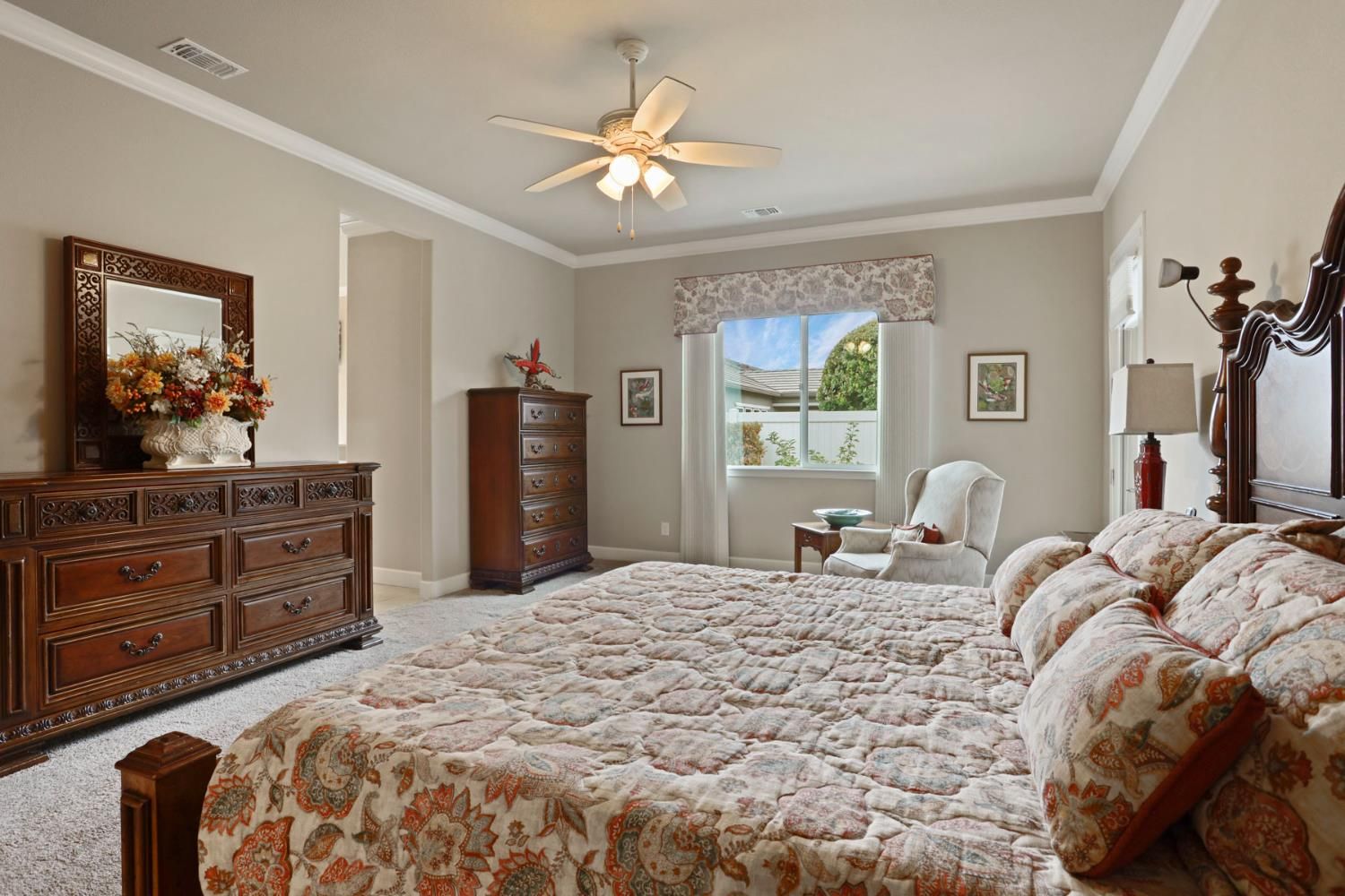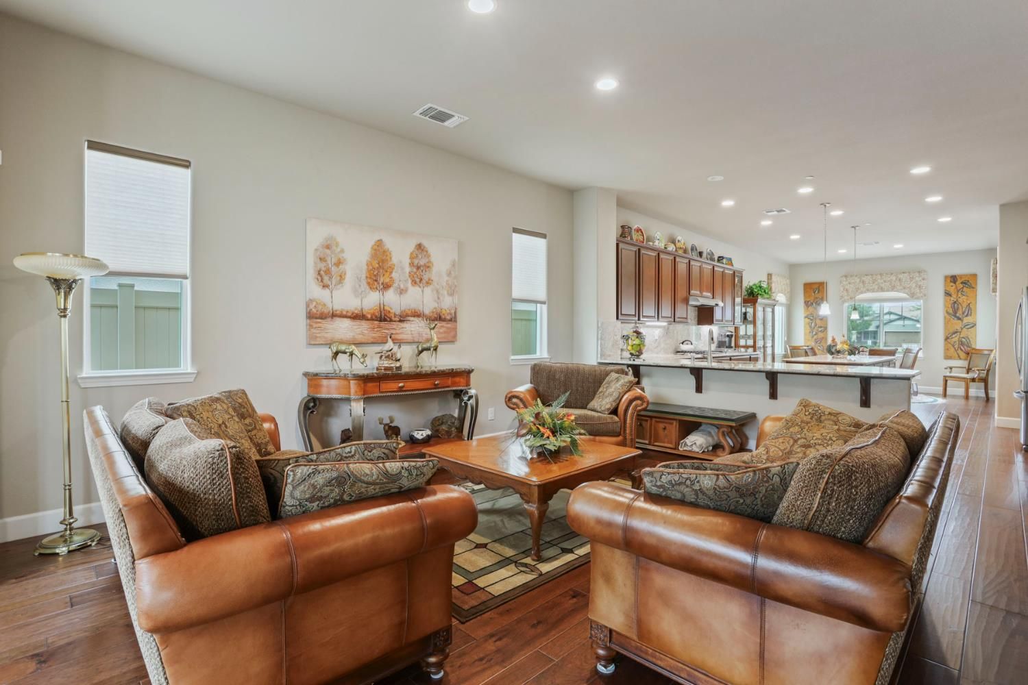 Rare 3-car garage home in the highly desirable 55+ Del Webb Woodbridge community! This beautifully upgraded property features custom-built garage cabinetry & workbenchideal for storage and projects. Enjoy peace of mind with an owned 8-panel solar system and a whole-home Generac automatic generator. Inside, you'll find top-grade wood floors, crown molding, and a spacious hearth room filled with natural light. The kitchen offers granite counters, ample cabinetry, and a large walk-in pantry. Den includes a custom built-in cabinet with Murphy bedgreat for guests or office space. The primary suite features crown molding, automated Hunter Douglas Roman shades, patio access, California organization in Walk in closet and large safe. Two walk-in storage closets, water softener, and tankless water heater add convenience. Washer, dryer, Refrigerator, family room TV and Entertainment center, patio furniture, and guest room furnishings included. Relax on the covered patio with extended pergola or sip coffee from the front courtyard with views of Liberty Park. Resort-style amenities include clubhouse, indoor/outdoor pool, gym, pickleball, walking trails, clubs & more.