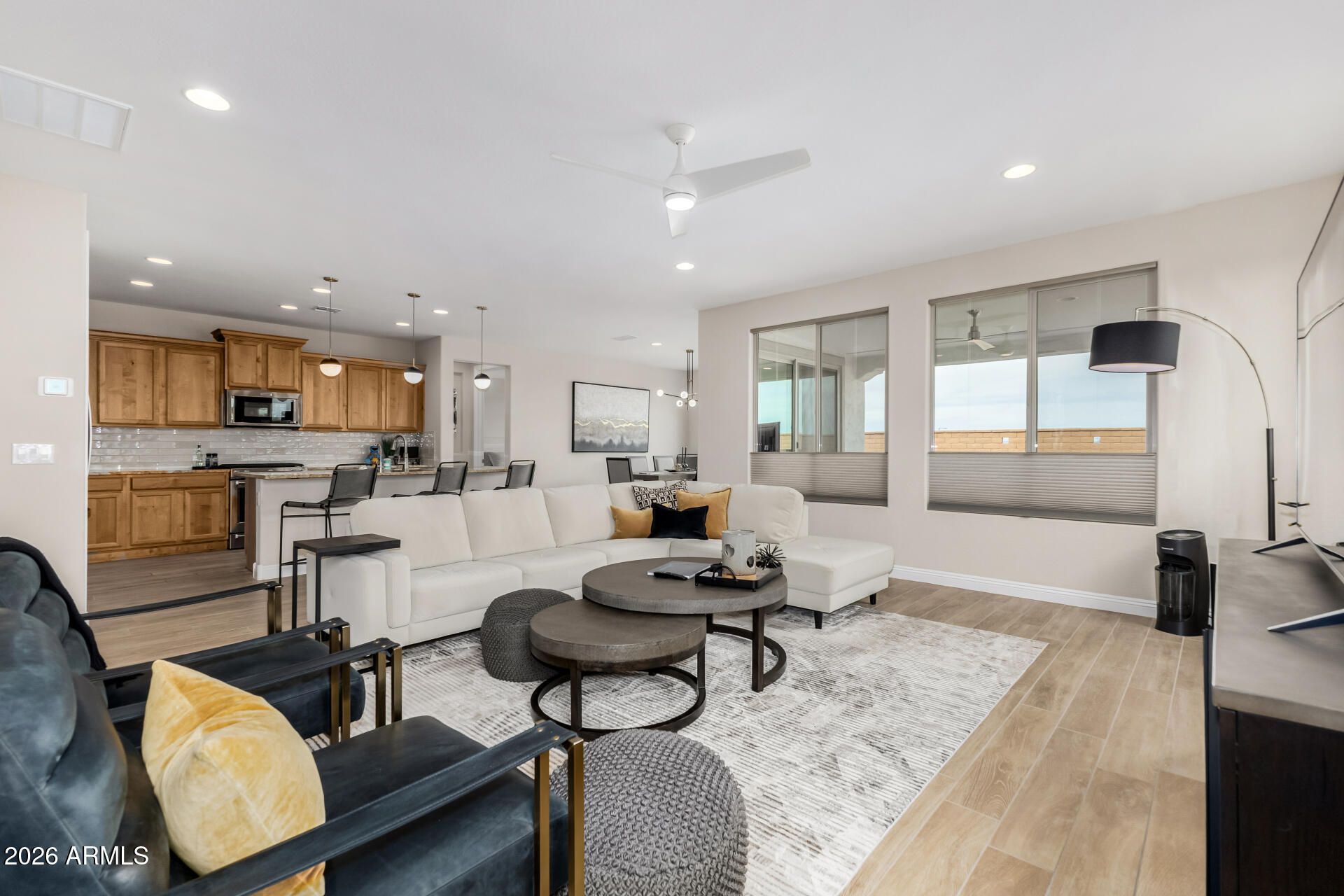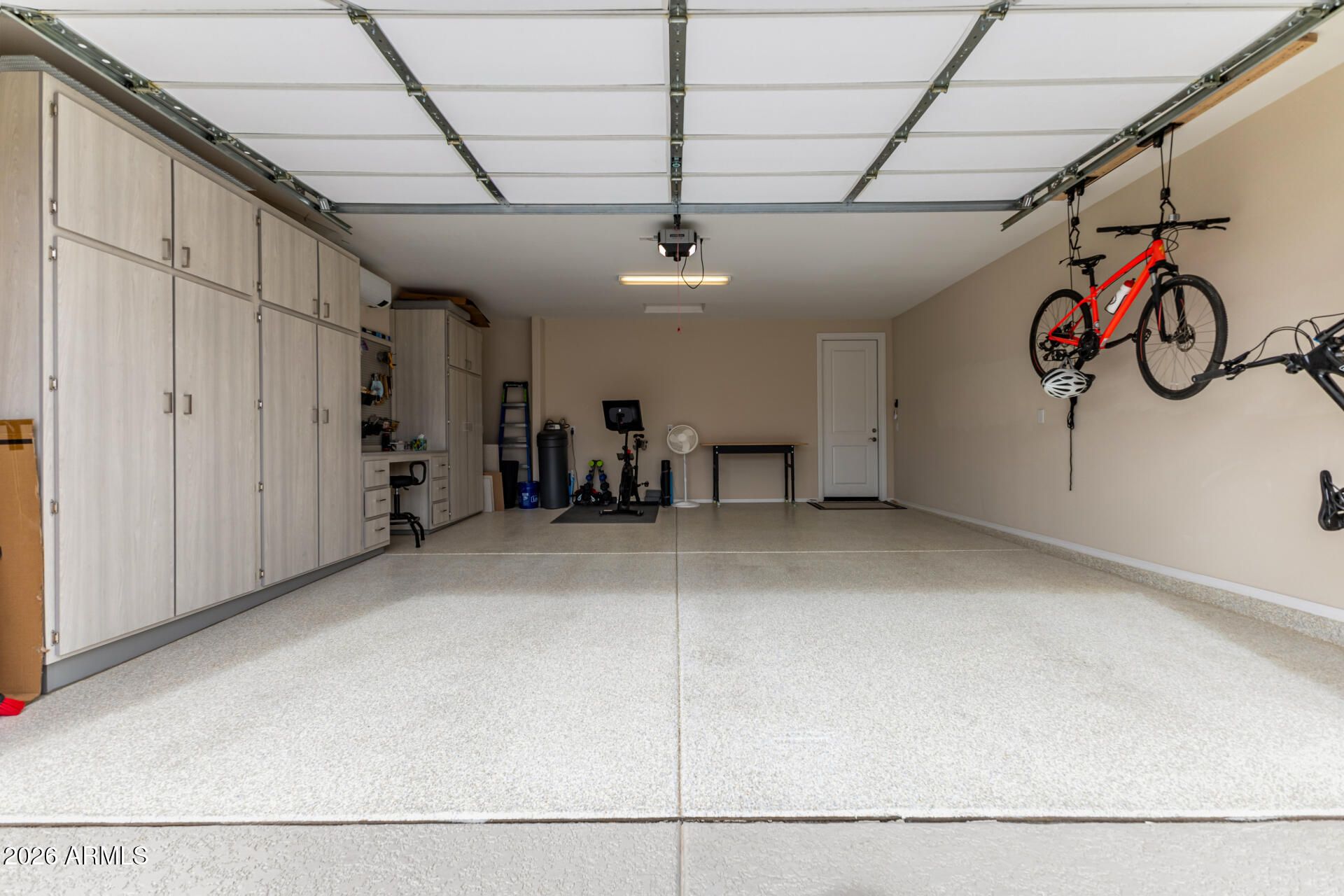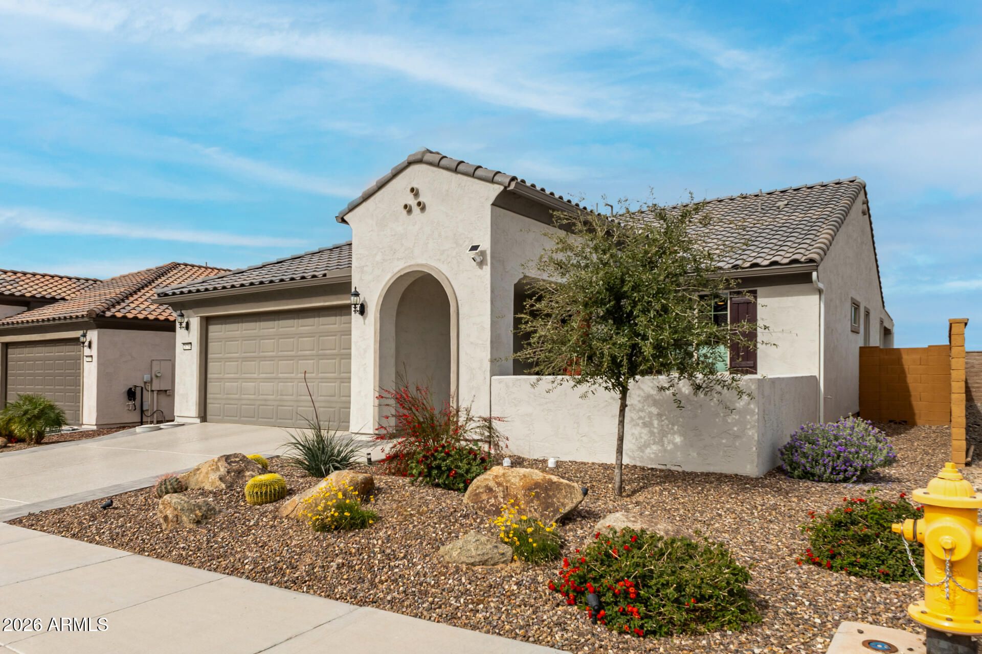 Welcome to this gorgeous home boasting beautiful sunsets and mountain views. This Sanctuary model is nearly new and barely lived in. This walled lot boasts privacy. Cool decking on the driveway and entry enhance the homes curb appeal along with the comforting front patio. The spacious 2 car garage with epoxy coated floor, new storage cabinets and built in work bench is fully insulated and has an HVAC mini split. The Back yard is private with a covered patio, putting green, barbeque area and is beautifully landscaped. An expansive open floorplan amazes with Birdseye maple cabinets, granite, stainless steel kitchen aid gas range, microwave and dishwasher. Upgraded ceiling fans, Hunter Douglas blinds, soft water loop, reverse osmosis, 8'doors and walk in pantry make this home stand out.