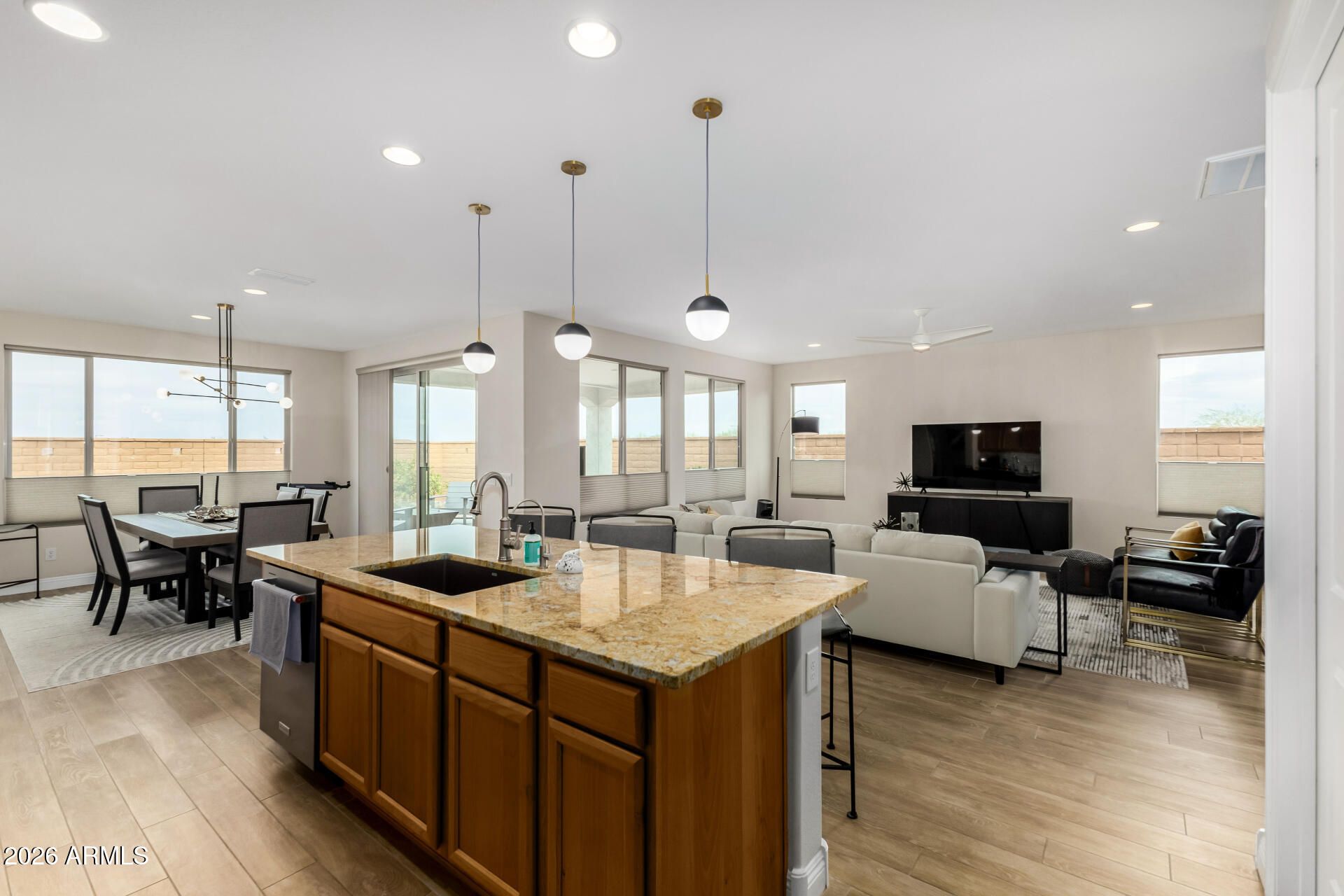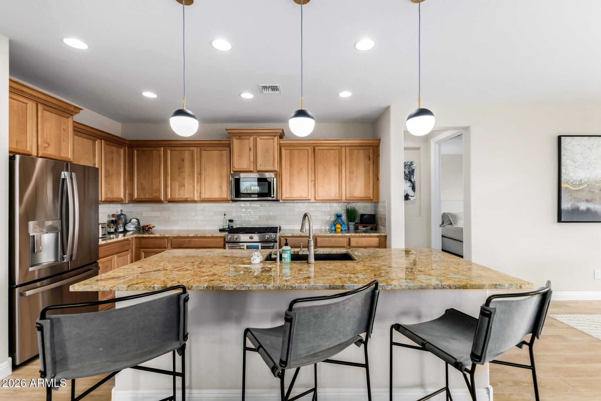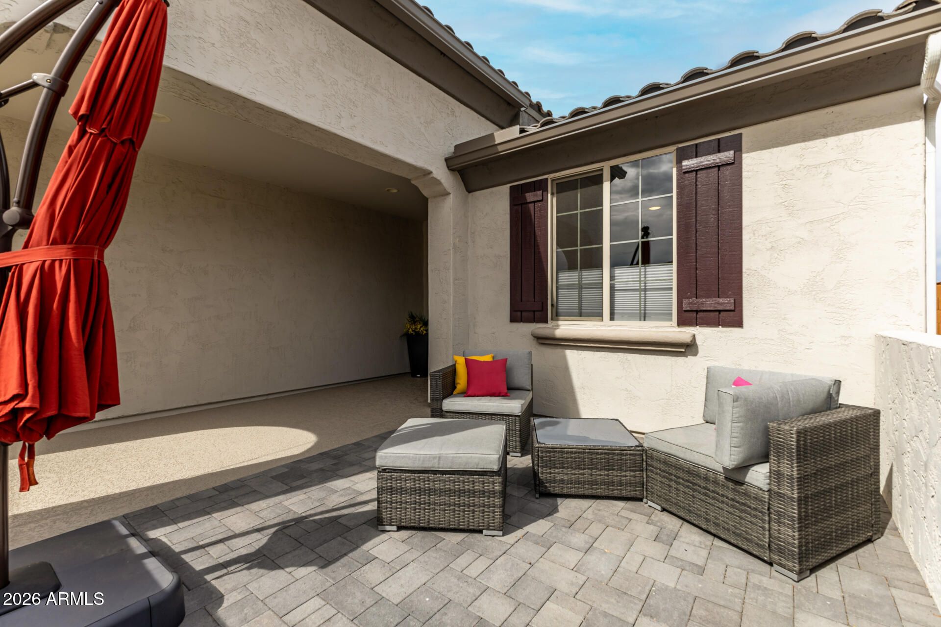 Welcome to this gorgeous home boasting beautiful sunsets and mountain views. This Sanctuary model is nearly new and barely lived in. This walled lot boasts privacy. Cool decking on the driveway and entry enhance the homes curb appeal along with the comforting front patio. The spacious 2 car garage with epoxy coated floor, new storage cabinets and built in work bench is fully insulated and has an HVAC mini split. The Back yard is private with a covered patio, putting green, barbeque area and is beautifully landscaped. An expansive open floorplan amazes with Birdseye maple cabinets, granite, stainless steel kitchen aid gas range, microwave and dishwasher. Upgraded ceiling fans, Hunter Douglas blinds, soft water loop, reverse osmosis, 8'doors and walk in pantry make this home stand out.