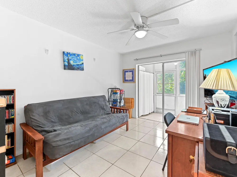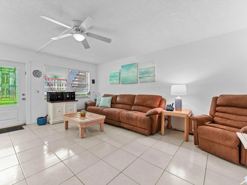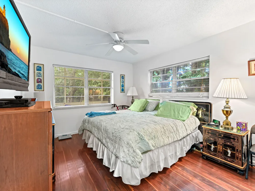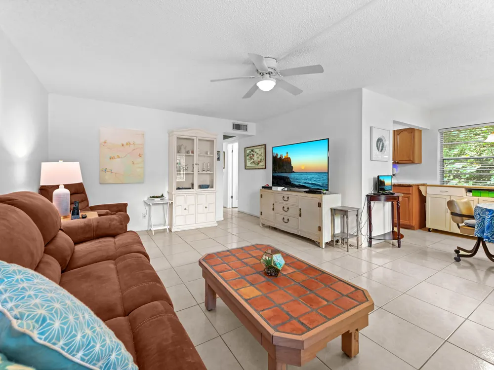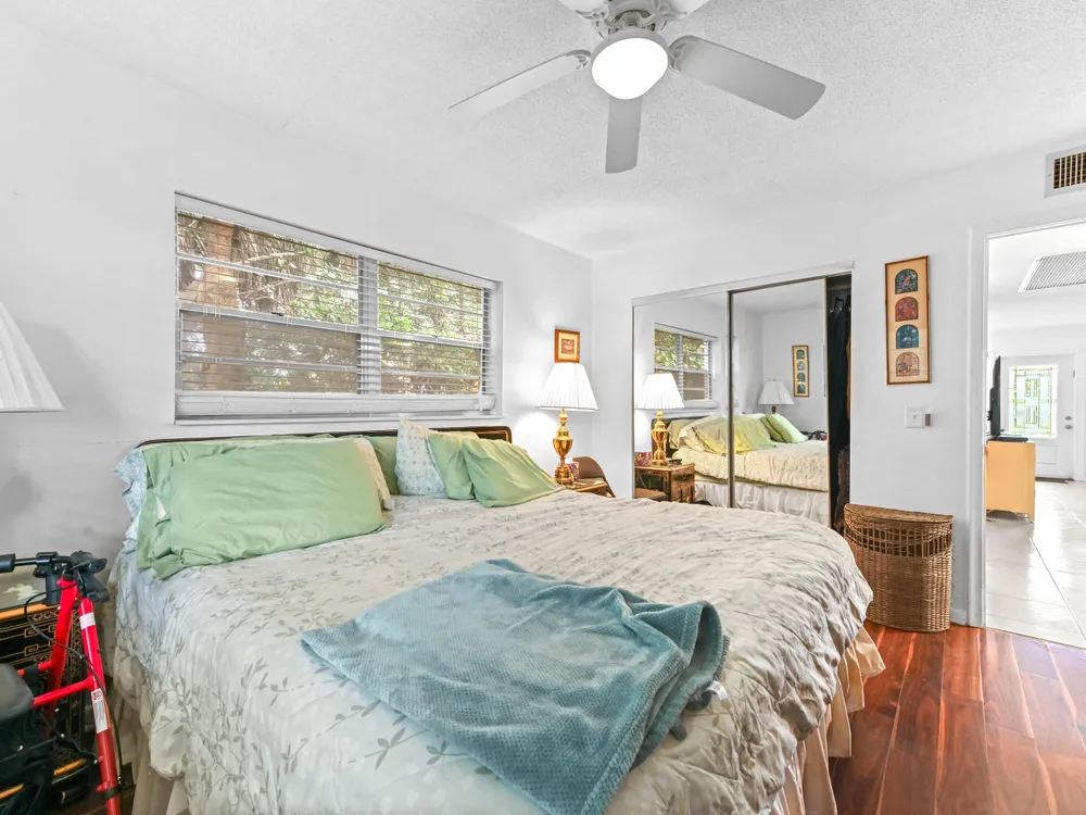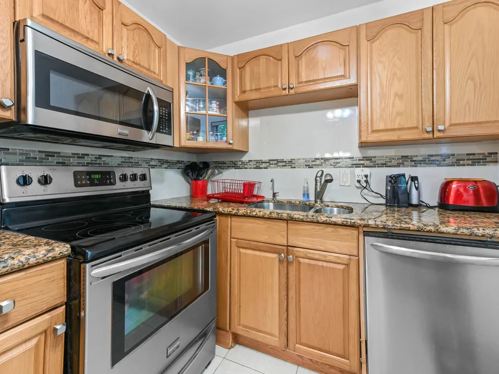 Welcome to this first floor corner unit that features a bright and cozy living space with neutral tile flooring, leading seamlessly into the main areas. The kitchen is a standout, with warm wood shaker-style cabinets, rich granite countertops, and sleek stainless steel appliances, including a microwave and range. The master suite offers a luxurious sanctuary, distinguished by its rich, dark wood-style flooring and a spacious closet space.