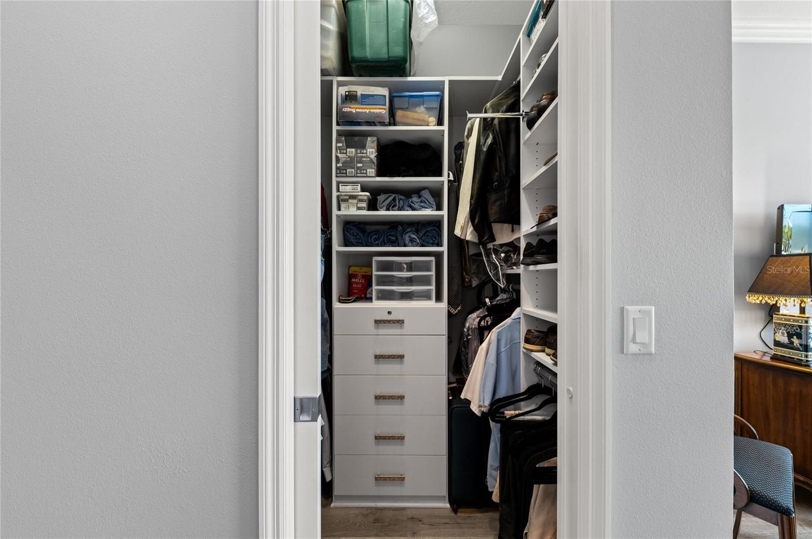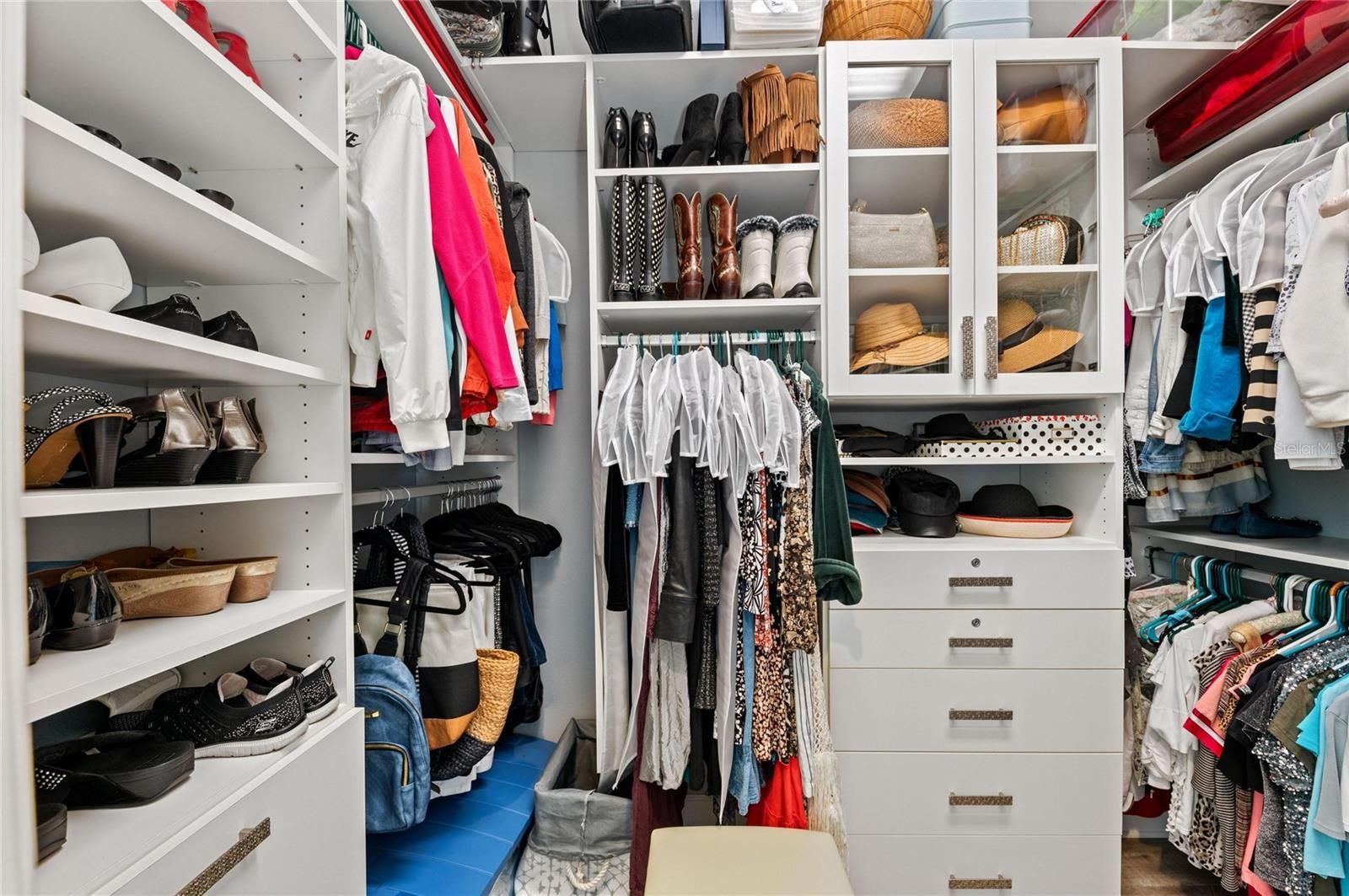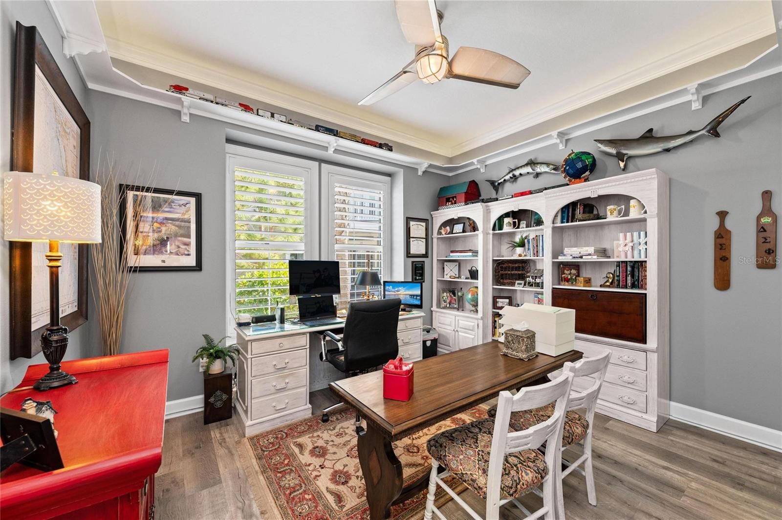 - Built-in Features, Ceiling Fan(s), Crown Molding, Eat-in Kitchen, High Ceilings, In-Wall Pest Control, Open Floorplan, Main Level Primary, Solid-Wood Cabinets, Thermostat, Walk-In Closet(s), Window Treatments