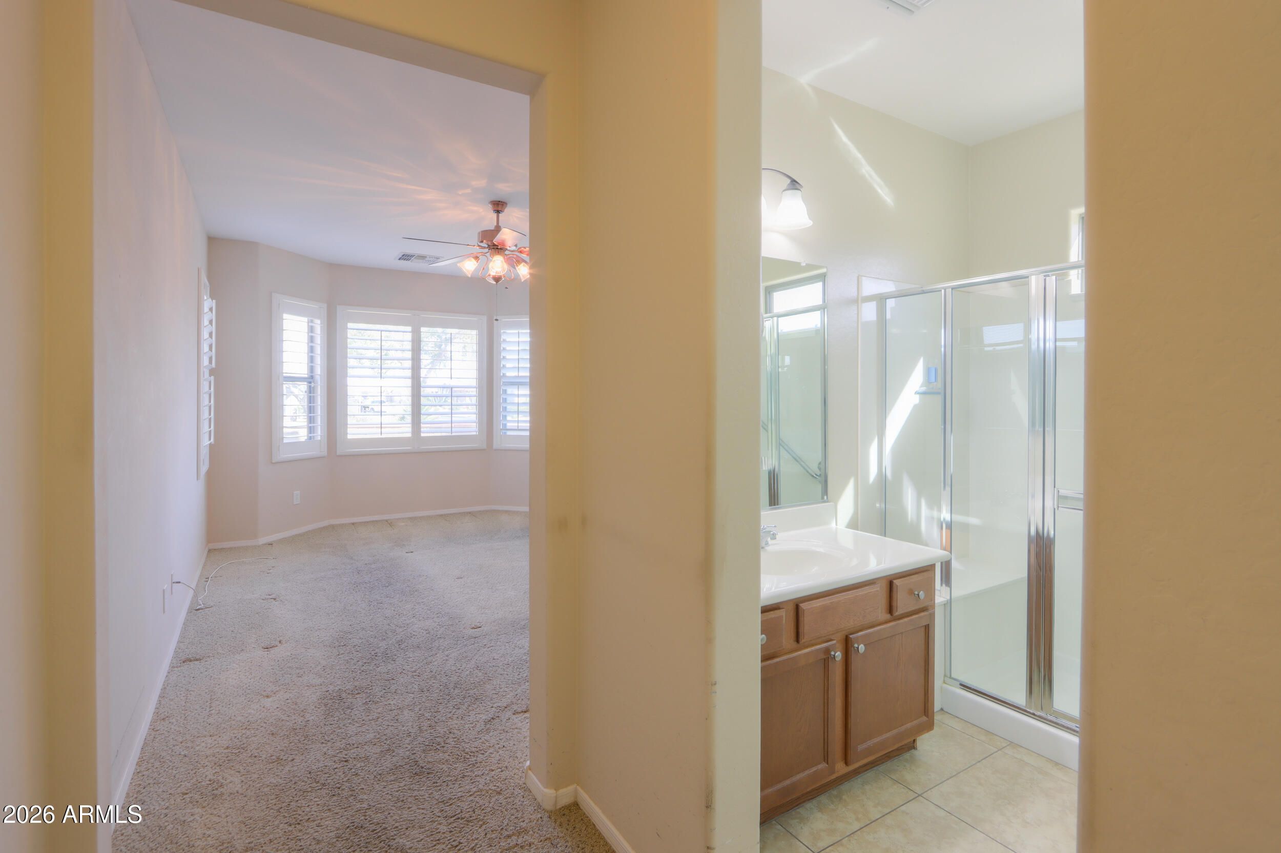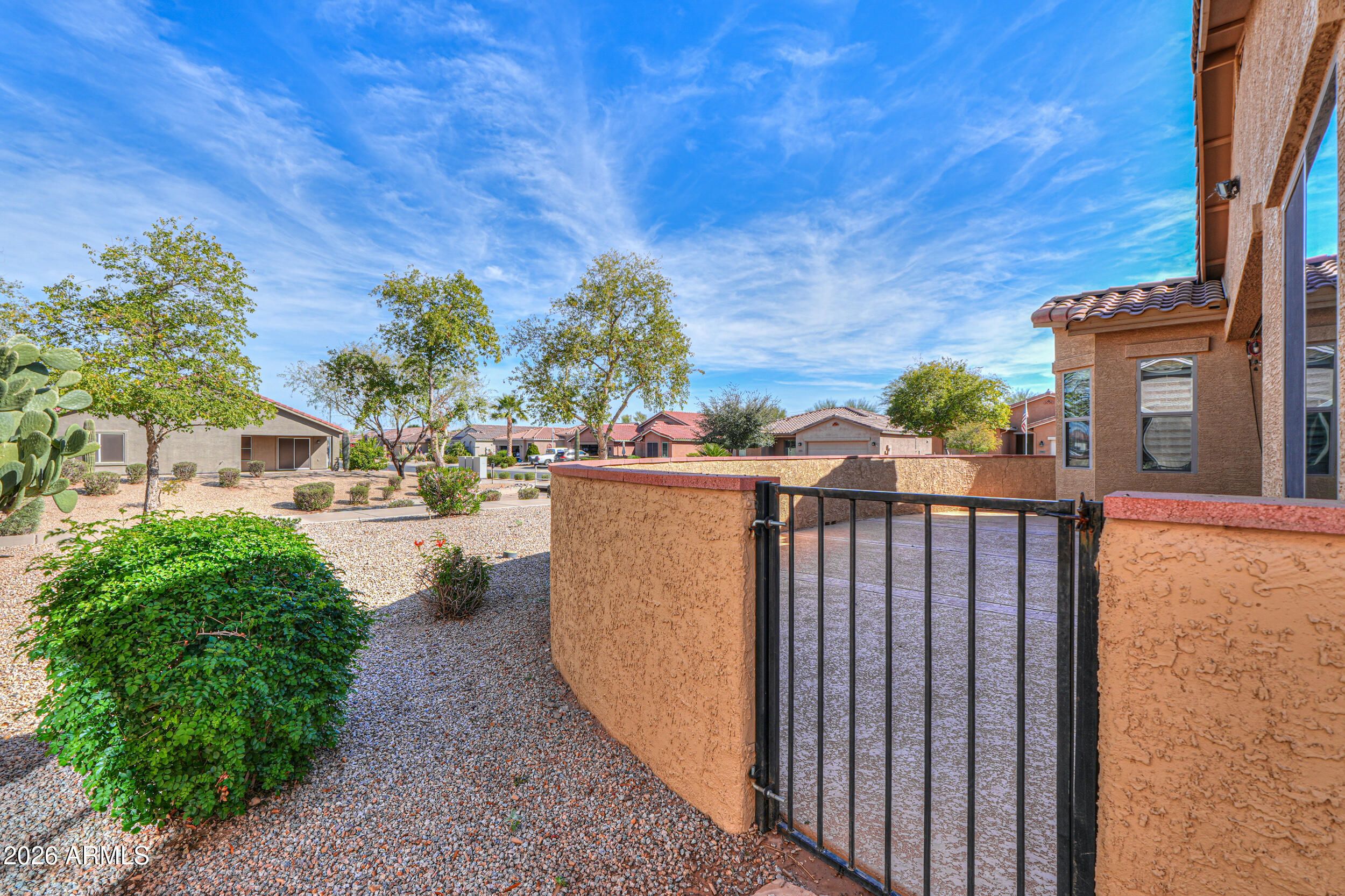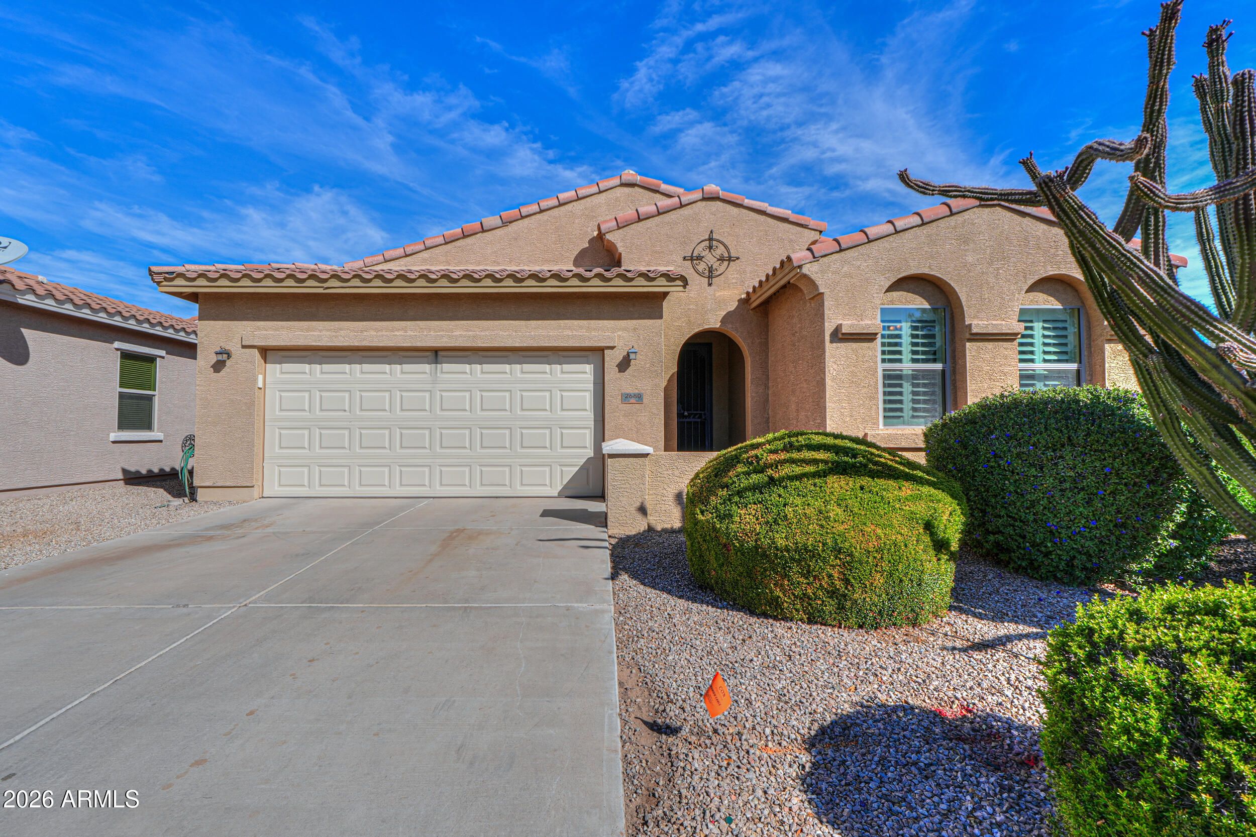 From the moment you arrive, you'll appreciate the inviting arched entry that sets the tone for this charming home. Inside, plantation shutters throughout add privacy, while 18'' tile flooring flow seamlessly through the main living areas. The thoughtfully designed layout offers both functionality & comfort, complemented by ceiling fans throughout to keep things cool year round. The kitchen offers granite countertops & ample workspace. The spacious primary suite & guest bedroom provide comfort & flexibility. Step outside to your north facing, fenced in back patio, ideally positioned along the walking path, a peaceful setting to enjoy your morning coffee or evening sunset while taking in the serene surroundings. Living in Mission Royal means access to an incredible array of resort style amenities, including golf course, beautiful clubhouse, heated community pool & spa, fully equipped fitness center, pickleball courts & a vibrant calendar of activities & social events. Whether you're seeking relaxation, recreation, or an active social lifestyle, this home offers it all in one of the area's premier active adult communities.