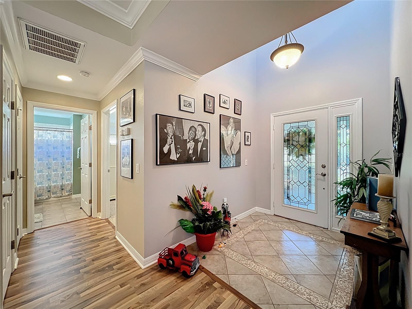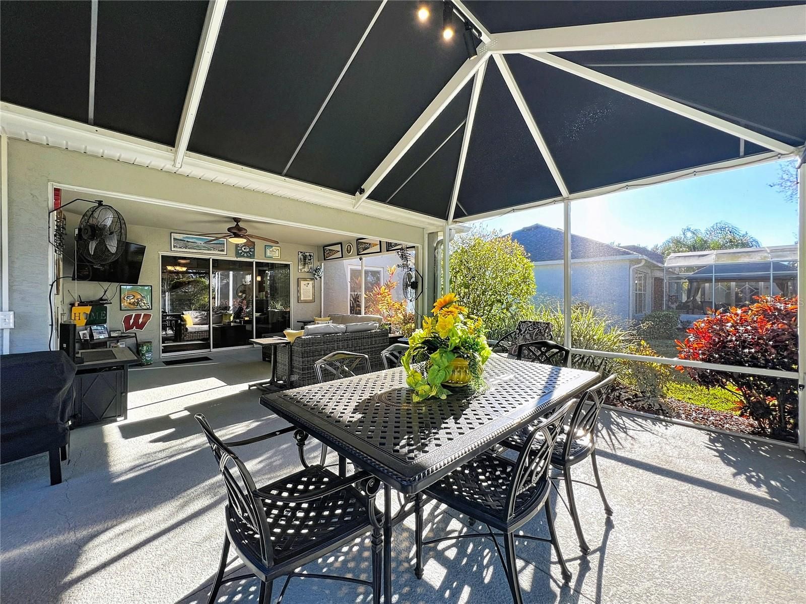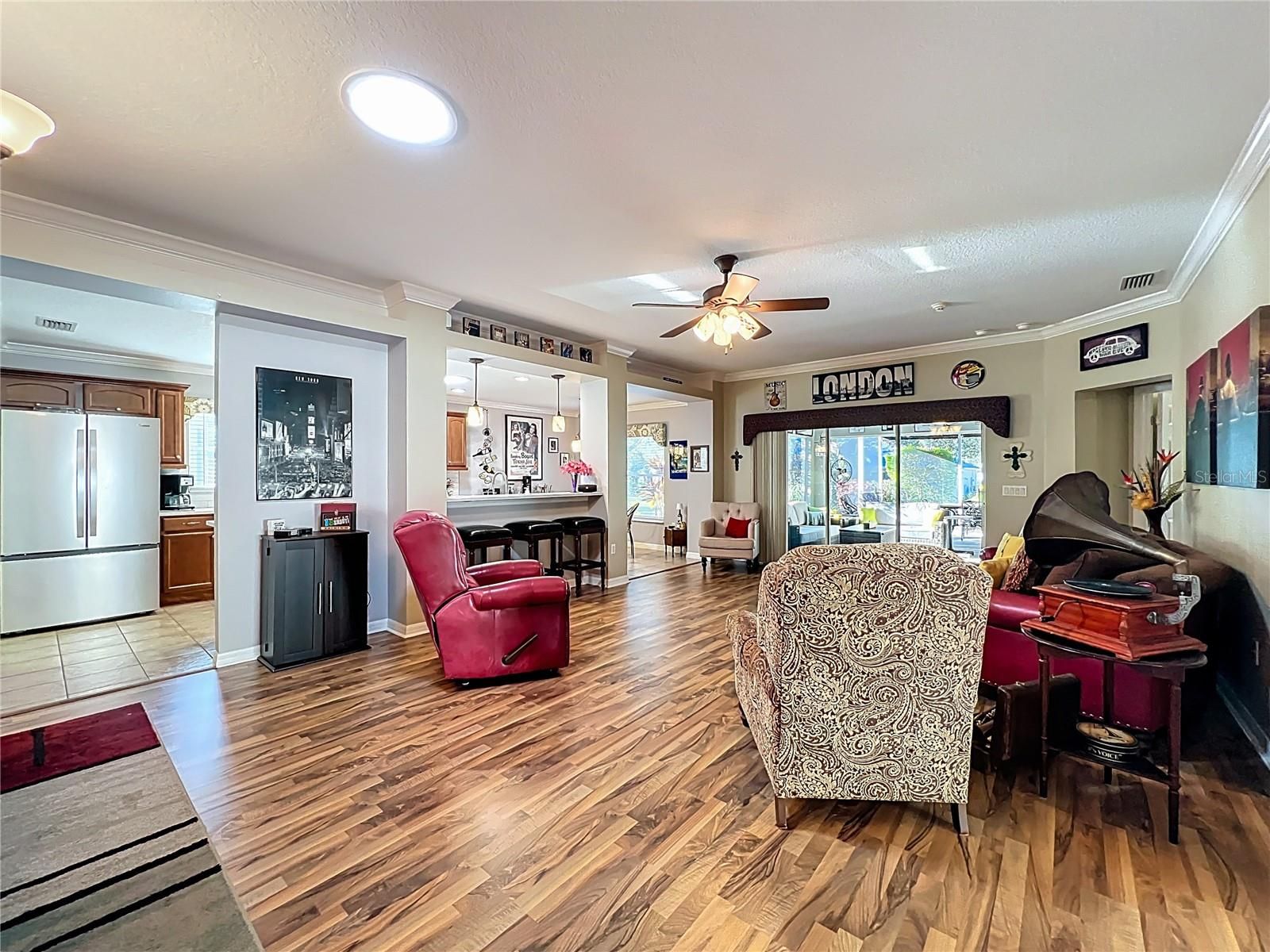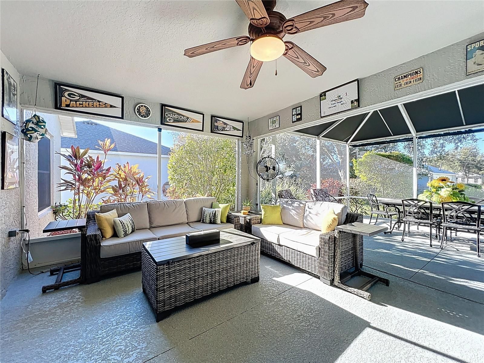 Welcome to this absolutely immaculate home located in the prestigious 55+ community of Arlington Ridge in Leesburg, just a short walk to the clubhouse, restaurant, pool, and all the incredible amenities this community offers. This beautifully maintained residence features 2 bedrooms, 2 baths, and a den/office with double doors, accented by charming tray ceilings and crown molding throughout. The home has been upgraded to perfection and truly shows pride of ownership. Recent upgrades include (2025): • Stunning open kitchen with granite countertops, backsplash, and new refrigerator • Updated bathroom countertops • New slow-close hinges on all cabinetry • Tile floors professionally repaired and sealed • Both showers sealed with permanent protective coating • Solar tubes added in the kitchen and family room for abundant natural light • Fresh interior paint in the kitchen, foyer, and den/office • Garage upgraded with epoxy flooring and refrigerator Additional improvements include new energy-efficient windows (2024), decorative driveway resealed (2023), garage door opener (2022), roof replacement (2020), and water heater (2019). In 2018, laminated wood flooring was installed in the great room and den, along with a motorized garage screen door. Step outside to your expanded outdoor living space — a birdcage with awning and roll-down shades installed in 2020, creating approximately 420 square feet of covered patio, perfect for entertaining, relaxing, or enjoying Florida’s beautiful weather. Friends and family will love visiting! Arlington Ridge is more than a community — it’s a lifestyle. Enjoy a championship 18-hole golf course, heated pool, fitness center, tennis and pickleball courts, billiards, a free movie theater, and an on-site restaurant and tavern. Golf-cart-friendly streets, sidewalks, and manicured landscaping make every stroll a pleasure. With an exceptionally low HOA of just $124/month, residents enjoy lawn care, high-speed internet, Wi-Fi, and over 200 cable channels — leaving you more time to enjoy life with minimal maintenance. Conveniently located near shopping, dining, medical facilities, and just a short drive to Orlando attractions and both Florida coasts’ beaches, this home perfectly blends resort-style living with everyday convenience. Don’t just buy a home — embrace the lifestyle you deserve. Schedule your private showing today and start living your best Florida life at Arlington Ridge.