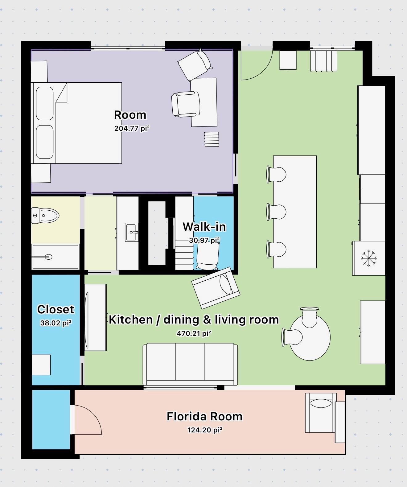 - Entry Level Living Area, Walk-In Closet(s), Living/Dining Room, Snack Bar, Separate Shower