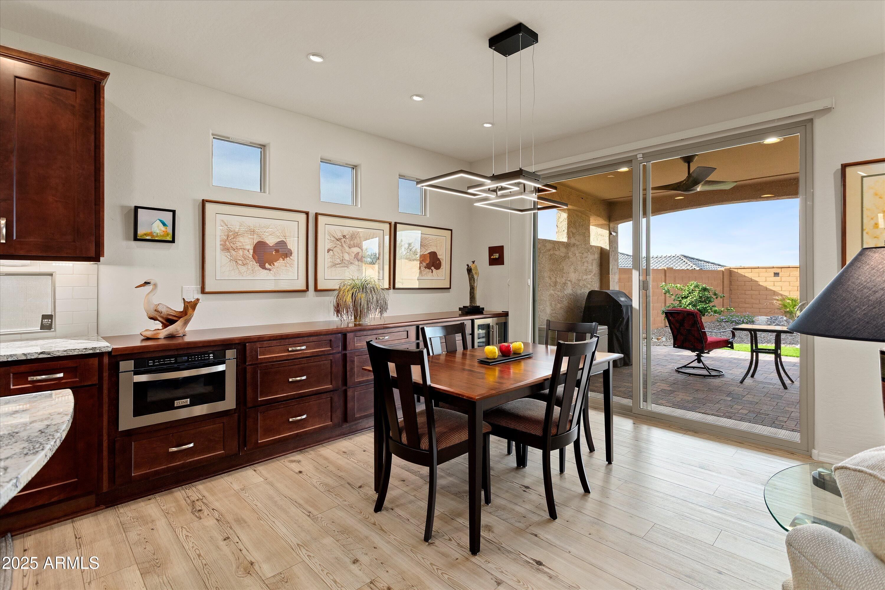 THIS HIGHLY UPGRADED HIDEAWAY MODEL WITH OWNED SOLAR, ON A WALLED LOT, IS A MUST SEE! Enter this thoughtfully designed floor plan with wood like flooring, designer lighting/fans, custom window treatments & Smart Home features throughout! The great room allows you to transition w/ease to the dining area w/ additional cabinets and a 2nd microwave. The kitchen showcases upgraded appliances, Lux Cabinet Layout, custom backsplash & large kitchen Island w/seating. Retreat to the owner's suite & bath w/ no threshold, tile surround shower, granite counters & walk-in closet. The inviting guest room w/ adjacent full bath is perfect for visitors. The laundry room is complete with upper/lower cabinets & utility sink. Step outside to a beautifully landscaped, private, desert oasis!