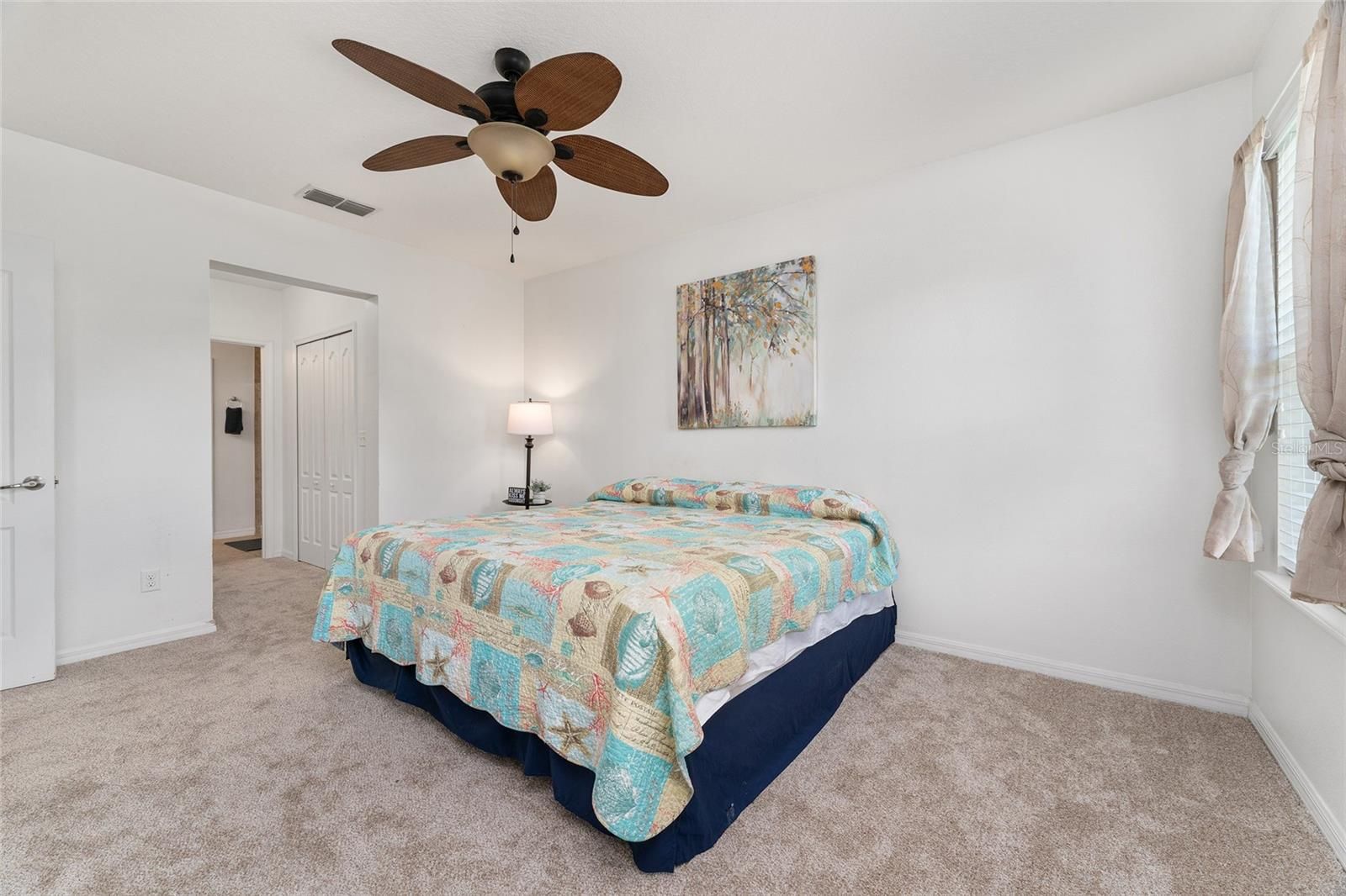 - Ceiling Fan(s), High Ceilings, Open Floorplan, Main Level Primary, Solid Surface Counters, Split Bedrooms, Walk-In Closet(s)