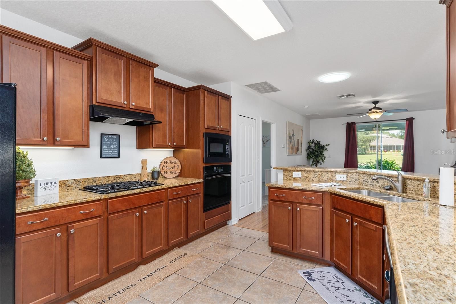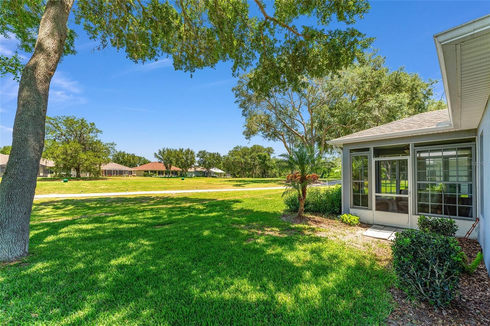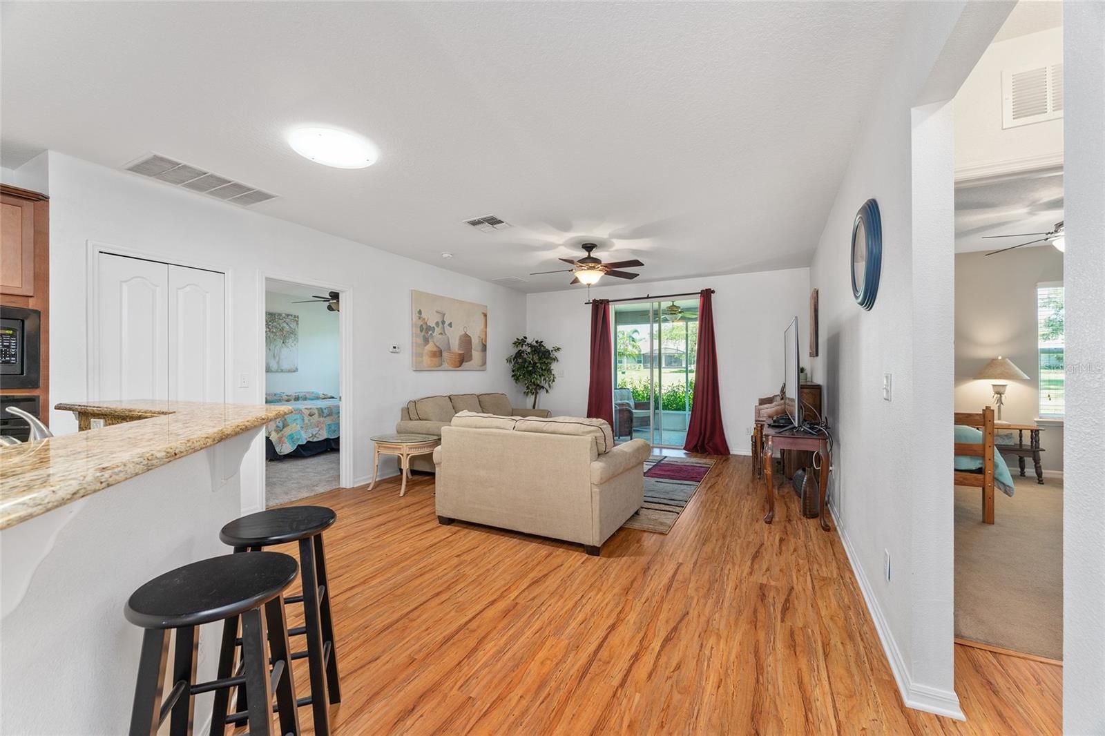 LOCATION, LOCATION! Just steps away from the clubhouse and pool, this exquisite 3-bedroom, 2-bathroom TURN-KEY residence is situated on the 7th tee box within the GATED ARLINGTON RIDGE COMMUNITY. Arrive home to an appealing facade that exudes charm. A lush, HOA-maintained lawn complemented by mature landscaping perfectly frames the attractive stucco exterior and the covered front entrance. The spacious driveway and 2-car garage offer ample parking space. Upon entering through the leaded-glass front door, one is welcomed into a bright and airy interior featuring tile and wood laminate flooring in the living areas, upgraded finishes, and stunning golf course views accentuated by mature trees. The open concept living room facilitates effortless entertaining. A glass slider opens wide onto the covered, screened lanai, allowing one to enjoy the outdoors without the presence of rear neighbors. This space serves as an ideal location for morning coffee or relaxation at the end of the day. The well-appointed kitchen boasts beautiful granite countertops, an abundance of custom wood cabinetry with matching appliances, a 5-burner gas range, and double ovens. Additional features include a closet pantry, a laundry room, and overhead cabinetry. The breakfast bar and kitchen dinette areas provide a perfect setting for casual dining. The expansive master bedroom features cozy carpeting, a private en-suite bathroom with a dual sink granite countertop, wood cabinetry, a walk-in closet, and a walk-in shower. Two guest bedrooms share a full hall bathroom equipped with a granite sink vanity and tiled tub/shower. Seller does have plans to add a Golf Cart Garage!!! This well-established Leesburg community offers picturesque surroundings and remarkable amenities, including a 24-hour guard station, an 18-hole championship golf course, a resort-style pool and lap pool, tennis courts, organized activities, a fitness center, a community cinema, a restaurant, and even a pub! An additional advantage is that the HOA covers lawn care, cable, and high-speed internet. This residence represents a beautiful place to call home!