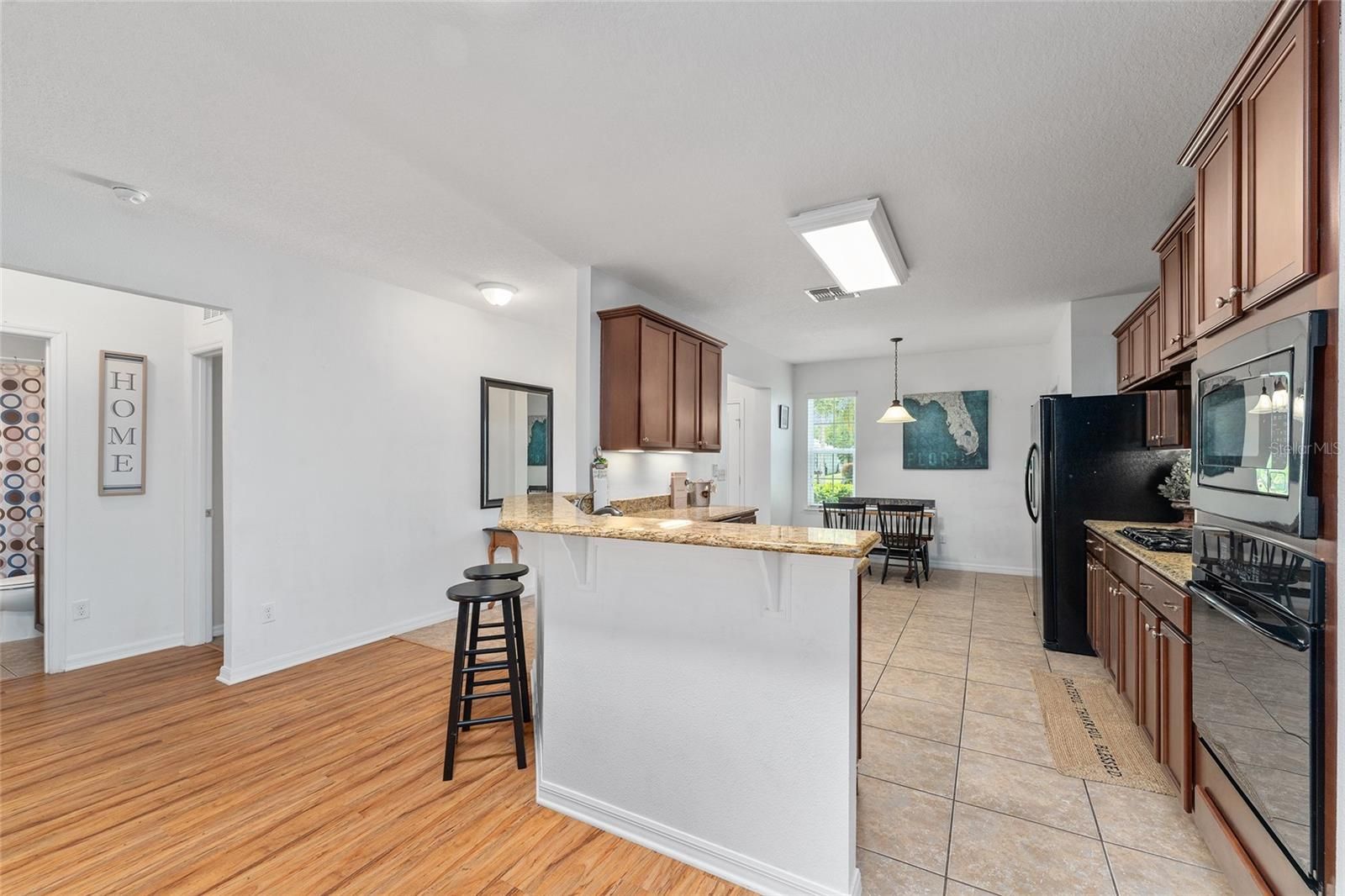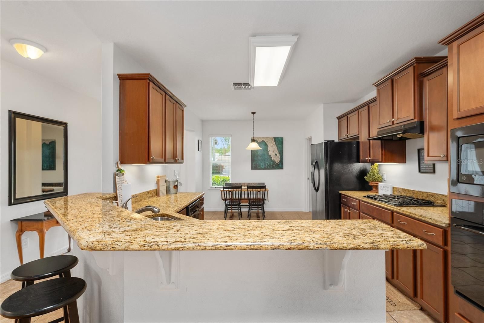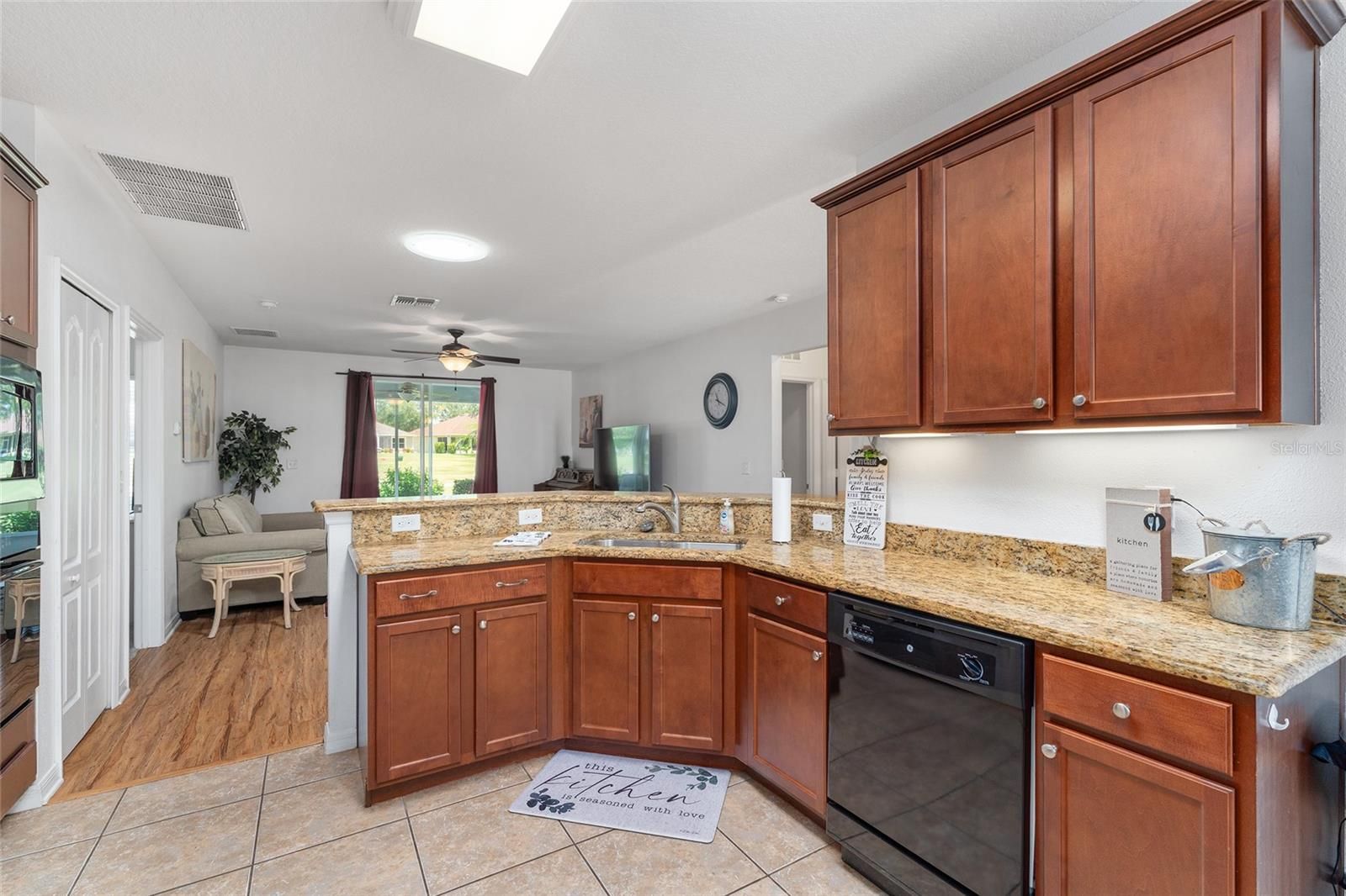 LOCATION, LOCATION! Just steps away from the clubhouse and pool, this exquisite 3-bedroom, 2-bathroom TURN-KEY residence is situated on the 7th tee box within the GATED ARLINGTON RIDGE COMMUNITY. Arrive home to an appealing facade that exudes charm. A lush, HOA-maintained lawn complemented by mature landscaping perfectly frames the attractive stucco exterior and the covered front entrance. The spacious driveway and 2-car garage offer ample parking space. Upon entering through the leaded-glass front door, one is welcomed into a bright and airy interior featuring tile and wood laminate flooring in the living areas, upgraded finishes, and stunning golf course views accentuated by mature trees. The open concept living room facilitates effortless entertaining. A glass slider opens wide onto the covered, screened lanai, allowing one to enjoy the outdoors without the presence of rear neighbors. This space serves as an ideal location for morning coffee or relaxation at the end of the day. The well-appointed kitchen boasts beautiful granite countertops, an abundance of custom wood cabinetry with matching appliances, a 5-burner gas range, and double ovens. Additional features include a closet pantry, a laundry room, and overhead cabinetry. The breakfast bar and kitchen dinette areas provide a perfect setting for casual dining. The expansive master bedroom features cozy carpeting, a private en-suite bathroom with a dual sink granite countertop, wood cabinetry, a walk-in closet, and a walk-in shower. Two guest bedrooms share a full hall bathroom equipped with a granite sink vanity and tiled tub/shower. Seller does have plans to add a Golf Cart Garage!!! This well-established Leesburg community offers picturesque surroundings and remarkable amenities, including a 24-hour guard station, an 18-hole championship golf course, a resort-style pool and lap pool, tennis courts, organized activities, a fitness center, a community cinema, a restaurant, and even a pub! An additional advantage is that the HOA covers lawn care, cable, and high-speed internet. This residence represents a beautiful place to call home!