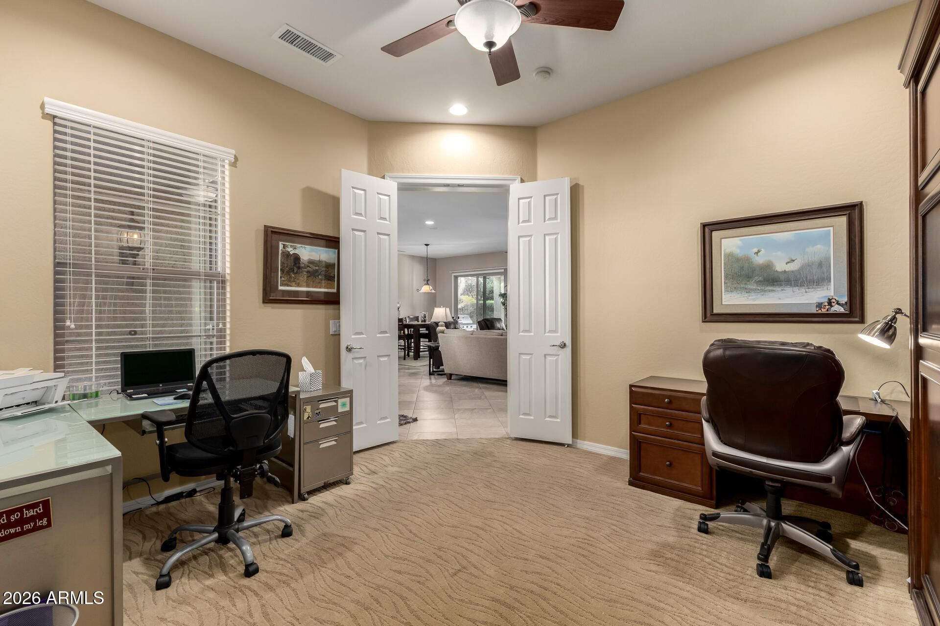 IMMACULATE FIESTA WITH SOLAR IN SUN CITY FESTIVAL. Discover effortless living in this beautifully designed model, situated within a premier 55+ community. This thoughtfully crafted home offers a layout perfect for everyday comfort and entertaining. The kitchen features gorgeous cabinetry, ample counter space, and a functional design that flows naturally into the main living space. The spacious primary suite offers custom designed cabinets with a fireplace. The ensuite bath features a custom tiled shower and a spacious walk in closet. The additional bedroom is perfect for guests, along with a den/office with built-in desk and Murphy bed. Enjoy low maintenance living and resort-style amenities including golf, pickleball, fitness center, pools, walking trails and many clubs and social events