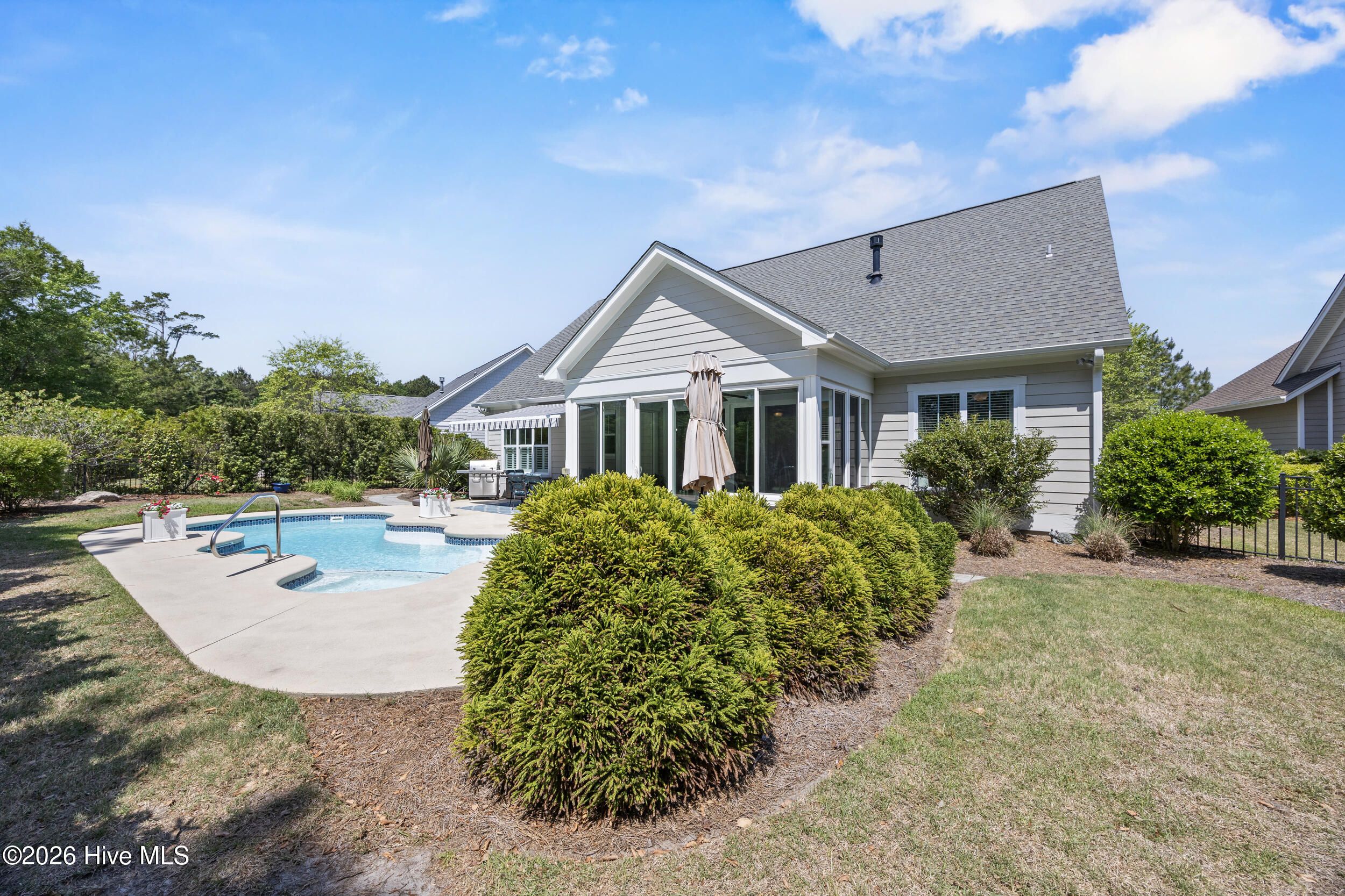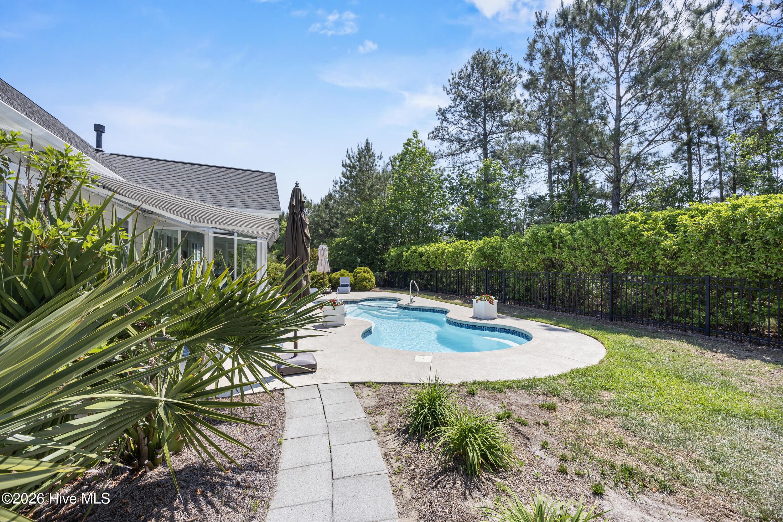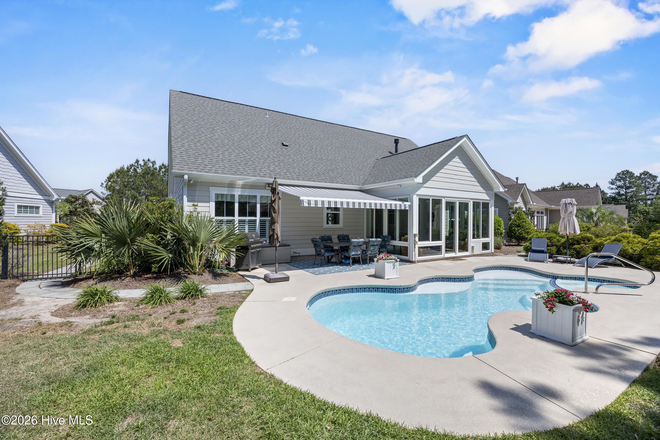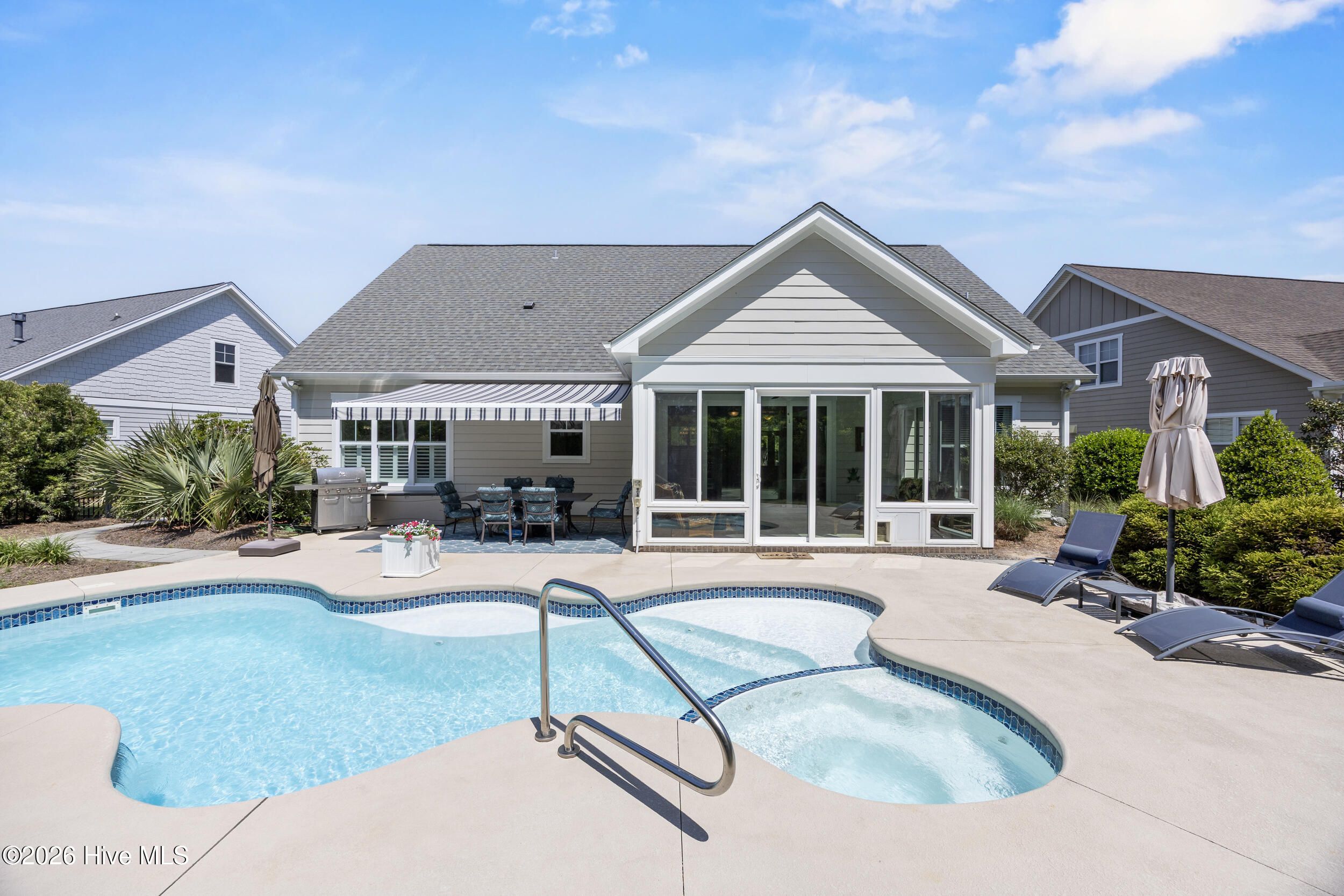 Front porch overlooks a private wooded common area. Bright open floor plan with formal dining (coffered ceiling & wainscoting), spacious living room with built-ins and gas fireplace, and a well-appointed kitchen with granite, large island, walk-in pantry, stainless appliances, and wine fridge. Heated in-ground saltwater pool & hot tub with gas heater, plus a private fenced backyard and gas line for a grill. Glass-enclosed sunroom with solar shades overlooks your outdoor retreat. Primary suite with tray ceiling, tiled shower, and custom walk-in closet. Two additional bedrooms, full bath, mudroom, and separate laundry on main level. Upstairs bonus room with full bath, walk-in closet, and ample storage. Two-car garage, custom patio, and low-maintenance living with lawn care included. Resort-style community amenities and just minutes to downtown Wilmington and area beaches.
