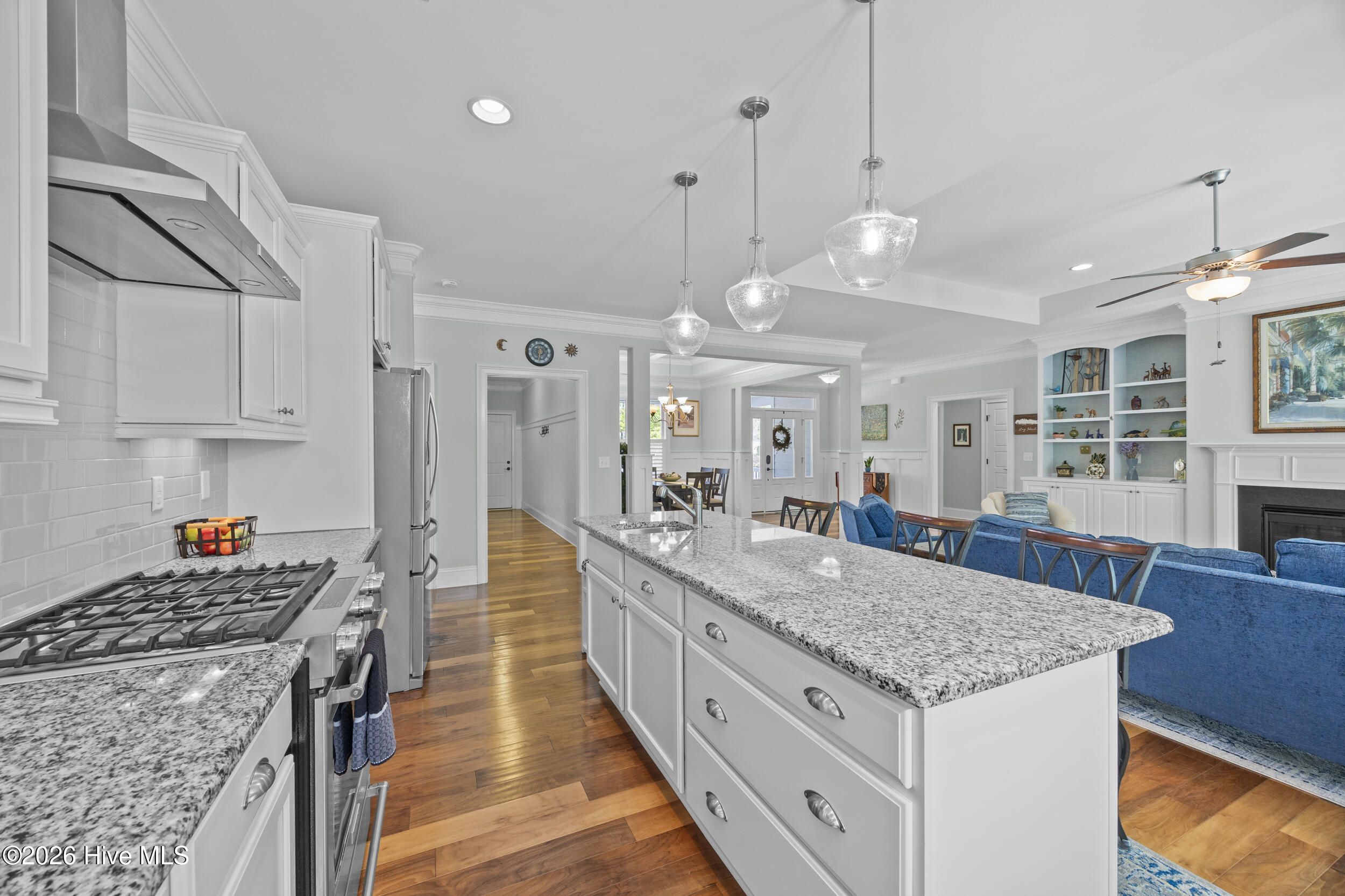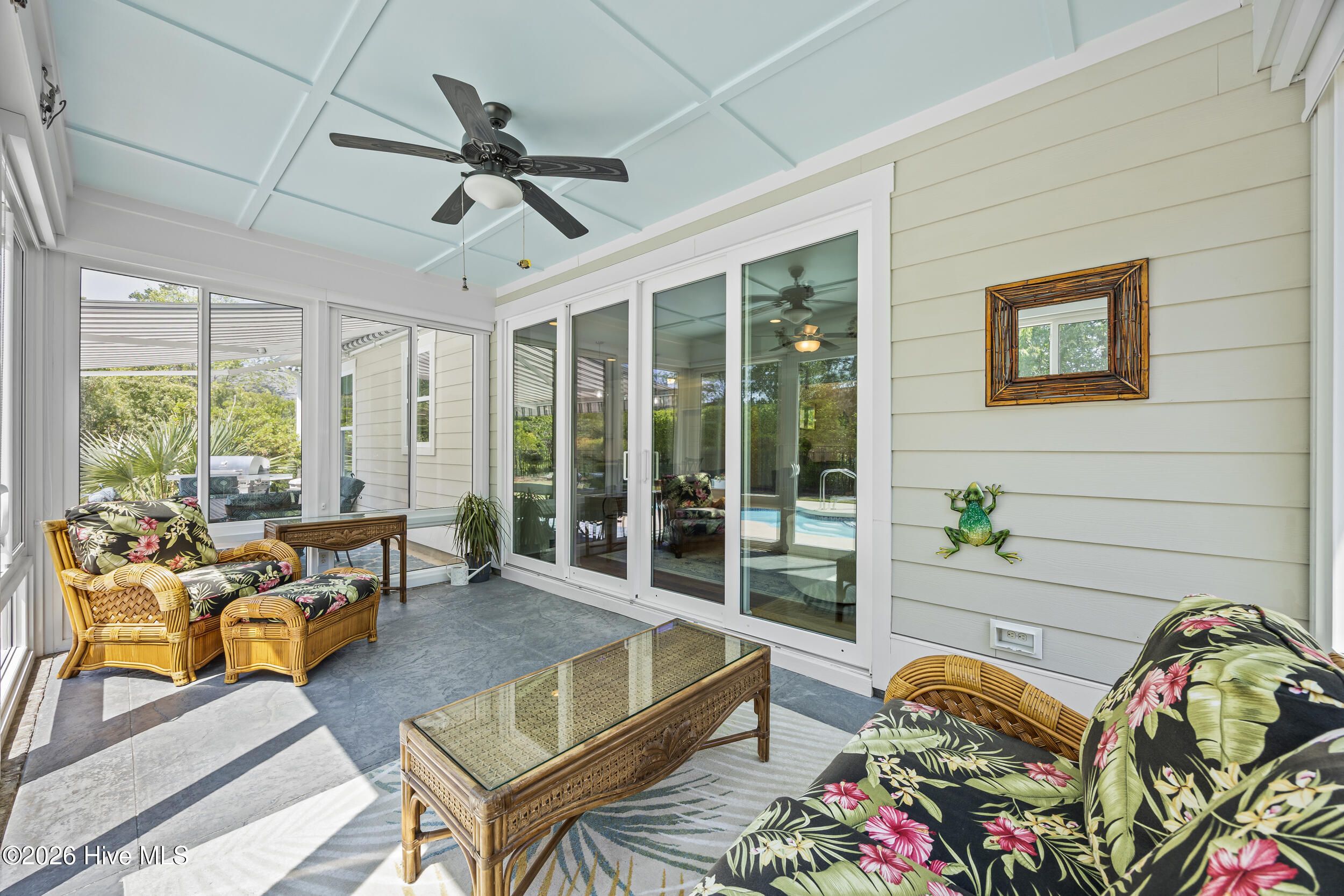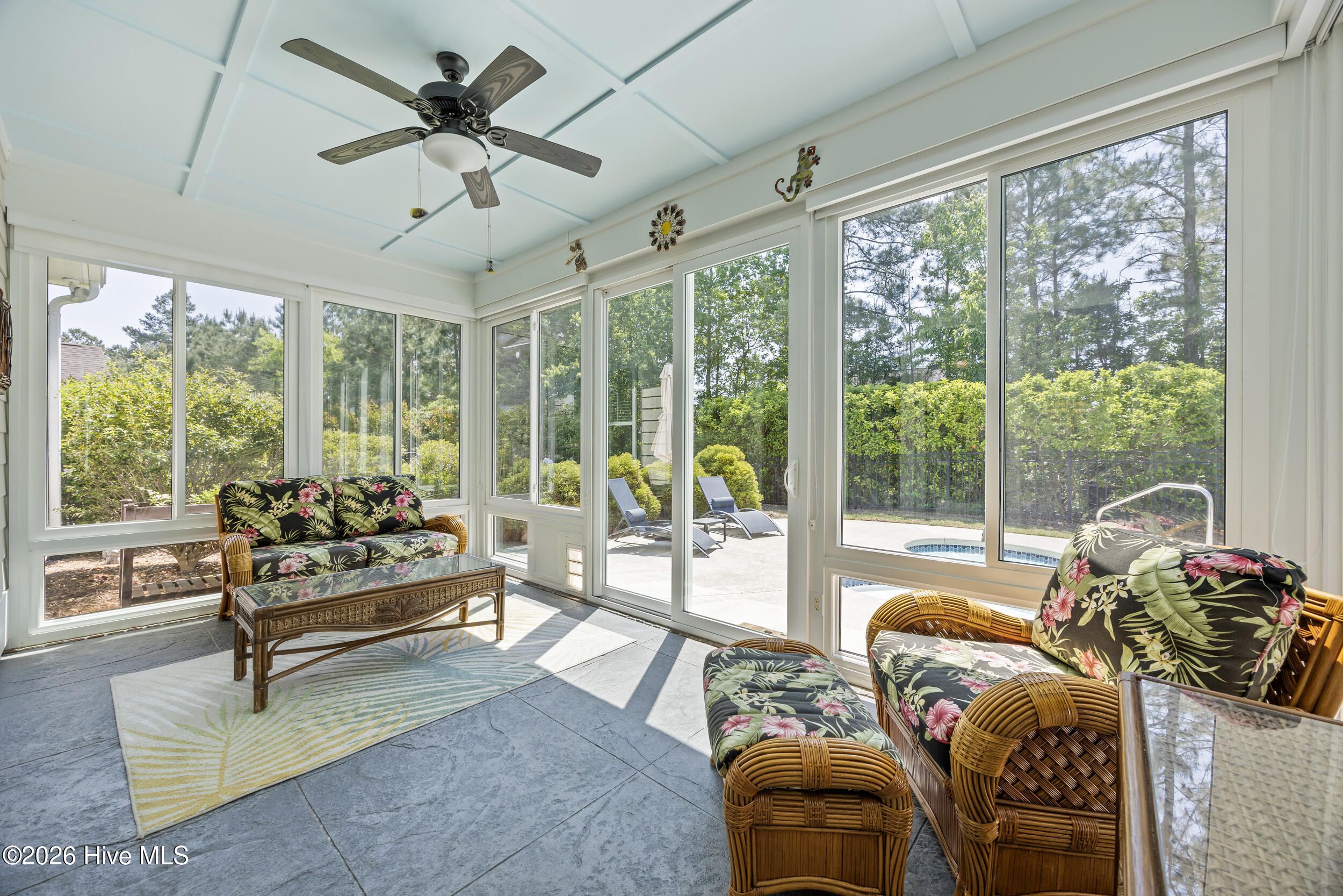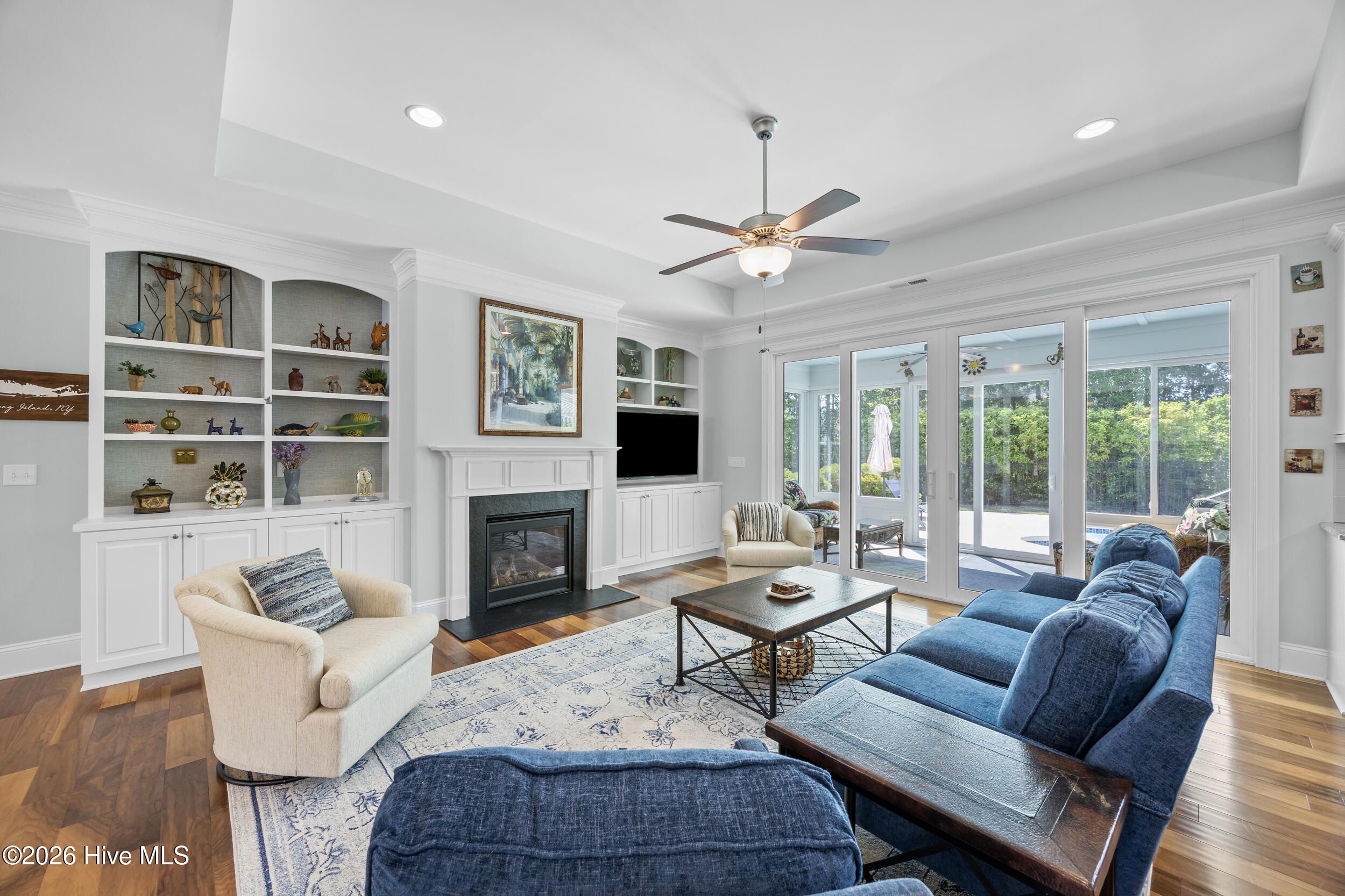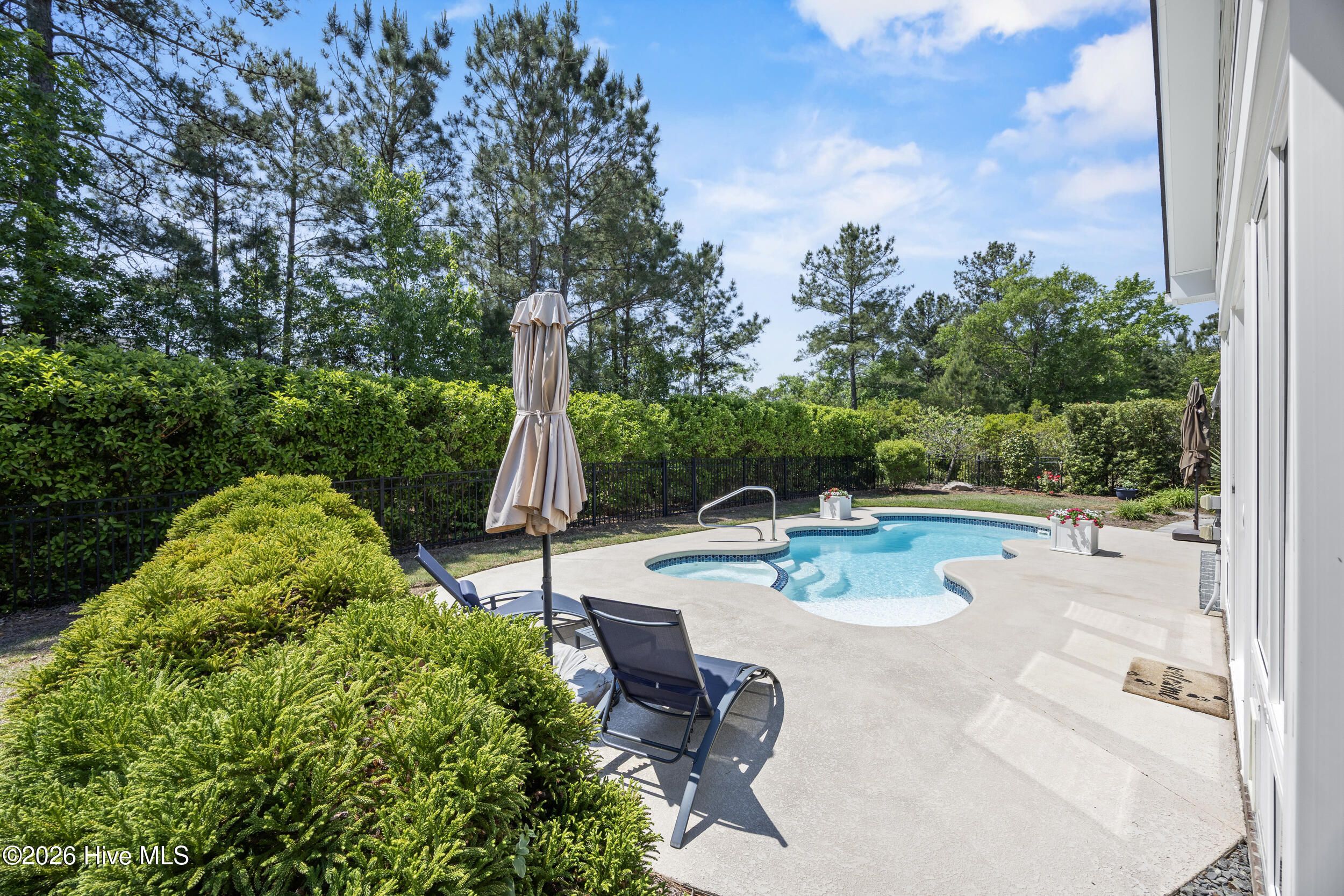 Front porch overlooks a private wooded common area. Bright open floor plan with formal dining (coffered ceiling & wainscoting), spacious living room with built-ins and gas fireplace, and a well-appointed kitchen with granite, large island, walk-in pantry, stainless appliances, and wine fridge. Heated in-ground saltwater pool & hot tub with gas heater, plus a private fenced backyard and gas line for a grill. Glass-enclosed sunroom with solar shades overlooks your outdoor retreat. Primary suite with tray ceiling, tiled shower, and custom walk-in closet. Two additional bedrooms, full bath, mudroom, and separate laundry on main level. Upstairs bonus room with full bath, walk-in closet, and ample storage. Two-car garage, custom patio, and low-maintenance living with lawn care included. Resort-style community amenities and just minutes to downtown Wilmington and area beaches.