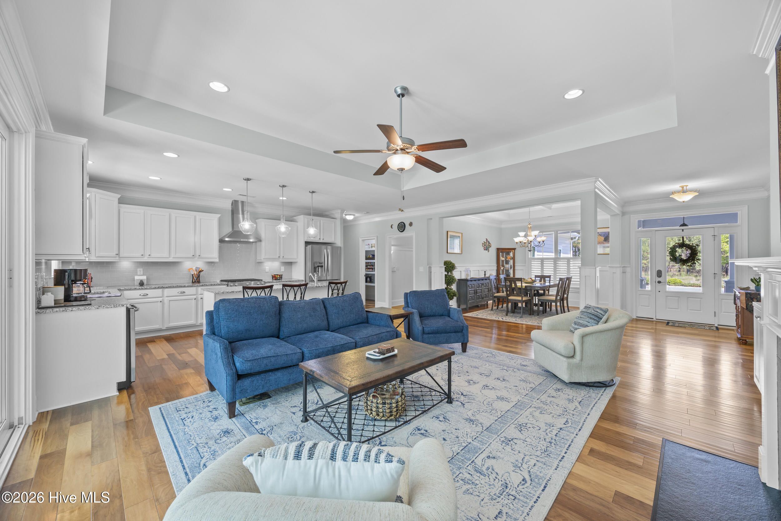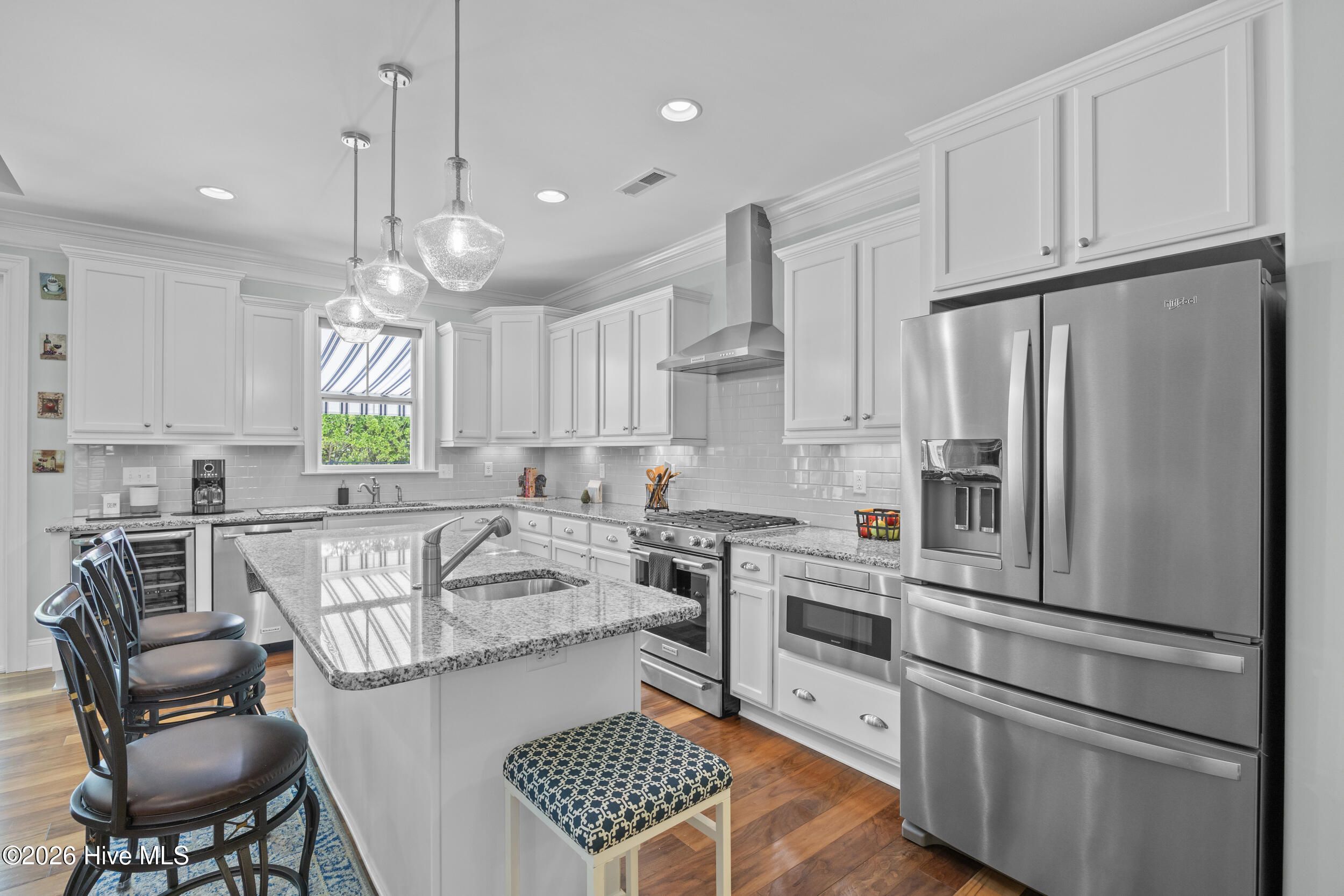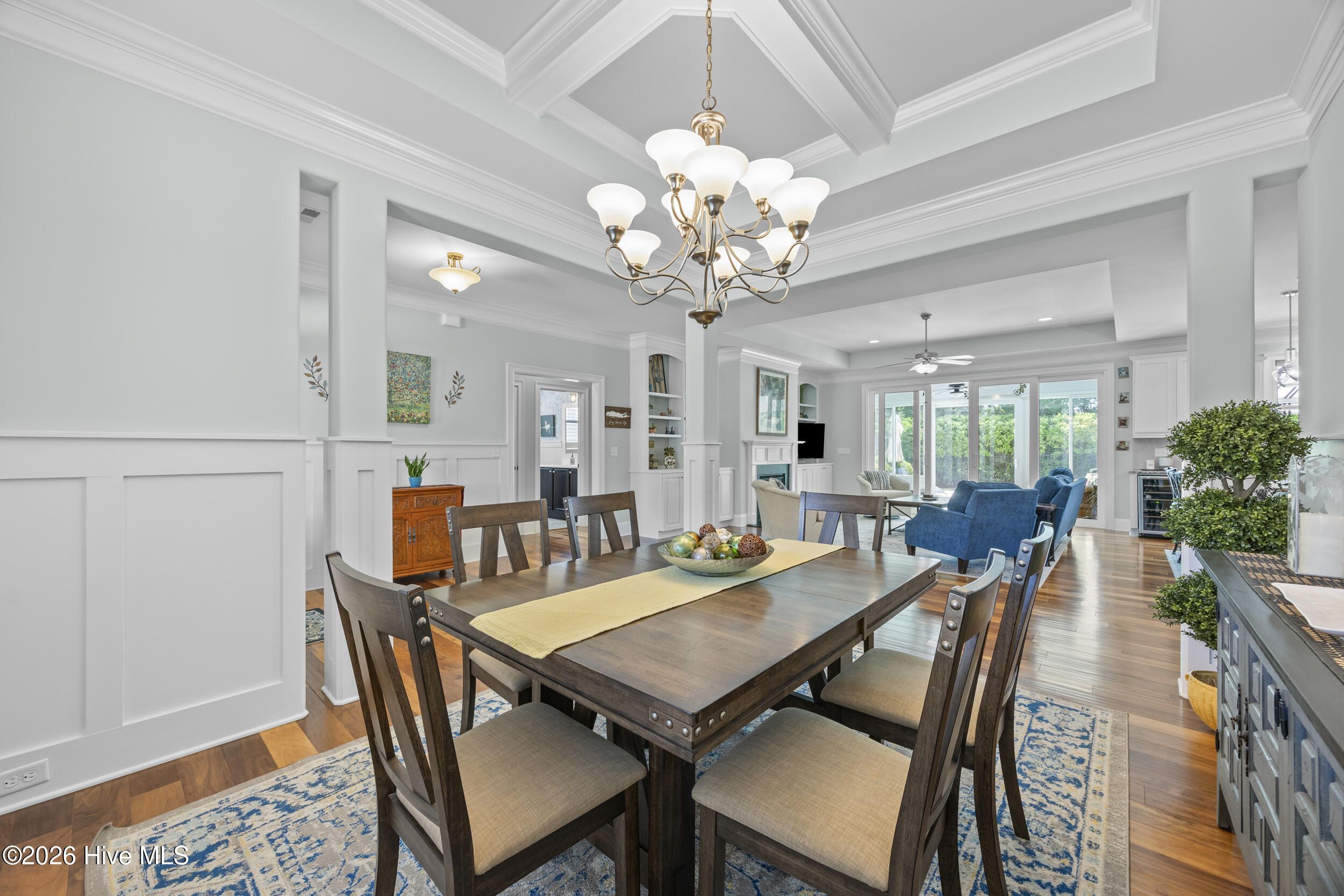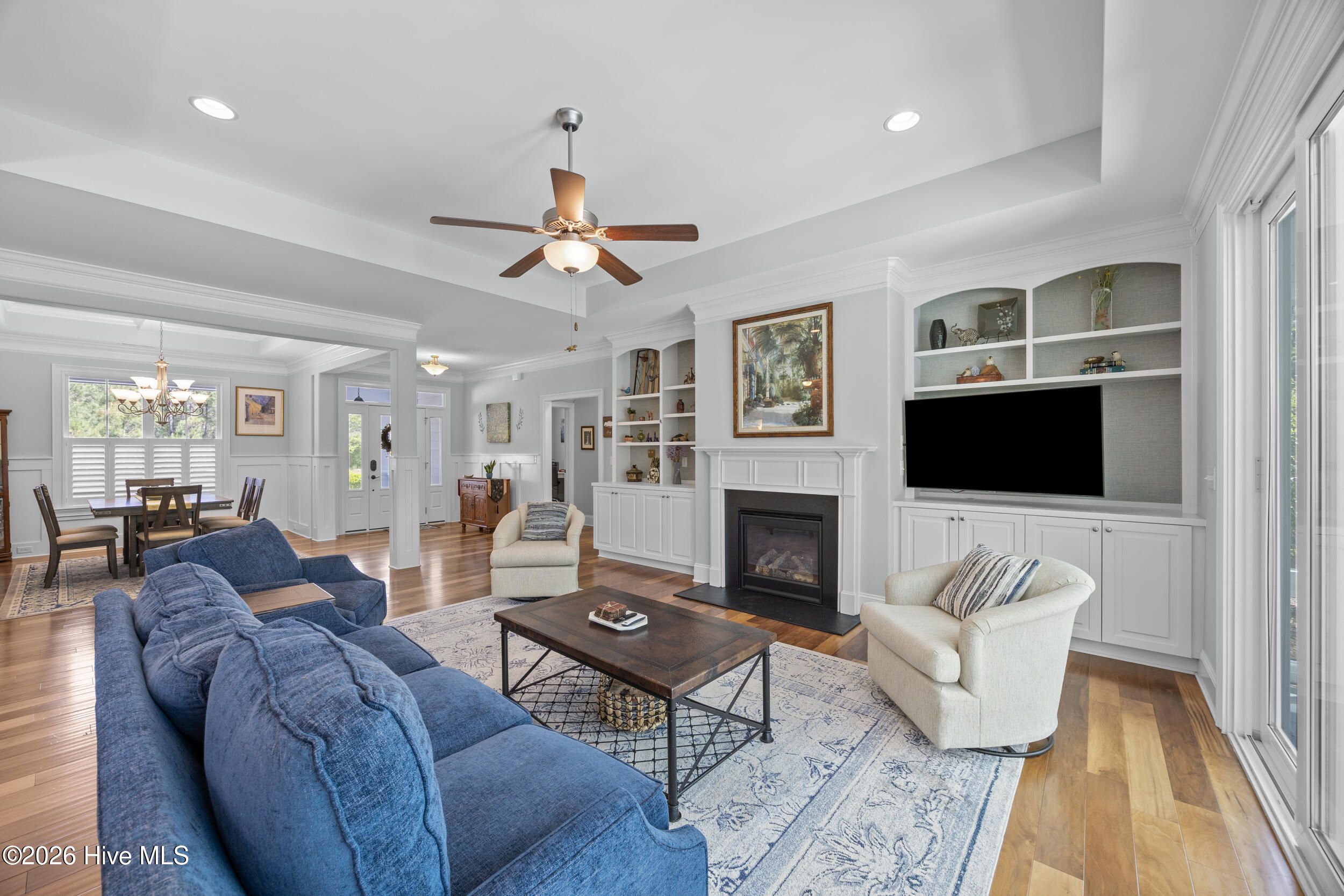 Front porch overlooks a private wooded common area. Bright open floor plan with formal dining (coffered ceiling & wainscoting), spacious living room with built-ins and gas fireplace, and a well-appointed kitchen with granite, large island, walk-in pantry, stainless appliances, and wine fridge. Heated in-ground saltwater pool & hot tub with gas heater, plus a private fenced backyard and gas line for a grill. Glass-enclosed sunroom with solar shades overlooks your outdoor retreat. Primary suite with tray ceiling, tiled shower, and custom walk-in closet. Two additional bedrooms, full bath, mudroom, and separate laundry on main level. Upstairs bonus room with full bath, walk-in closet, and ample storage. Two-car garage, custom patio, and low-maintenance living with lawn care included. Resort-style community amenities and just minutes to downtown Wilmington and area beaches.