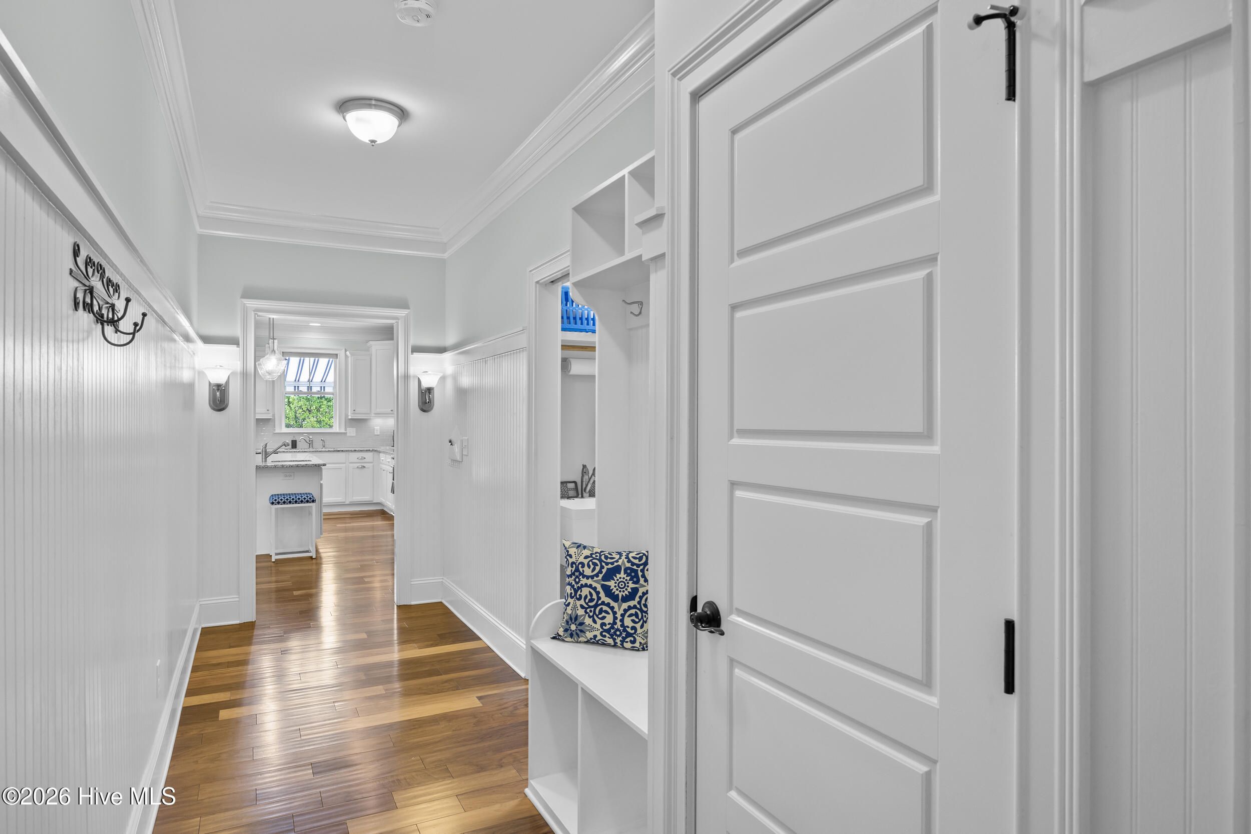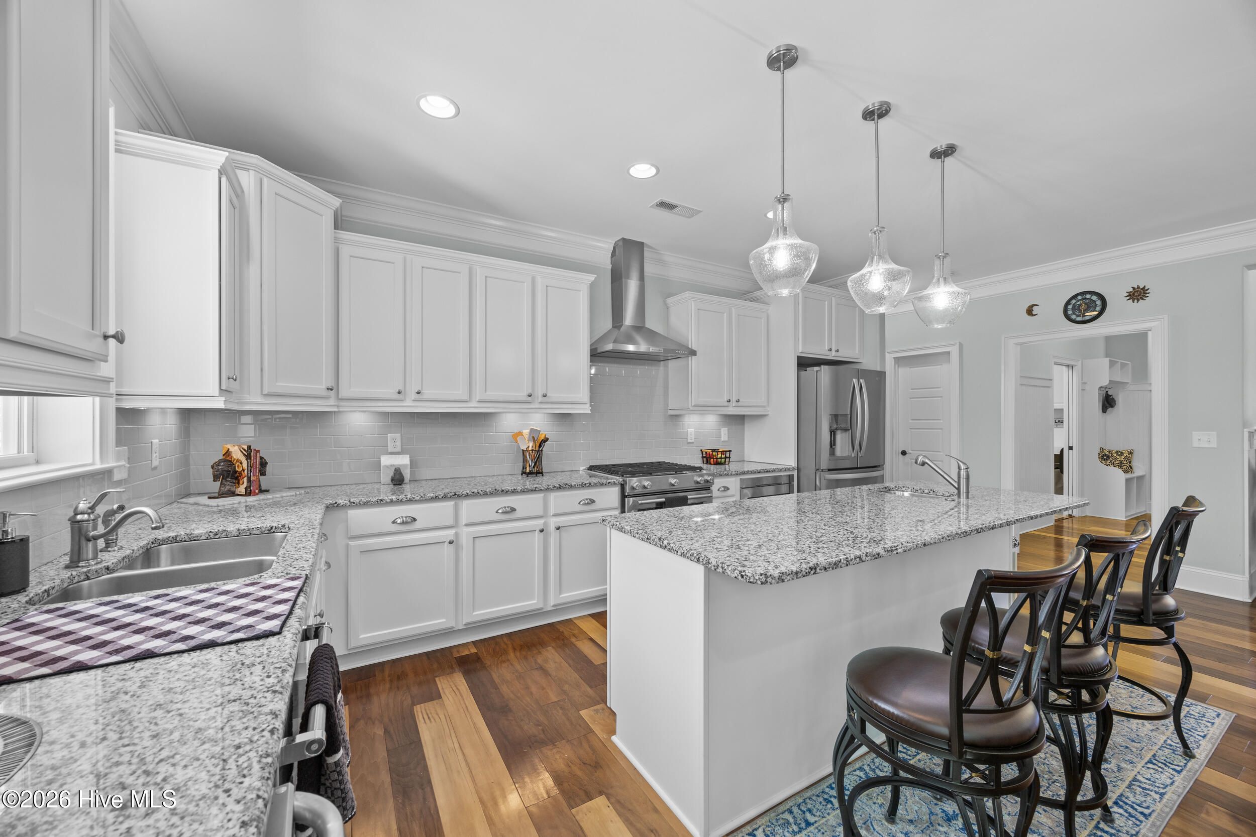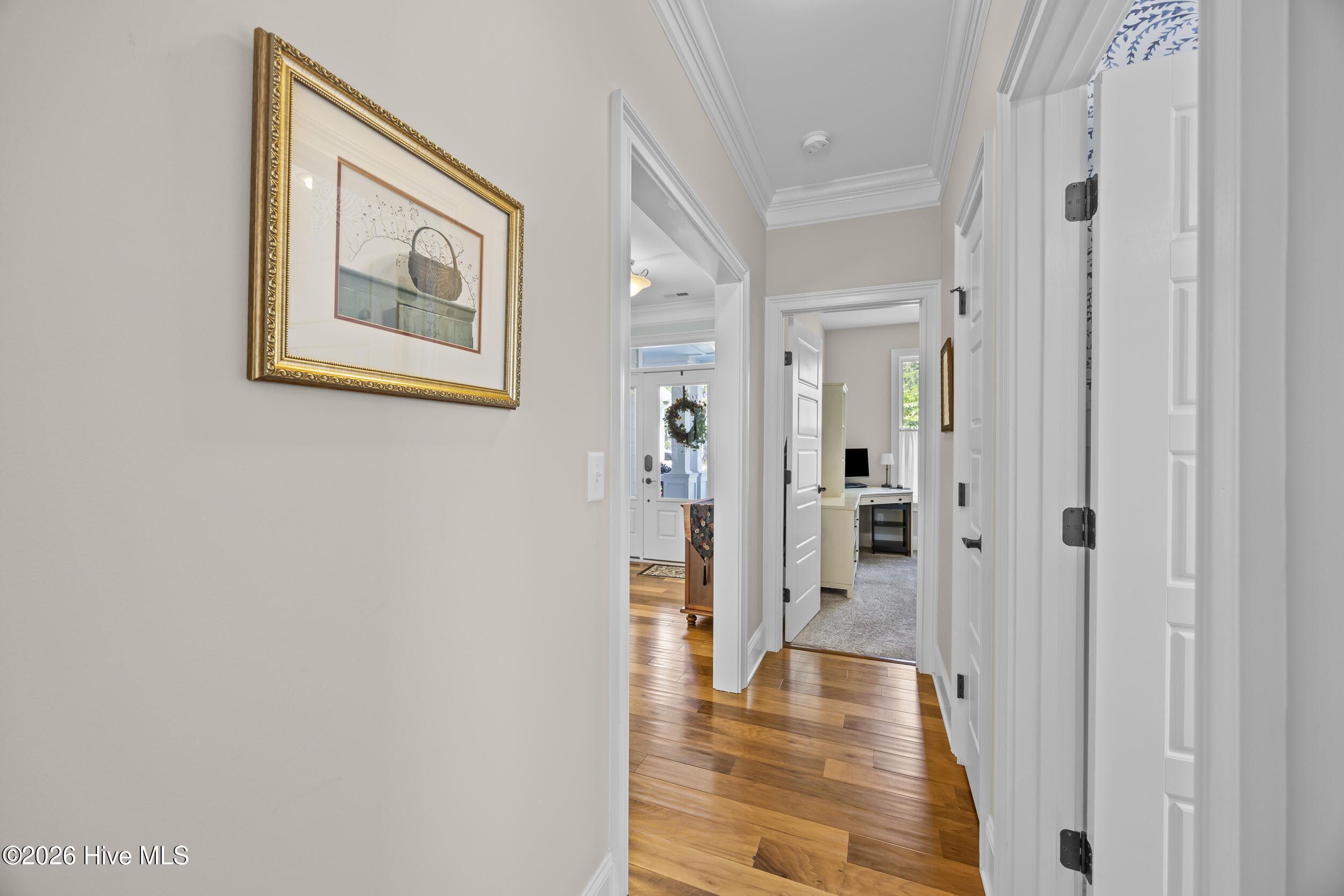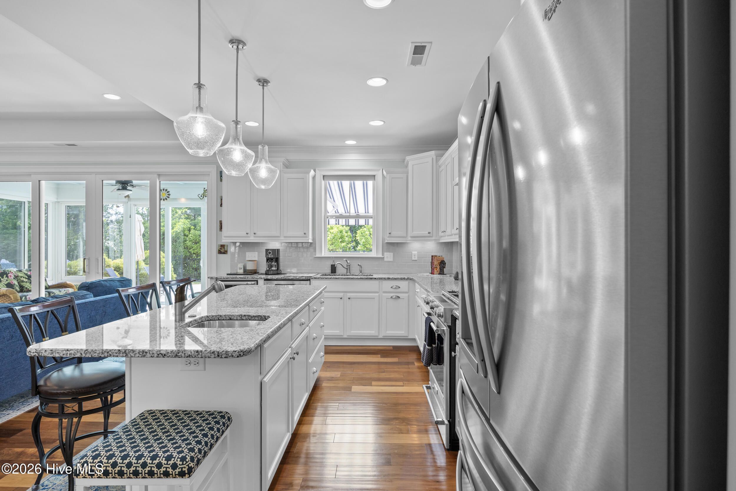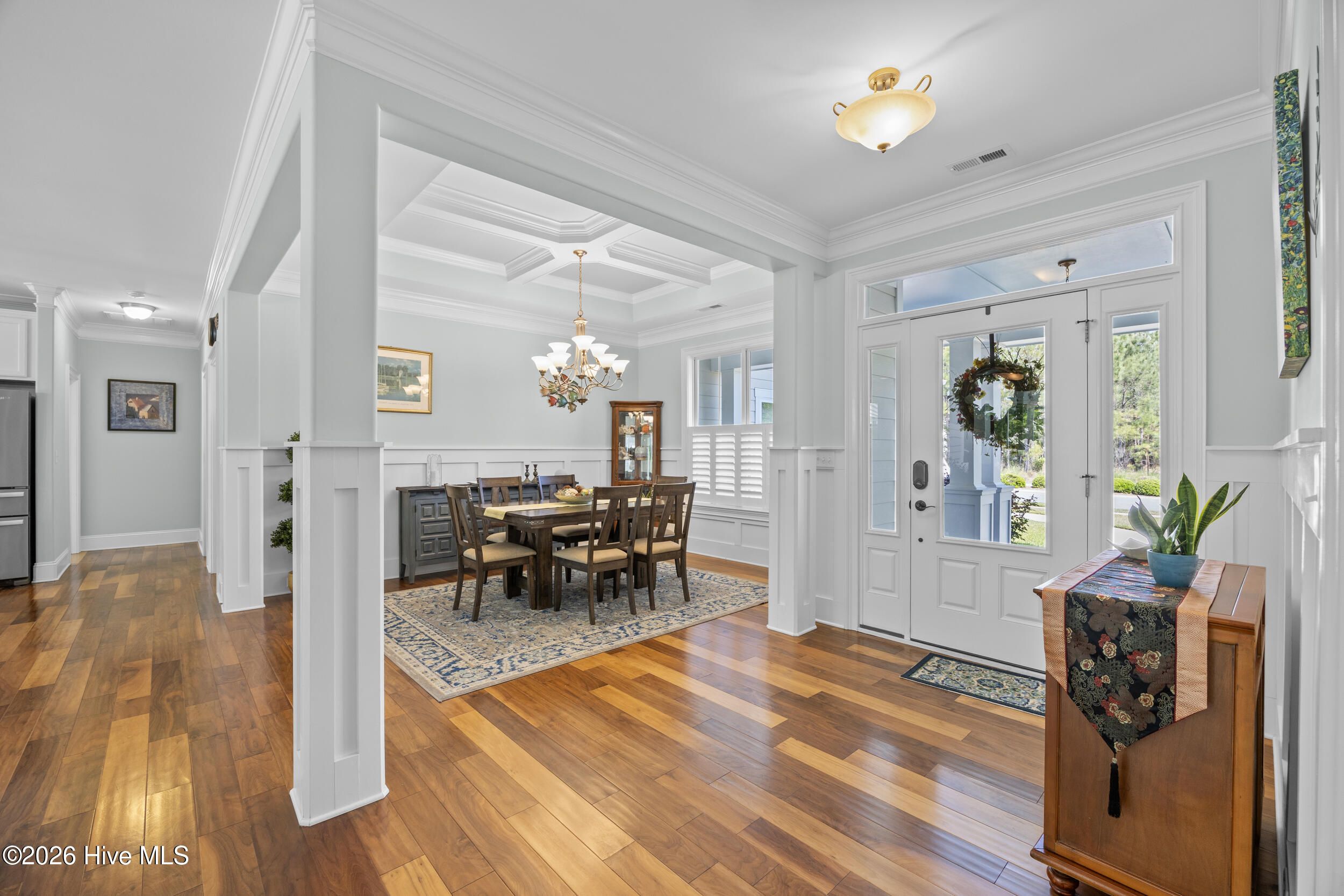 Front porch overlooks a private wooded common area. Bright open floor plan with formal dining (coffered ceiling & wainscoting), spacious living room with built-ins and gas fireplace, and a well-appointed kitchen with granite, large island, walk-in pantry, stainless appliances, and wine fridge. Heated in-ground saltwater pool & hot tub with gas heater, plus a private fenced backyard and gas line for a grill. Glass-enclosed sunroom with solar shades overlooks your outdoor retreat. Primary suite with tray ceiling, tiled shower, and custom walk-in closet. Two additional bedrooms, full bath, mudroom, and separate laundry on main level. Upstairs bonus room with full bath, walk-in closet, and ample storage. Two-car garage, custom patio, and low-maintenance living with lawn care included. Resort-style community amenities and just minutes to downtown Wilmington and area beaches.