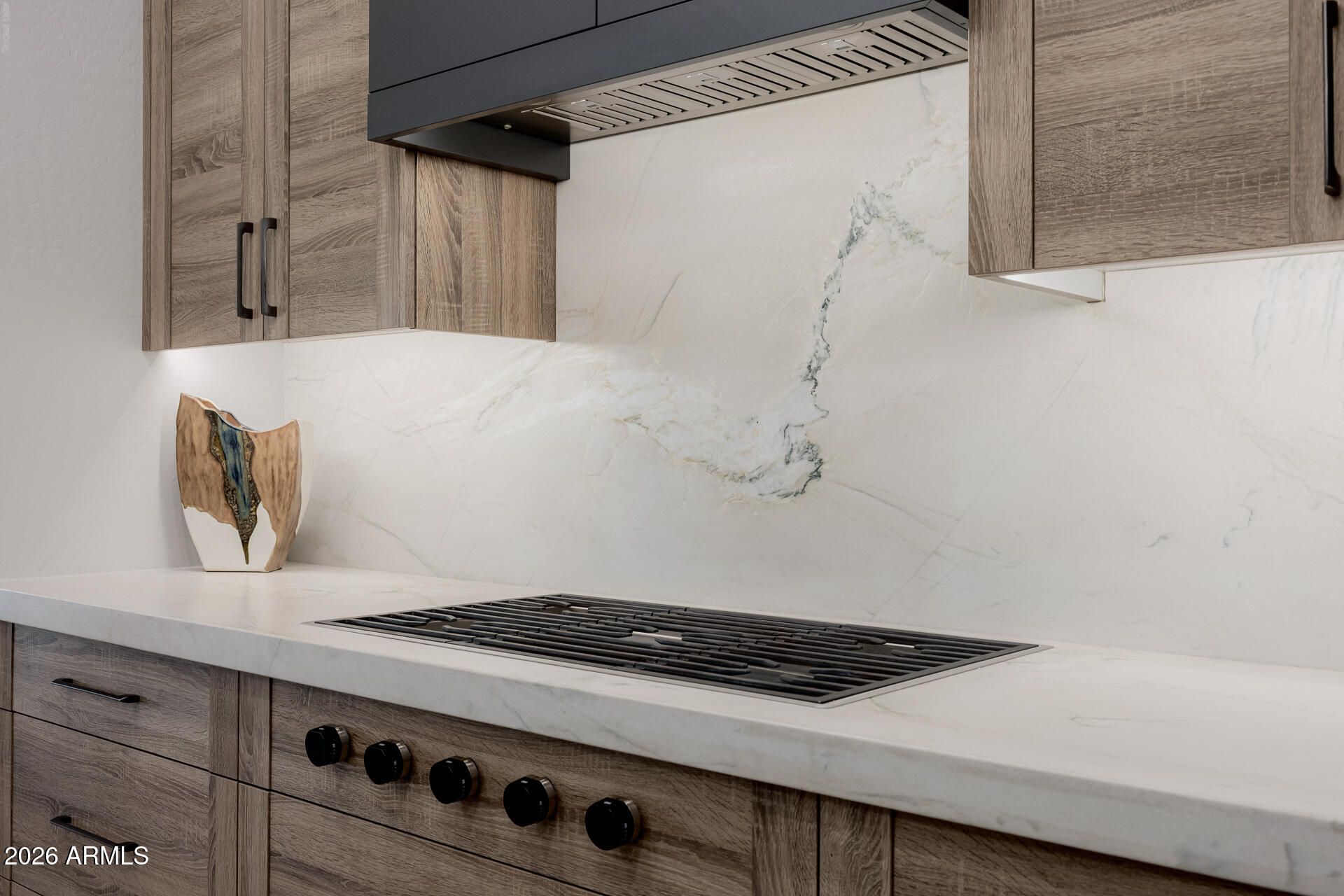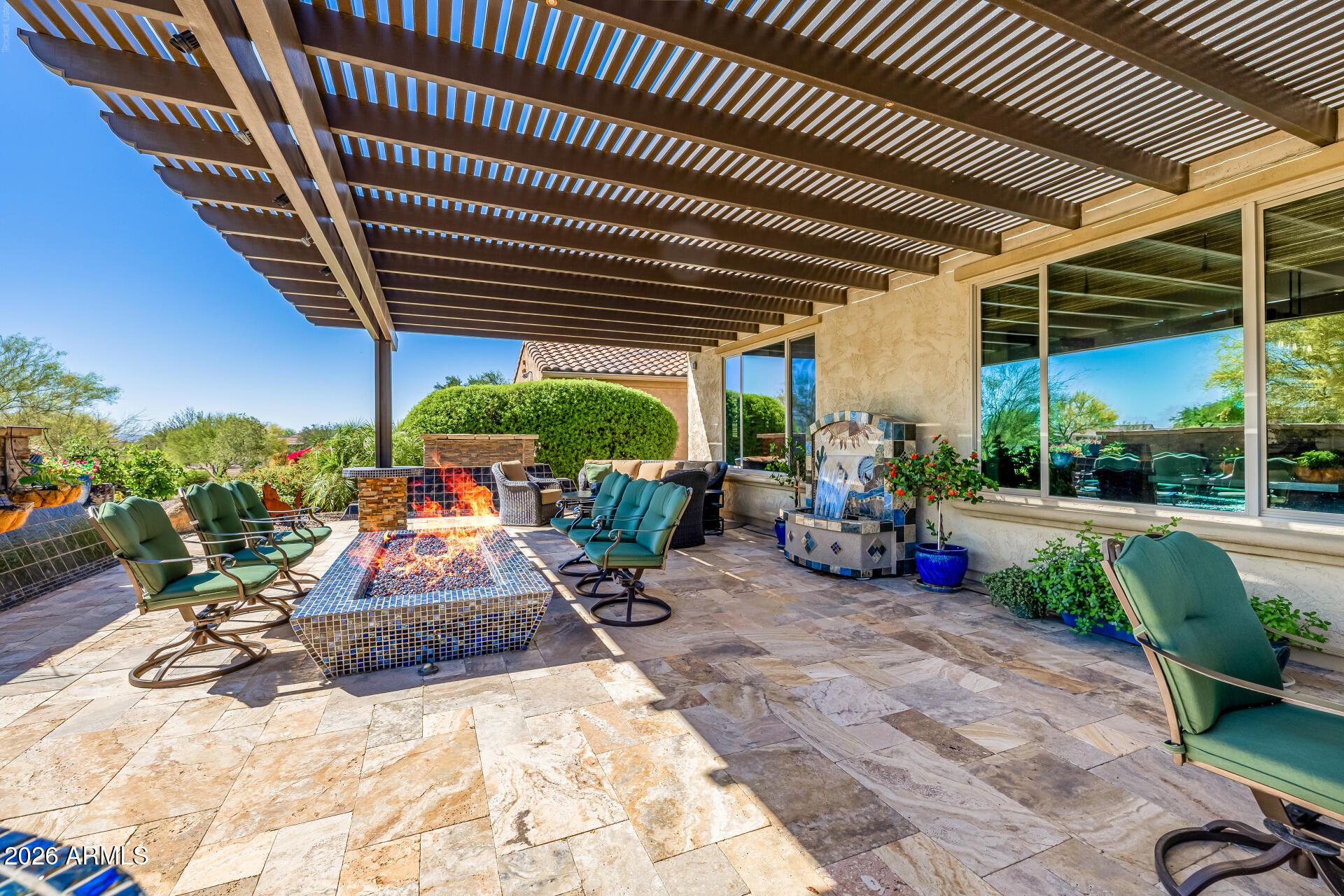 Discover the elegance, comfort, and fantastic golf course/mountain views of this stunning 2-bedroom +2 residence in the highly sought-after Sun City Festival. You'll fall in love with the bright living areas featuring LMV flooring w/upgraded baseboards throughout (2019), exposed beams, delightful arched passageways, plantation shutters for timeless charm, and stylish neutral colors. The 2020 chef's kitchen is complete with European cabinetry, quartzite countertops, Wolf gas stove, stainless steel appliances, warming oven and much, much more. Truly a chef's delight. Master suite bath & walk-in closet updated 2019. The outdoor oasis (completely redone in 2018) features a pergola the length of the home with fireplace, firepit, fountain, BBQ, multiple seating areas and a once in a lifetime view. Beautifully manicured landscape, inviting courtyard, and 2-car garage with an additional workshop (man cave) are just some of the many extras you'll discover here! Don't miss your chance to own something truly special!