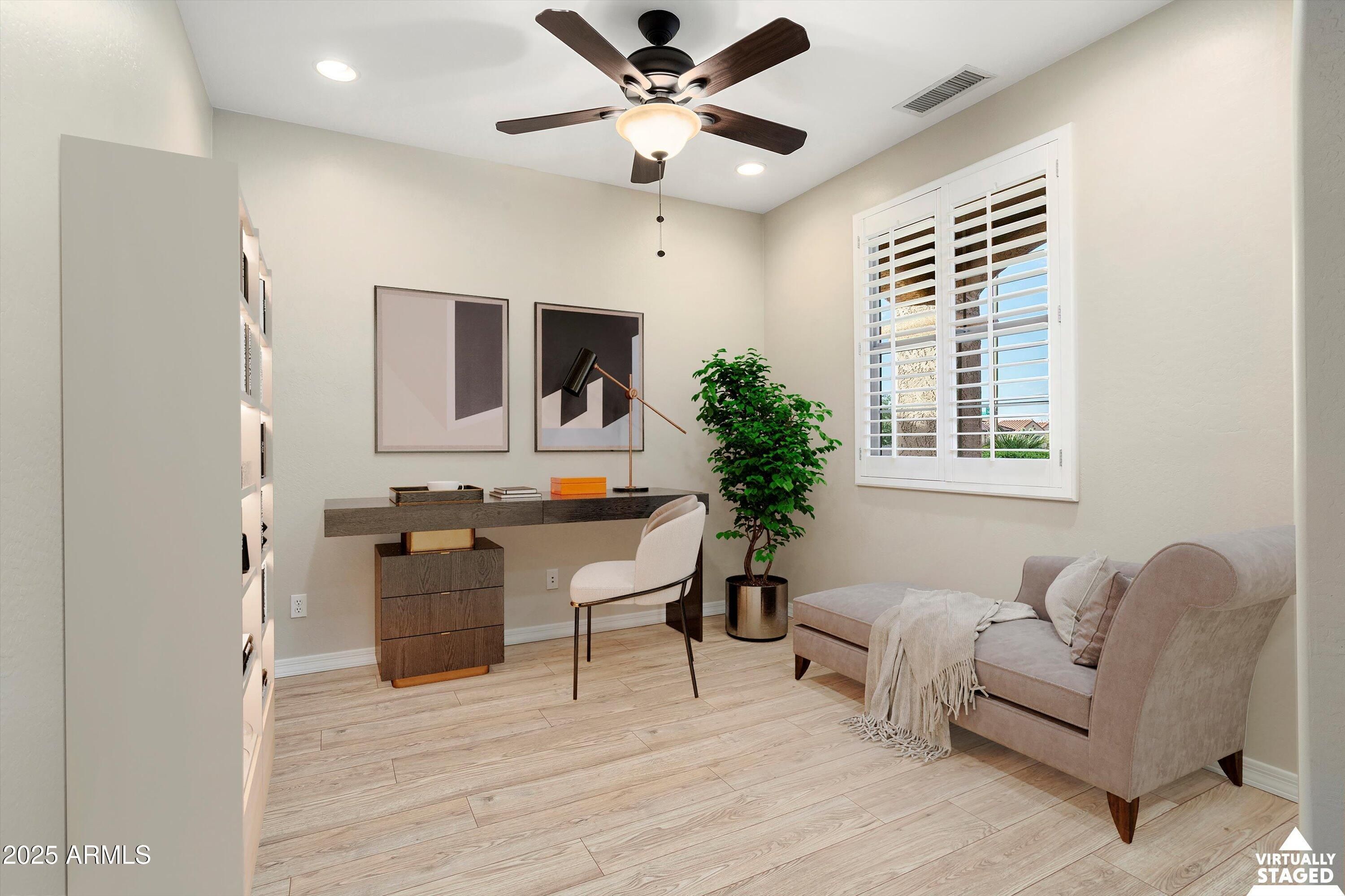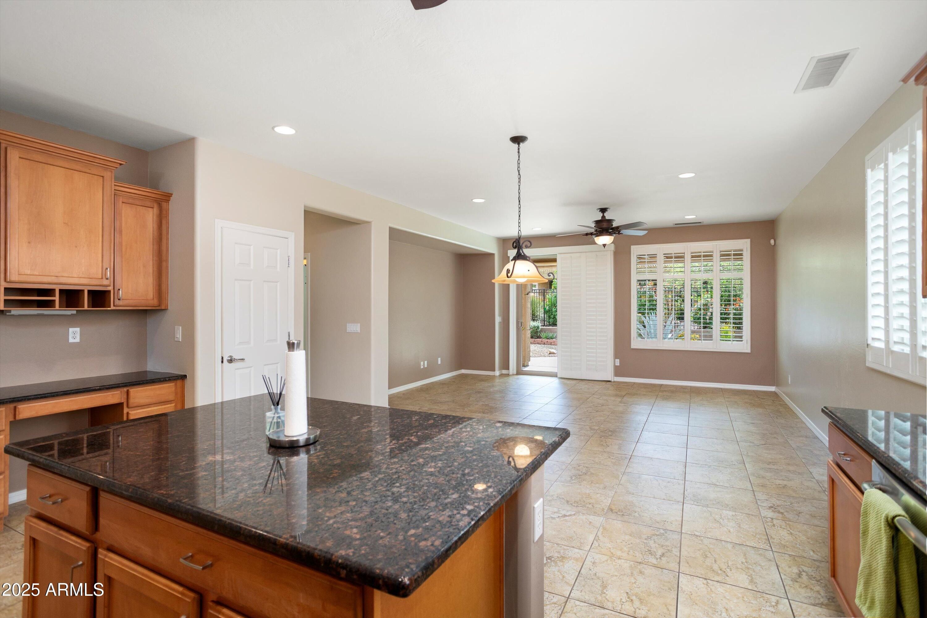 LOOK NO FURTHER! VALOR MODEL WITH OWNED SOLAR & 2024 HVAC! Enter this open concept split floorplan with neutral tones, no carpet & plantation shutters throughout. The kitchen impresses w/upgraded appliances, miles of granite counter space, a large island w/seating & built in office nook. The main living area is flooded w/natural light & room for dining and entertaining. The den offers flexability for work or hobbies. Owners' suite features an en-suite bath w/dual sinks, low threshold shower & walk in closet. An inviting guest bedroom w/ adjacent full bath is perfect for visitors. Garage has a mini split, storage cabinets, utility sink & 2022 hot water heater. Enjoy outdoor living on your extended covered patio overlooking the low maintenance, mature landscape creating a private retreat!