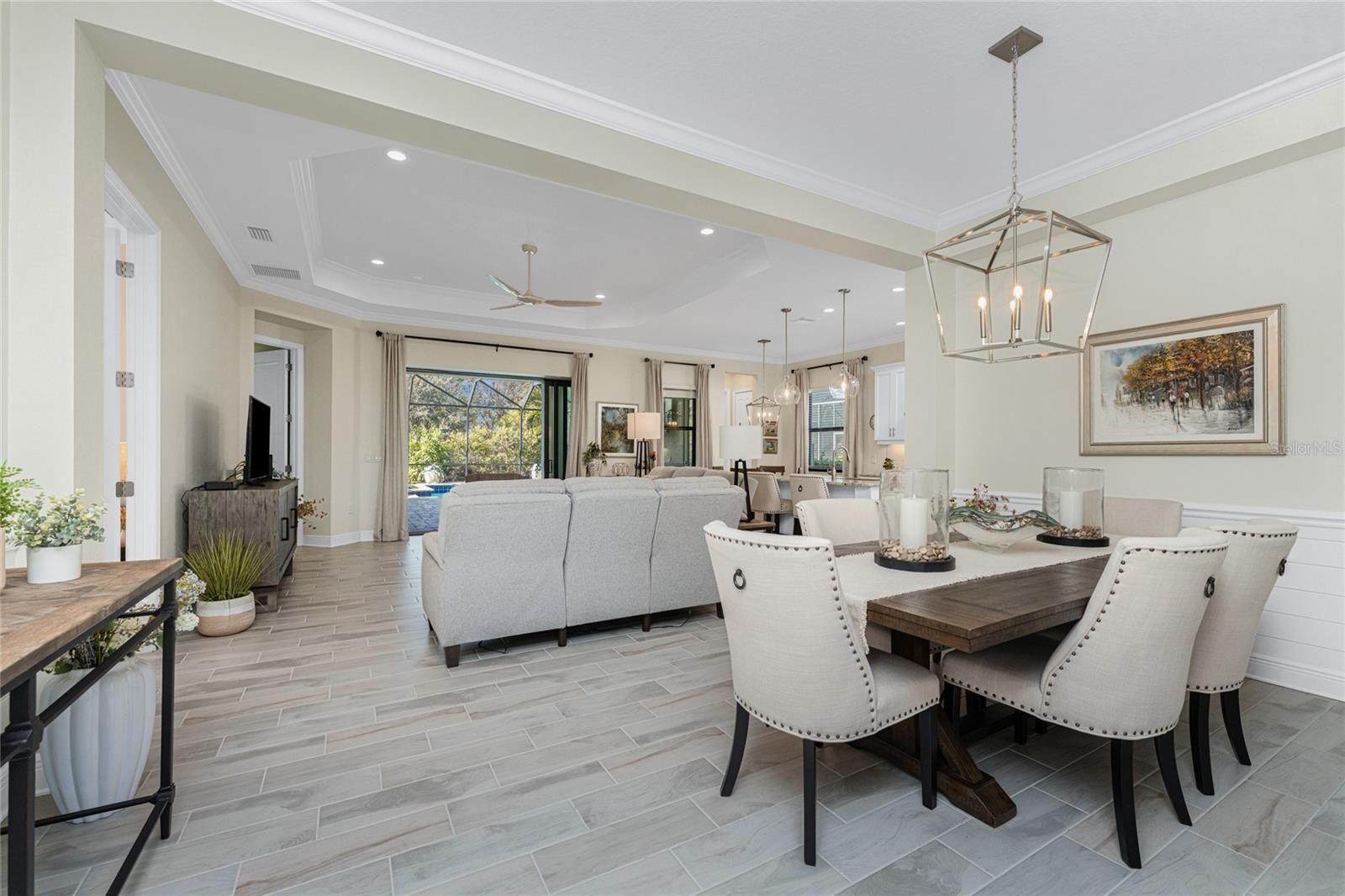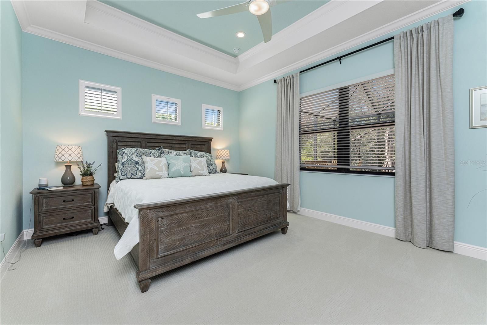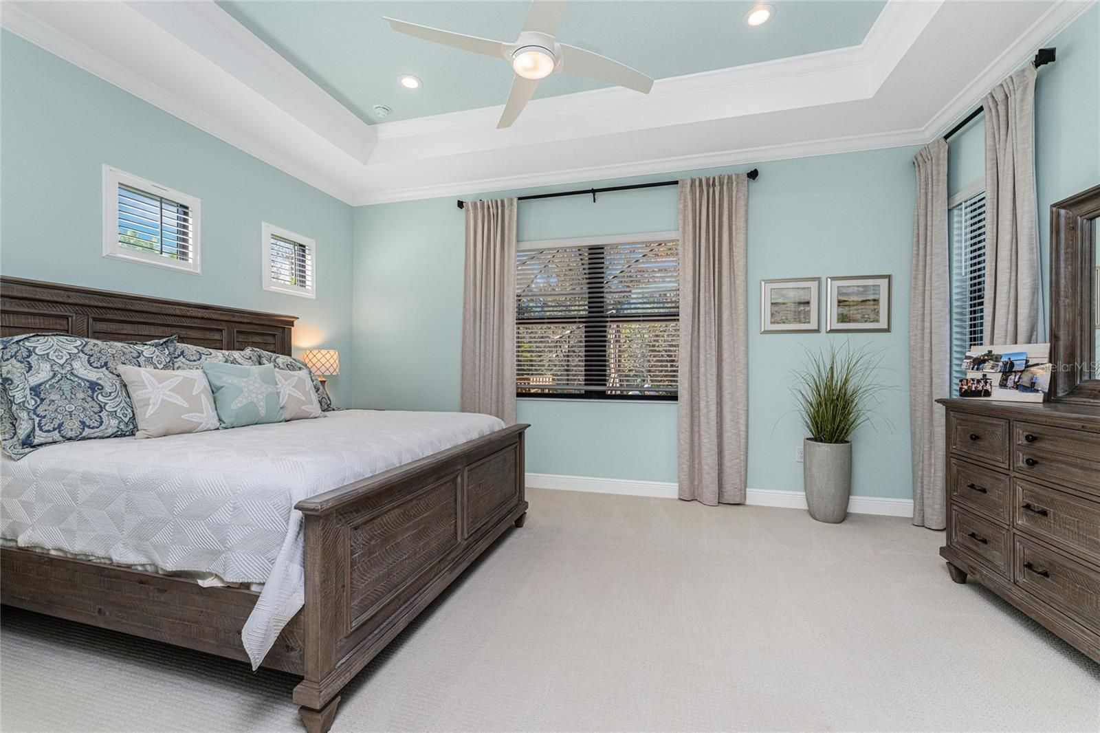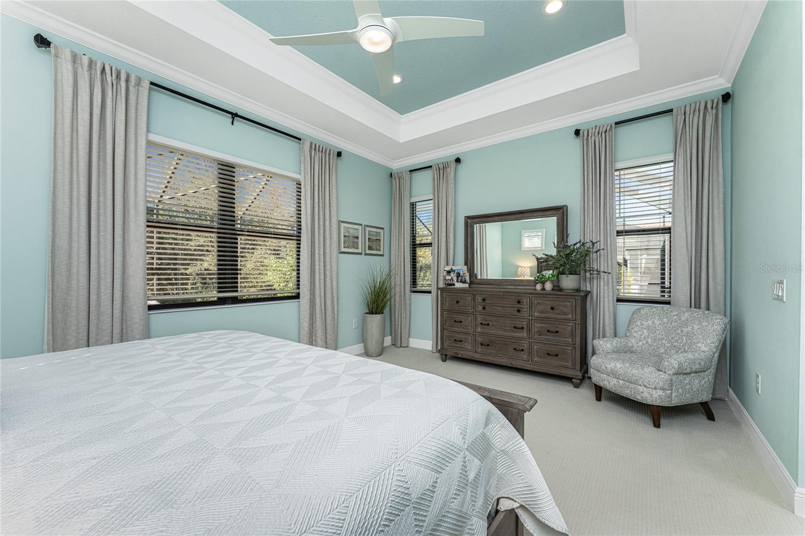 - Ceiling Fan(s), Crown Molding, Eat-in Kitchen, High Ceilings, Kitchen/Family Room Combo, Living/Dining Room, Open Floorplan, Solid-Wood Cabinets, Split Bedrooms, Stone Counters, Tray Ceiling(s), Walk-In Closet(s), Window Treatments