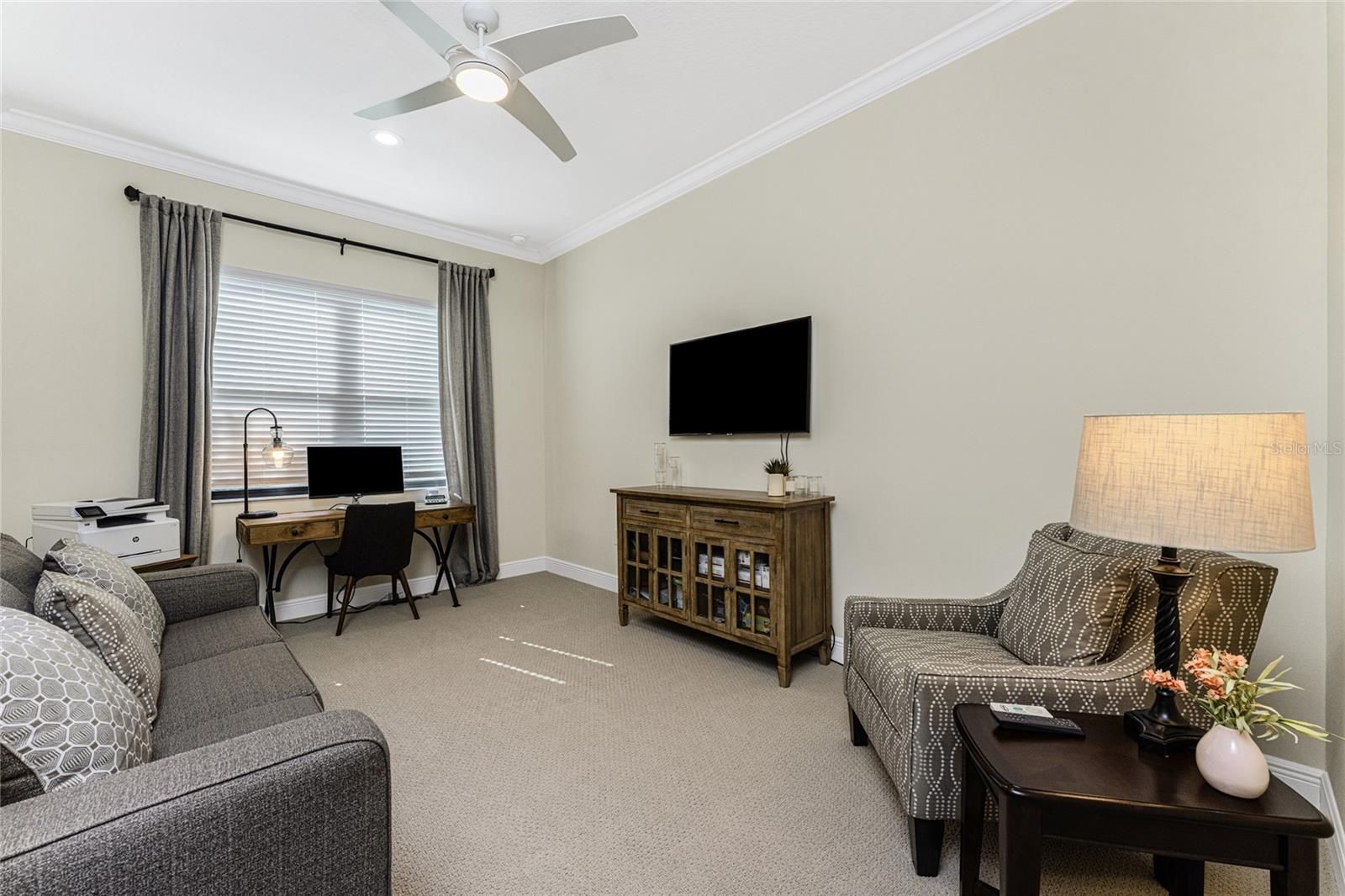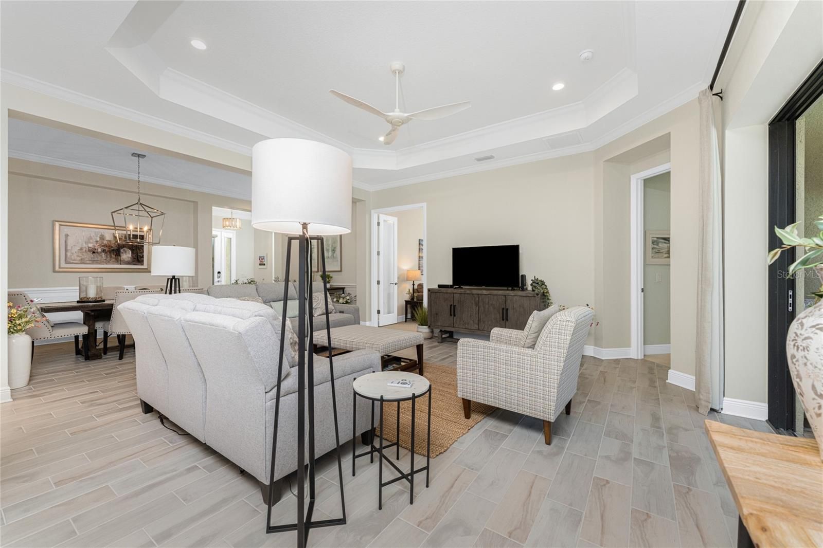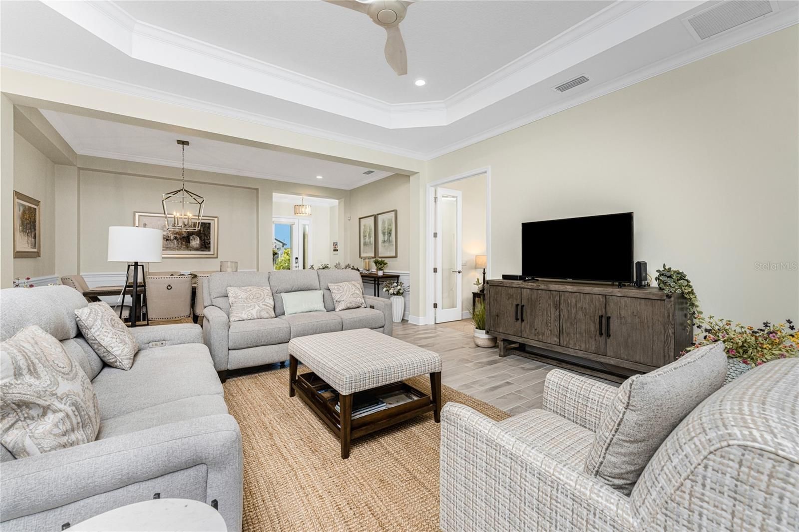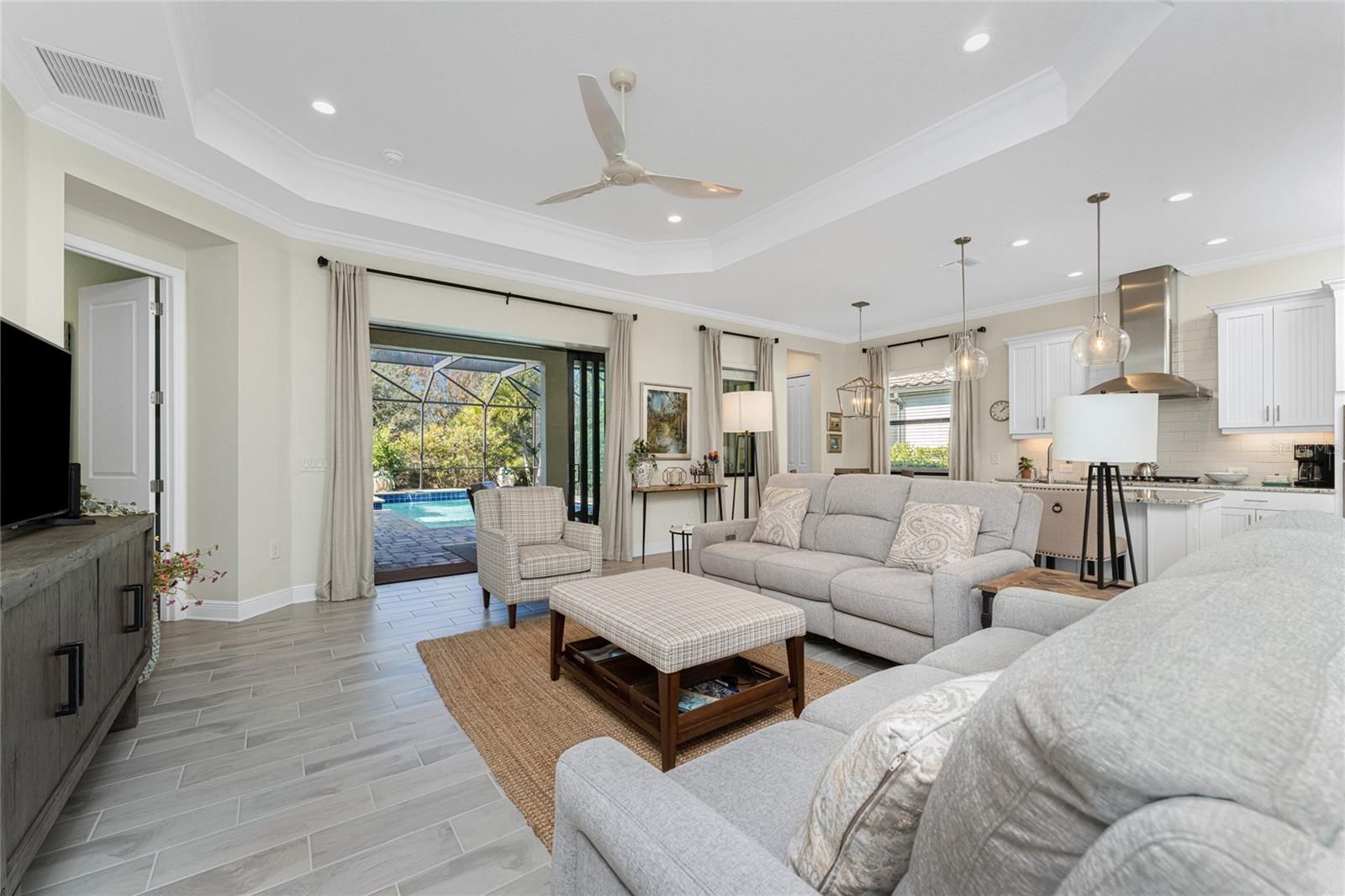 - Ceiling Fan(s), Crown Molding, Eat-in Kitchen, High Ceilings, Kitchen/Family Room Combo, Living/Dining Room, Open Floorplan, Solid-Wood Cabinets, Split Bedrooms, Stone Counters, Tray Ceiling(s), Walk-In Closet(s), Window Treatments