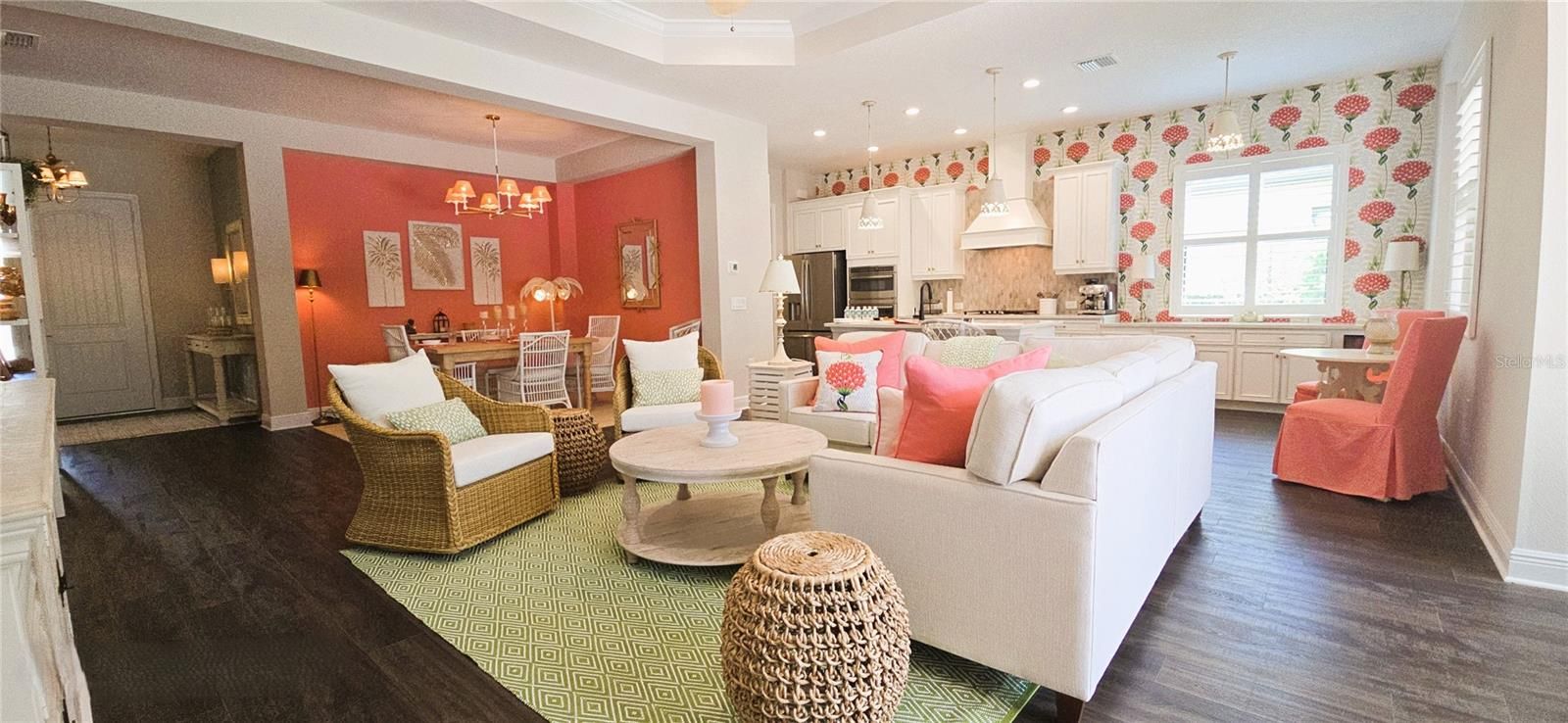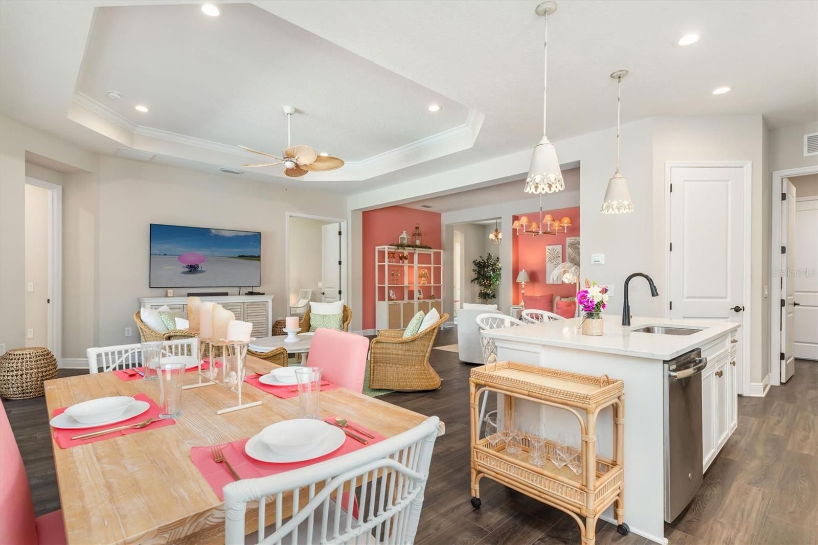 - Built-in Features, Ceiling Fan(s), Coffered Ceiling(s), Eat-in Kitchen, High Ceilings, Kitchen/Family Room Combo, Open Floorplan, Stone Counters, Thermostat, Walk-In Closet(s), Window Treatments