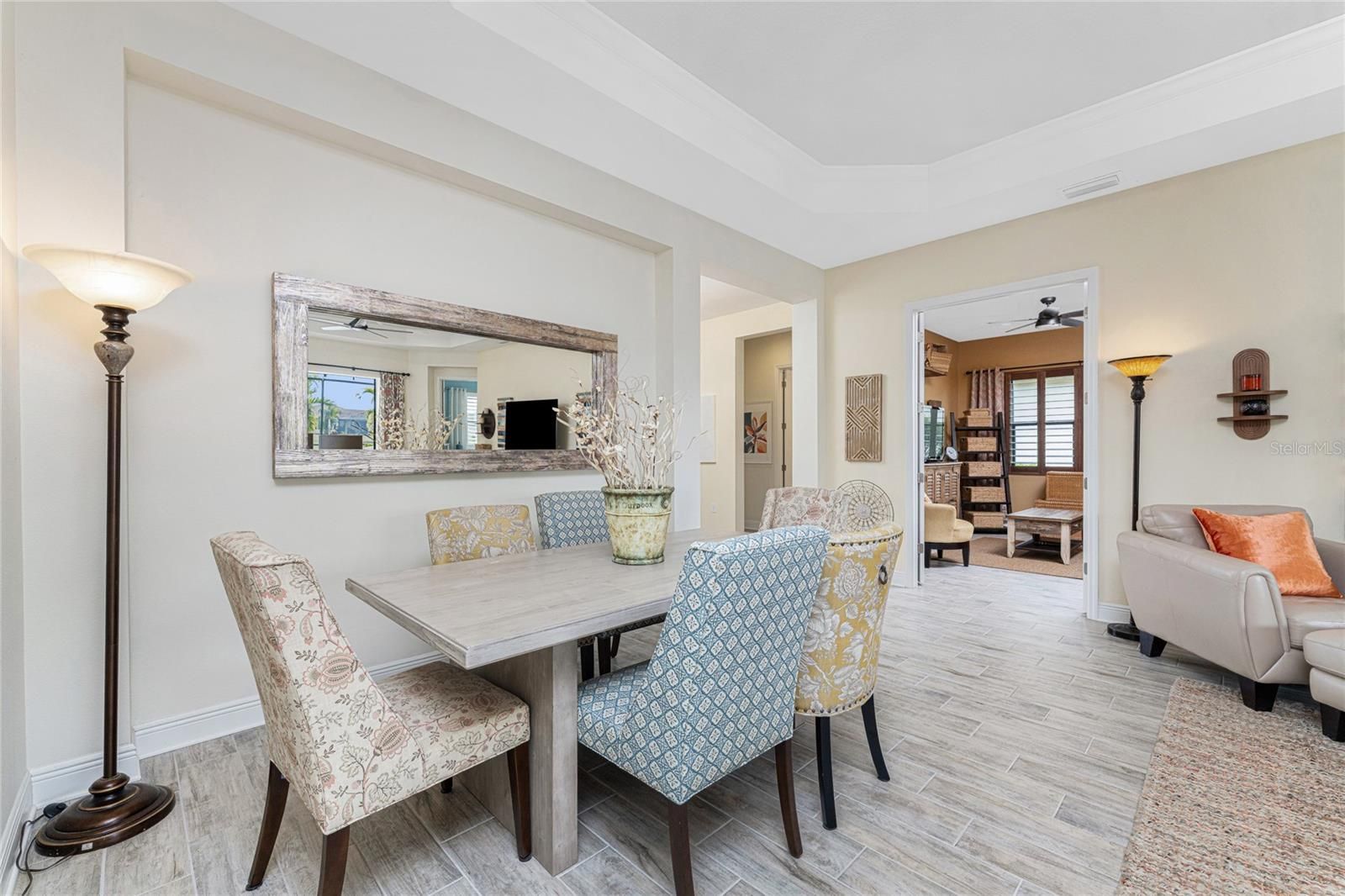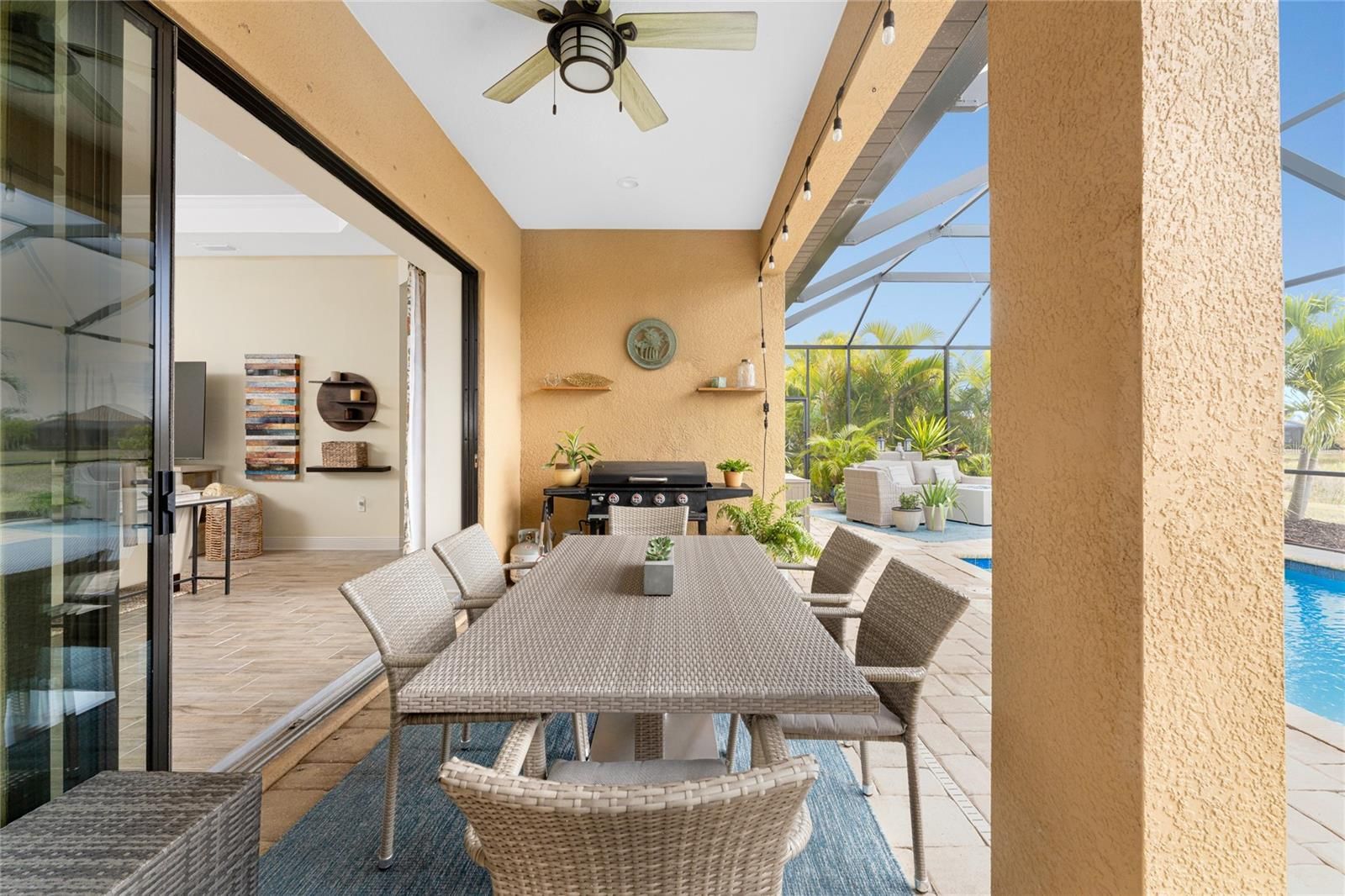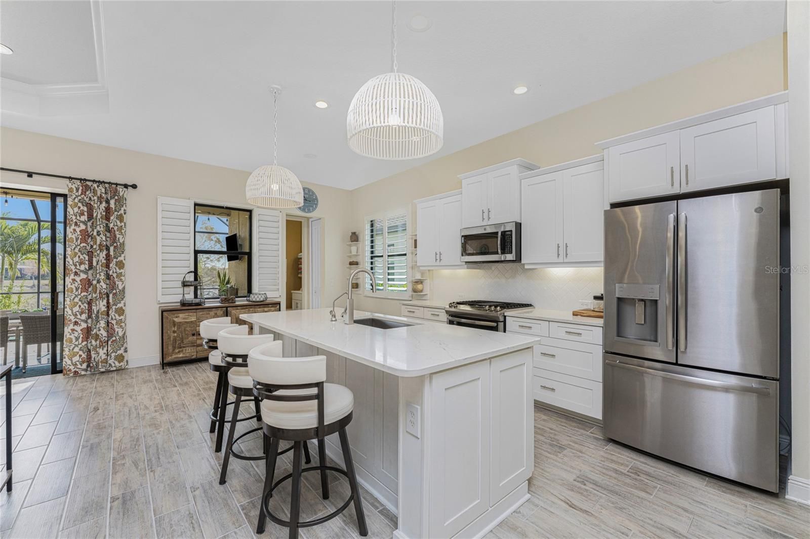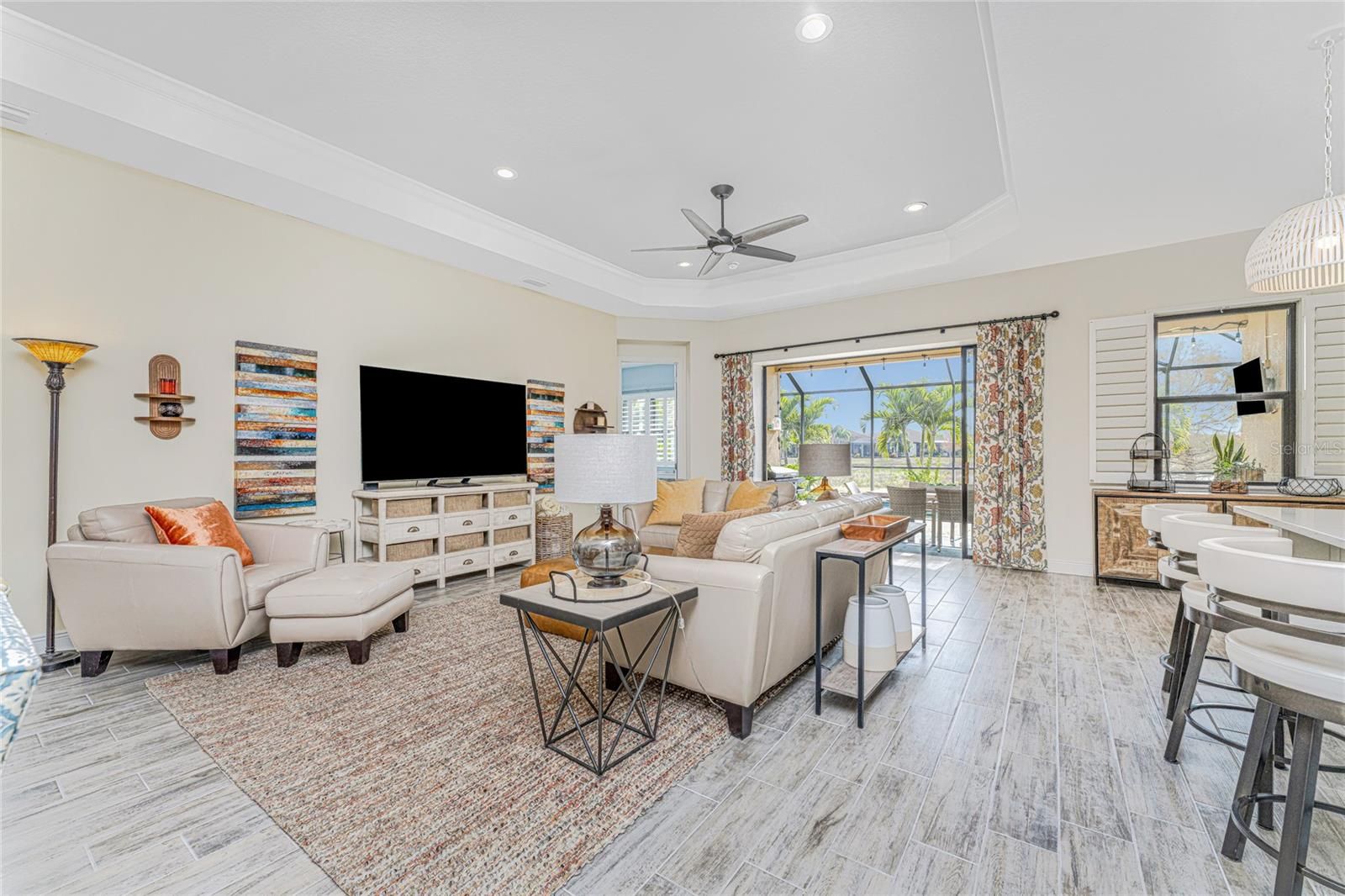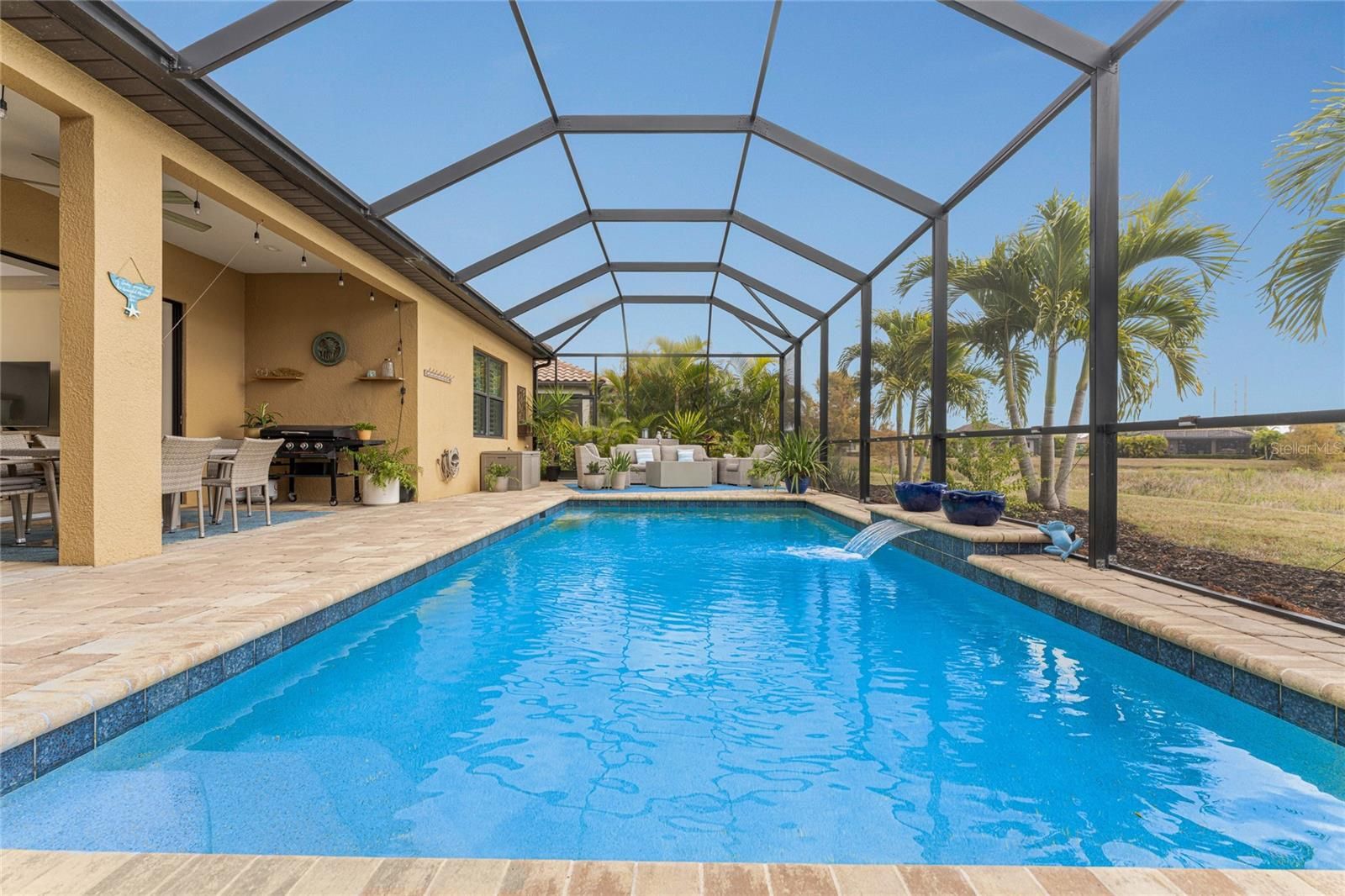 Set within the desirable, gated enclave of Boca Royale, this thoughtfully designed residence is one that truly must be experienced in person to be fully appreciated. Set on a peaceful lake with SUNRISE VIEWS, the home offers a sense of privacy, calm, and understated luxury that unfolds room by room. Upon arrival at 26853 Weiskopf Drive, the care and intention behind every detail are immediately evident with upgraded 8-foot doors, coffered ceilings, pocketing sliding glass doors and porcelain plank tile throughout the main space with a serene color palette and cohesive design flow. The OPEN-CONCEPT GREAT ROOM is designed for easy living and effortless entertaining, anchored by a gourmet kitchen featuring an expansive island, London Sky quartz countertops, stainless steel appliances, a GAS RANGE, and generous dining space. Behind elegant French doors, a FLEXIBLE DEN offers the option of a home office, sitting room, or THIRD BEDROOM when needed. The PRIMARY SUITE is both inviting and refined, showcasing a tray ceiling, abundant natural light, peaceful backyard views, a large walk-in closet, and a spacious ensuite bath with dual vanities, walk-in shower, and private water closet. A well-sized guest bedroom and adjacent guest bath are tucked away down a separate hallway, offering comfort and privacy for visitors. Additional features to note include the interior laundry room, plantation shutters and the desirable POOL BATH. The home’s appeal extends seamlessly outdoors, where the EXTENDED, FULLY SCREENED LANAI captures a rare and picturesque blend of lake and marshland views—an ever-changing natural backdrop with birds wading and gliding through the landscape. Ample shaded and sunlit seating surrounds the CUSTOM HEATED SALTWATER POOL WITH WATERFALL, creating an ideal setting for both quiet mornings and relaxed gatherings. Whether returning from a round at the 18-hole semi-private golf course, a tennis match, or a day at the nearby beaches, this outdoor space invites you to unwind. Residents also enjoy access to the RESORT-STYLE POOL, CLUBHOUSE, AND HOT TUB, ALL INCLUDED IN THE HOA, ALONG WITH LAWN CARE AND IRRIGATION. Boca Royale Golf & Country Club further enhances the lifestyle with pickleball courts, a fitness center, dog park, and a beautifully renovated full-service clubhouse with restaurant. A home defined by setting, comfort, and thoughtful design—this is one best appreciated in person. PEACE OF MIND comes with the concrete tile roof, whole home hurricane protection, all new insulation and X FLOOD ZONE! FURNISHINGS NEGOTIABLE.