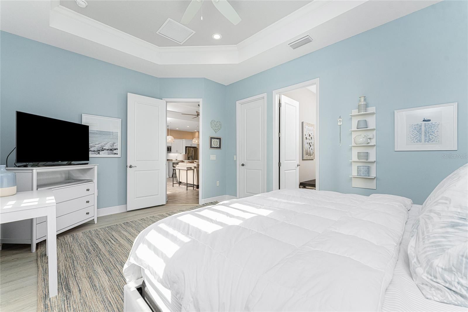 - Ceiling Fan(s), Eat-in Kitchen, High Ceilings, Open Floorplan, Main Level Primary, Solid-Wood Cabinets, Split Bedrooms, Stone Counters, Thermostat, Tray Ceiling(s), Walk-In Closet(s), Window Treatments