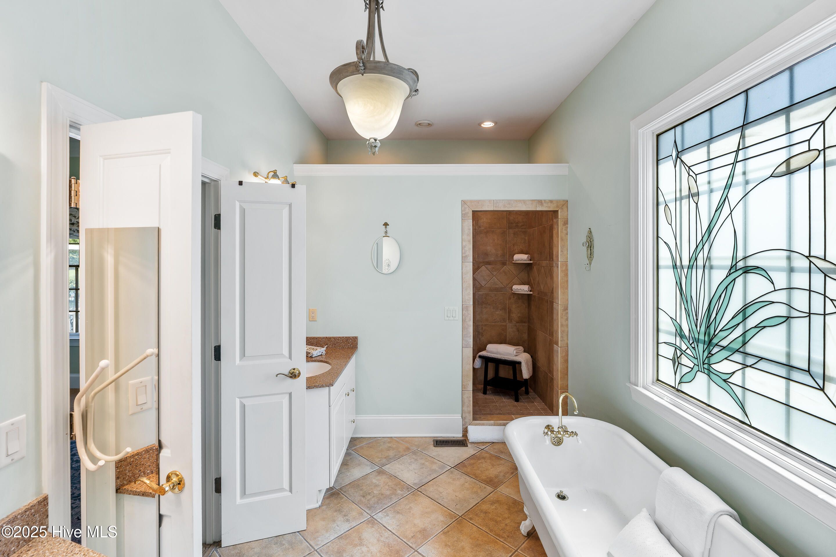 - Master Downstairs, Central Vacuum, Walk-In Closet(s), High Ceilings, Entrance Foyer, Mud Room, Solid Surface Counters, Bookcases, Kitchen Island, Suite, Ceiling Fan(s), Furnished, Pantry, Walk-In Shower, Blinds, Separate/Formal Dining Room