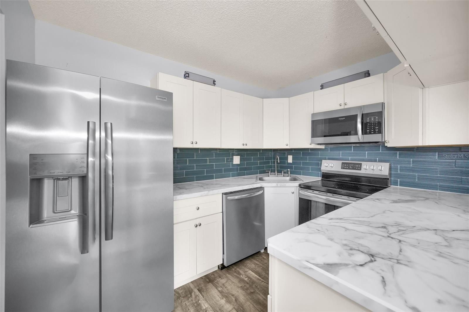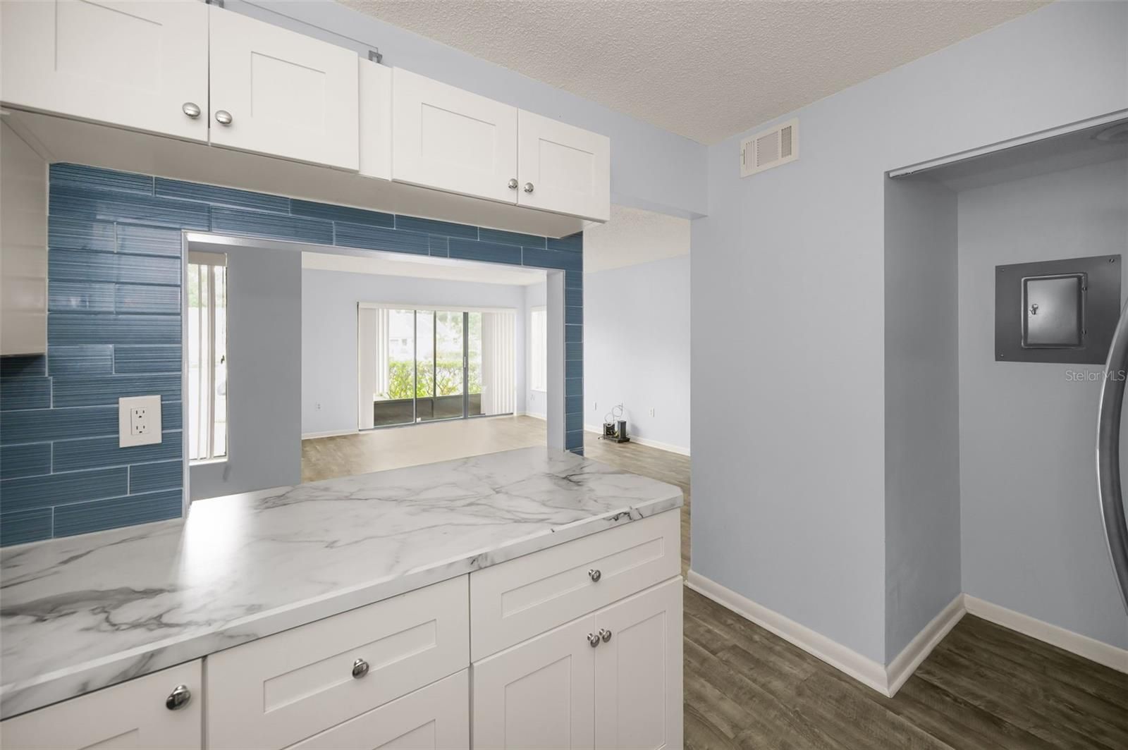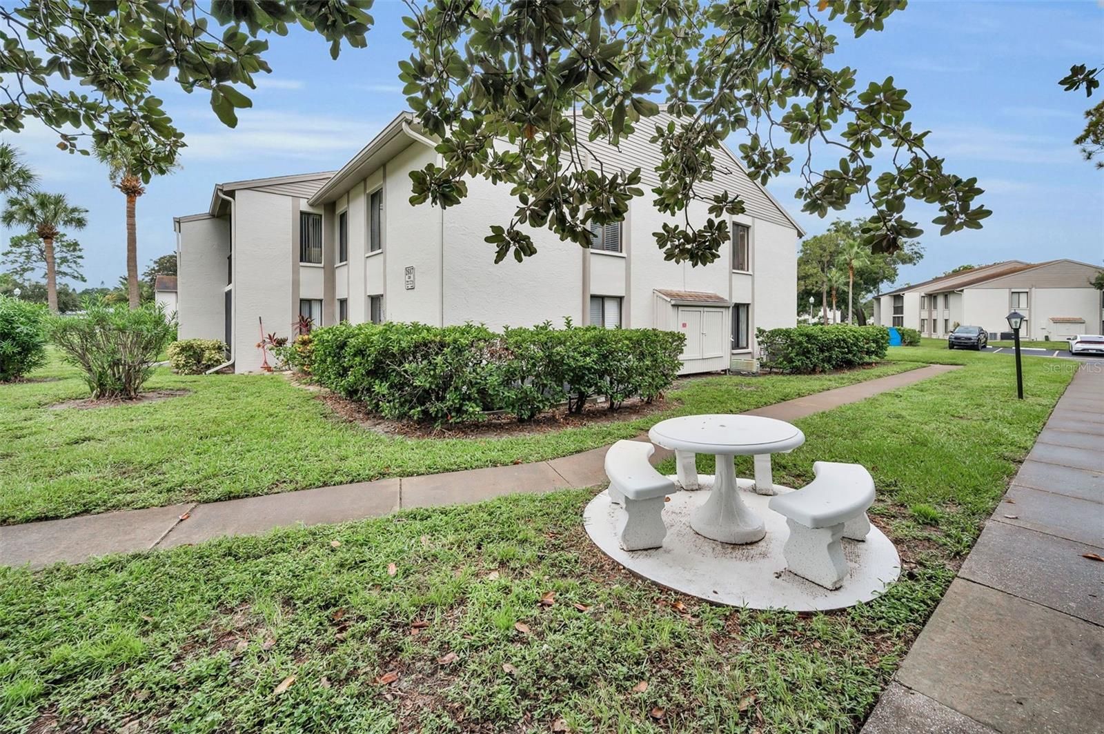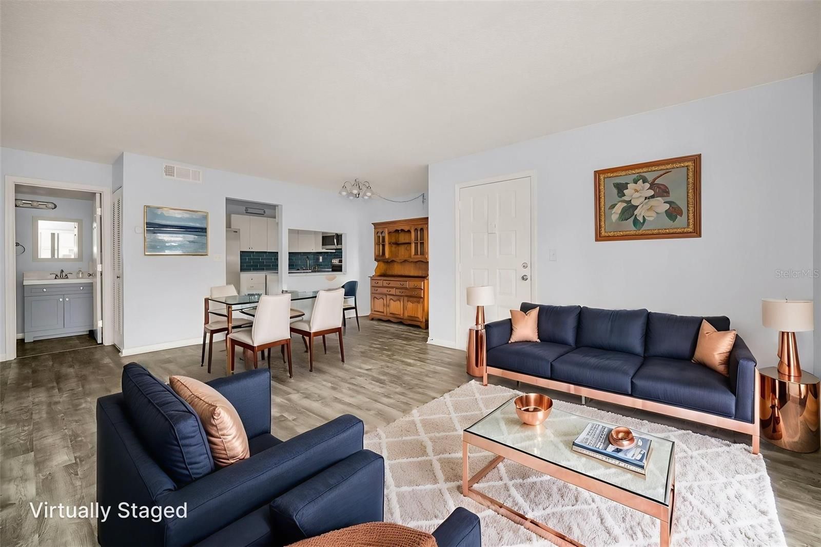 One or more photo(s) has been virtually staged. Welcome to this beautifully maintained one-bedroom, one-bathroom condominium located in the desirable Pine Ridge at Palm Harbor—a pet-friendly retirement community offering comfort, convenience, and a vibrant lifestyle. This move-in-ready residence exudes modern elegance and is privately situated at the rear of the complex, showcasing true pride of ownership. For use as your primary residence, vacation home or investment property with no wait-time to rent! The interior features luxury vinyl plank flooring throughout, creating a seamless and stylish look. The kitchen is a dream with solid Shaker style cabinetry, glass tiled backsplash and newer appliances. The well-designed bathroom offers dual access from both the hallway and the spacious primary bedroom, which also includes a generous walk-in closet. The living room has a slider door to a quaint patio, covered and screened. A Newer HVAC system (2024) and hot water heater for your peace of mind. 805 sqft. includes the covered patio. Low HOA fees (334.06) include: roof, cable, internet, sewer, trash, water, external pest control, external maintenance, Heated Pool and Spa, Shuffleboard court, Clubhouse, walking trails and an on-site manager. Pine Ridge is a great location near restaurants, shopping, medical and dental facilities, beaches, Honeymoon Island and more! All room dimensions approximate. Call today for your in-person or live virtual tour today!
