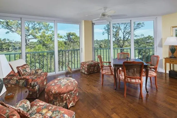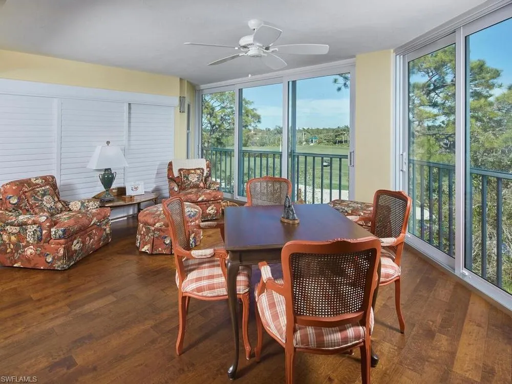 This exquisite condo is nestled in the prestigious community of Wedgewood at Bonita Bay, offering a luxurious and tranquil lifestyle. Step inside and be greeted by the warmth of engineered wood floors that flow seamlessly throughout the living spaces. The screen door entry foyer provides an added layer of privacy and through breezes. Plantation shutters adorn the windows, allowing for perfect control of natural light. The primary bedroom is a true retreat, featuring a convenient built-in desk for a home office nook, large picturesque windows that frame stunning views, and thoughtfully designed closet built-ins for ample storage. The en-suite primary bathroom boasts dual sinks with a vanity, custom cabinetry for extra storage and shower. The guest bathroom is located conveniently to guest bedrooms for easy access. This condo has been cleverly designed to offer a true 3-bedroom layout, maximizing space and versatility. In 2017, the home underwent a remarkable remodel, updating the kitchen and bathrooms with elegant granite countertops and modern stainless steel appliances. The air conditioning system was also replaced in 2017. The laundry room has been reimagined with a practical laundry sink, generous cabinetry, and a full-size washer and dryer. Enjoy breathtaking views from the impact resistant glassed-in lanai, allowing for an abundance of natural light to fill the space. The condo includes a 2-car garage located under the building, providing secure parking and a storage closet located right out your front door. With its warm and inviting ambiance and a desirable location, its offered unfurnished, allowing you to personalize the space to your taste. Overlooking double fairways and serene lakes, this condo offers an unparalleled living experience! Amenities within Wedgewood are large community pool, spa, grills, and tennis courts to enjoy.
