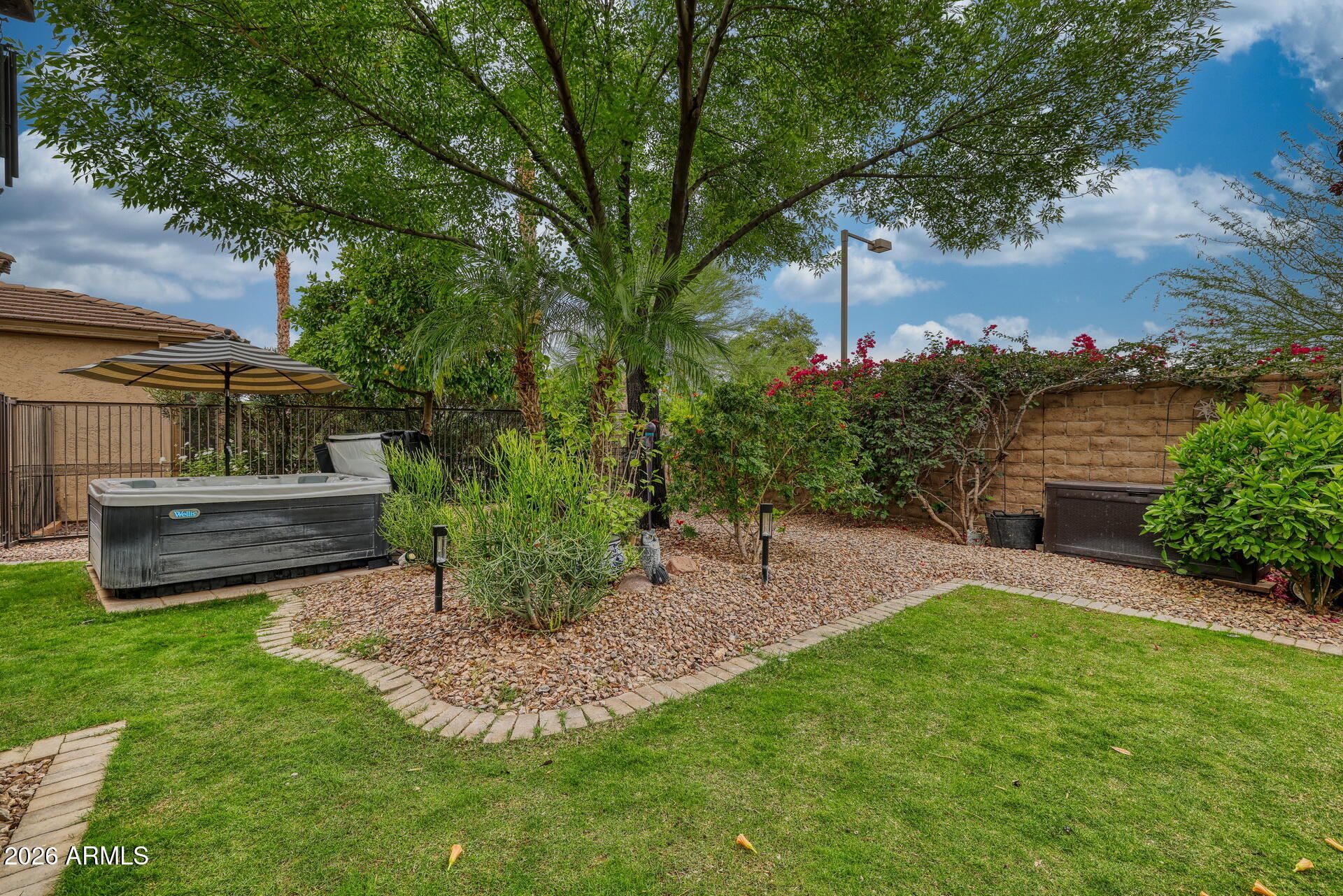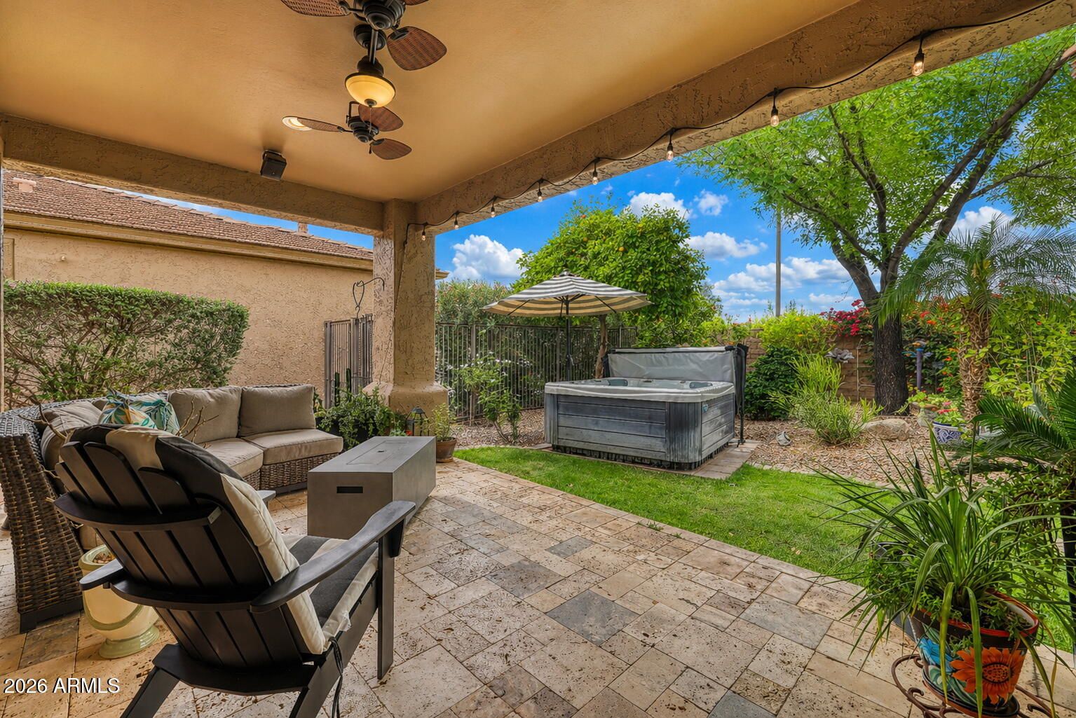'' It's where you belong''. Nestled on this very private lot in one of Peoria's finest neighborhoods, the Award Winning Trilogy at Vistancia Community, this home awaits. Upon arrival, you enter thru a spacious courtyard that features a lighted Pergola, inviting seating that surrounds a cozy firepit. Inside this popular open floor plan, the great room beckons with comfortable seating, a large screen TV, and delightful views of the lush backyard. Adjacent and overlooking, is a chef's delight efficient kitchen with lots of counter space, a serving/prep island, a gas cook-top, a spacious pantry, pull-out drawers, and a breakfast nook that overlooks the lighted front courtyard. The Primary bedroom and adjacent bath is filled with natural light, his and her sinks, a walk-in closet and a large easy entry shower. Down the hall is a Den or possible third bedroom with an upscale sliding closet door. The 2nd bedroom/guest suite is large enough for a queen bed, has an adjacent bath, and offers a private comfy place for those out of town guests The backyard impresses with a travertine tile patio with seating around an inviting firepit overlooking the lush private backyard with a large shade tree, an ever-producing grapefruit tree, colorful blossoming plants, and a bubbling hot tub for your evening stargazing and relaxation. The garage has an epoxy floor and sports a convenient laundry sink. All of this in a community that lives and feels like a resort with its abundant green areas, 2 clubhouses, 2 resort-size pools, an indoor lap pool, an award-winning 18-hole golf course, pickleball courts, bocce ball, tennis, a play structure for grandchildren and a multitude of group activities with over 40 active clubs. Trilogy at Vistancia is more than just a place to live; it's the place you have always wanted to be.