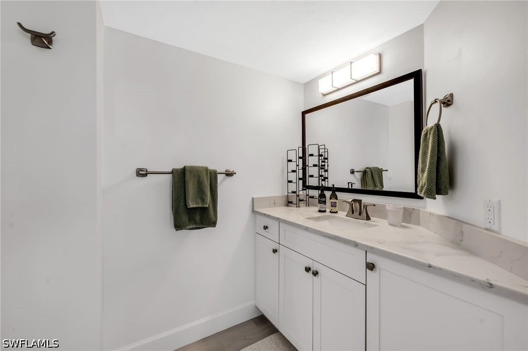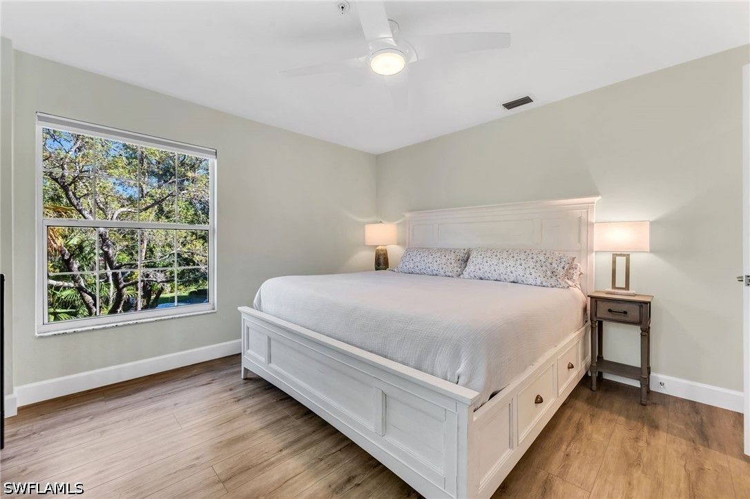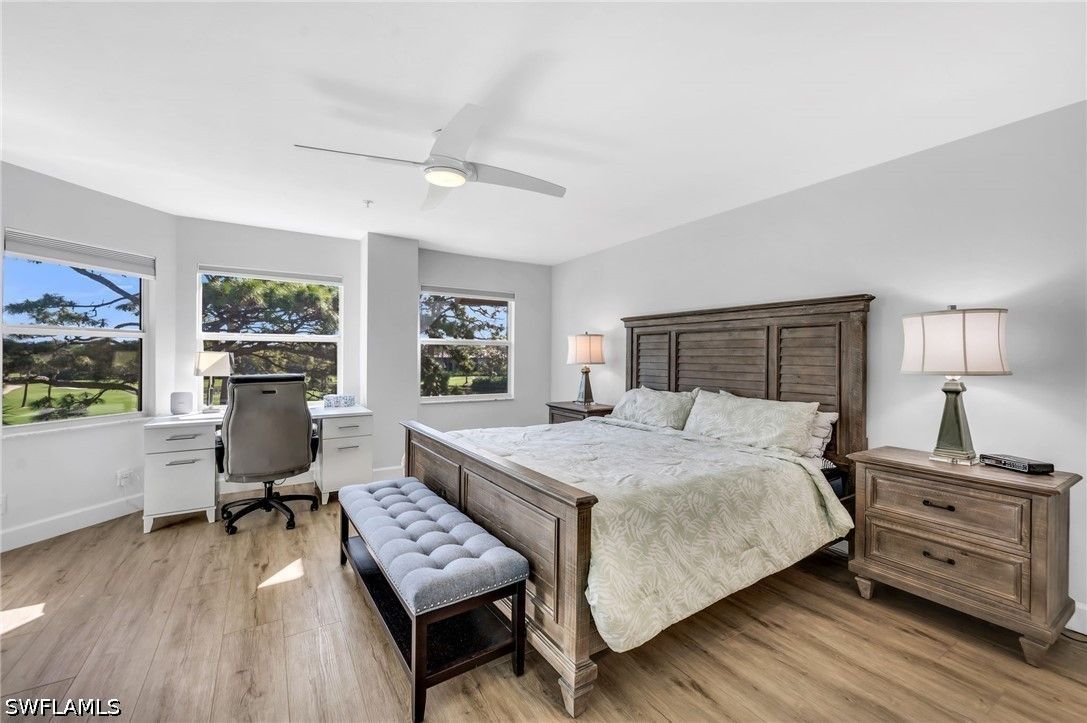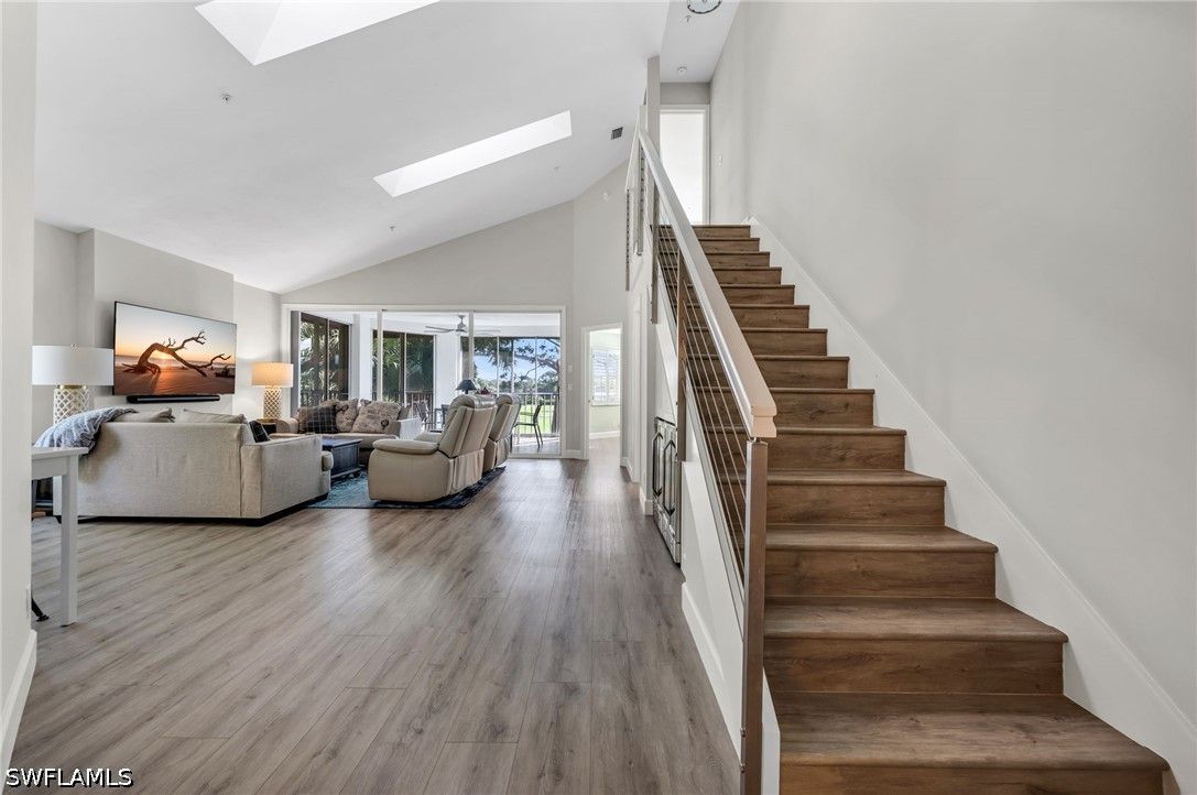 Unique and rarely available floorplan in Wedgewood in Bonita Bay. True four bedrooms, each with ensuite bath and custom closet. Soaring ceilings nearly 15 feet high in the main living area add fabulous light and spaciousness. Skylights in high ceiling add great light. No residence above you so very quiet. End unit with an extra wall of windows not found in interior units. Completely remodeled where almost everything was replaced. All kitchen and laundry cabinets replaced, all bath vanities replaced, white quartz countertops in kitchen and all vanities. All floors replaced, all appliances replaced (all LG), all plumbing toilets and faucets replaced, new doors, new closet doors, custom closets. Wonderful laundry room w/big LG washer/dryer and laundry sink and pullout pantry. Additionally, the property comes with an enclosed 2 car garage that did not flood. It also has a storage closet on the walkway outside the front door and another private closet on the 4th floor with HVAC and extra space. Oversized primary bedroom with desk overlooking the golf course. Incredible walk-in shower in primary bath. All tempered glass shower stalls and doors. Huge walk in shower in bath 2 as well. Take the steps or use the elevator up to the third floor. The lanai is screened-in, and glass enclosed and stays perfectly warm or cool during all seasons. The view is overlooking 2 golf fairways and a lake. Extremely quiet, “tucked away” location in Wedgewood. Huge Wedgewood pool is steps away. Wedgewood also has 2 tennis courts for residents of Wedgewood. The bus stop to the beach is right at the front entrance to Wedgewood. Incredible value for a remodeled 4-bedroom and 4-bath in Bonita Bay. Great location 1 stop sign from the gate. Sold turnkey furnished.